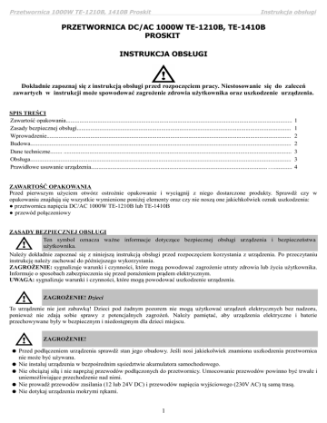 Przetwornica 1000W TE-1210B, 1410B Proskit Instrukcja obsługi PRZETWORNICA DC/AC 1000W TE-1210B, TE-1410B PROSKIT INSTRUKCJA OBSŁUGI Dokładnie zapoznaj się z instrukcją obsługi przed rozpoczęciem pracy. Niestosowanie się do zaleceń zawartych w instrukcji może spowodować zagrożenie zdrowia użytkownika oraz uszkodzenie urządzenia. SPIS TREŚCI Zawartość opakowania...................................................................................................................................................... Zasady bezpiecznej obsługi.............................................................................................................................................. Wprowadzenie.................................................................................................................................................................. Budowa............................................................................................................................................................................. Dane techniczne........ ....................................................................................................................................................... Obsługa............................................................................................................................................................................. Prawidłowe usuwanie urządzenia..................................................................................................................... …............ 1 1 2 2 3 3 4 ZAWARTOŚĆ OPAKOWANIA Przed pierwszym użyciem otwórz ostrożnie opakowanie i wyciągnij z niego dostarczone produkty. Sprawdź czy w opakowaniu znajdują się wszystkie wymienione poniżej elementy oraz czy nie noszą one jakichkolwiek oznak uszkodzenia: ● przetwornica napięcia DC/AC 1000W TE-1210B lub TE-1410B ● przewód połączeniowy ZASADY BEZPIECZNEJ OBSŁUGI Ten symbol oznacza ważne informacje dotyczące bezpiecznej obsługi urządzenia i bezpieczeństwa użytkownika. Należy dokładnie zapoznać się z niniejszą instrukcją obsługi przed rozpoczęciem korzystania z urządzenia. Po przeczytaniu instrukcję należy zachować do późniejszego wykorzystania. ZAGROŻENIE: sygnalizuje warunki i czynności, które mogą powodować zagrożenie utraty zdrowia lub życia użytkownika. Informuje o sposobach zabezpieczenia się przed porażeniem prądem elektrycznym. UWAGA: sygnalizuje warunki i czynności, które mogą powodować uszkodzenie urządzenia. ZAGROŻENIE! Dzieci To urządzenie nie jest zabawką! Dzieci pod żadnym pozorem nie mogą użytkować urządzeń elektrycznych bez nadzoru, ponieważ nie zdają sobie sprawy z potencjalnych zagrożeń. Należy pamiętać, aby urządzenia elektryczne i baterie przechowywane były w bezpiecznym i niedostępnym dla dzieci miejscu. ZAGROŻENIE! ● Przed podłączeniem urządzenia sprawdź stan jego obudowy. Jeśli nosi jakiekolwiek znamiona uszkodzenia przetwornica nie może być używana. ● Nie instaluj urządzenia w bezpośrednim sąsiedztwie akumulatora samochodowego. ● Nie obciążaj siłą i nie naprężaj przewodów podłączonych do przetwornicy. Umocowanie przewodów powinno być trwałe i uniemożliwiające przechodzenie nad nimi. ● Nie prowadź przewodów zasilania (12 lub 24V DC) i przewodów napięcia wyjściowego (230V AC) tą samą trasą. ● Nie dotykaj urządzenia mokrymi rękami. 1 Przetwornica 1000W TE-1210B, 1410B Proskit Instrukcja obsługi ● Urządzenie przeznaczone jest do pracy tylko wewnątrz suchych pomieszczeń. ● Osoba podłączająca przetwornicę powinna być wypoczęta i świadoma podejmowanych działań. ● Niedopuszczalna jest praca pod wpływem alkoholu lub środków odurzających. Moment nierozwagi może doprowadzić do bardzo poważnych konsekwencji włączając w to także obrażenia lub zranienia. ● Nie używaj urządzenia w środowisku wybuchowym (gazy, opary). ● Nie pozostawiaj urządzenia bez nadzoru. ● Wszelkie naprawy może wykonywać tylko wykwalifikowany personel. ● Niedopuszczalne są jakiekolwiek modyfikacje urządzenia. UWAGA! ● Nie wystawiaj urządzenia na bezpośrednie działanie źródeł ciepła (również promieniowania słonecznego). ● Zapewnij swobodny przepływ powietrza wokół urządzenia. ● Po podłączeniu dowolnego odbiornika do przetwornicy zawsze najpierw uruchamiaj przetwornicę, a dopiero potem odbiornik. ● Nigdy nie używaj przetwornicy do zasilania lamp fluorescencyjnych (popularnych „świetlówek”). ● Nie podłączaj do przetwornicy urządzeń wyposażonych w transformatory lub silniki indukcyjne takich jak: elektronarzędzia, sprzęt AGD, zasilacze transformatorowe, pompy itp. ● Nie podłączaj do wyjścia przetwornicy obciążenia większego, niż dopuszczalne dla pracy ciągłej. Przeciążenie może spowodować uszkodzenie urządzenia. WPROWADZENIE Przetwornice TE-1210B oraz TE-1410B przeznaczone są do zasilania z akumulatorów o napięciu stałym 12V (TE-1210B) lub 24V (TE-1410B) urządzeń elektrycznych wymagających napięcia przemiennego 230V. Dzięki nowoczesnej konstrukcji i wykorzystaniu mikroprocesorów przetwornice serii TE to urządzenia charakteryzujące się wysoką sprawnością i długą, bezawaryjną pracą. Doskonale sprawdzają się w miejscach gdzie nie ma możliwości bezpośredniego podłączenia do sieci energetycznej. Przetwornice TE-1210B oraz TE-1410B wytwarzają na wyjściu tzw. sinusoidę modyfikowaną: Jest to napięcie przemienne o przebiegu prostokątnym, którego wartość skuteczna jest identyczna, jak wartość skuteczna przebiegu sinusoidalnego występującego w sieci energetycznej. Dzięki zastosowaniu takiej metody generowania napięcia, możliwe jest znaczne ograniczenie ceny i zwiększenie bezawaryjności całego urządzenia. ZAGROŻENIE! Należy pamiętać, że do kontroli napięcia wyjściowego generowanego przez przetwornic