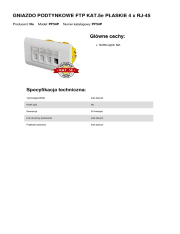 GNIAZDO PODTYNKOWE FTP KAT.5e PŁASKIE 4 x RJ-45 Producent: No Model: PF54P Numer katalogowy: PF54P Główne cechy: Krótki opis: No Specyfikacja techniczna: Technologia WDM brak danych Krótki opis No Gwarancja 24 miesiące Link do strony producenta brak danych Prędkość transmisji brak danych