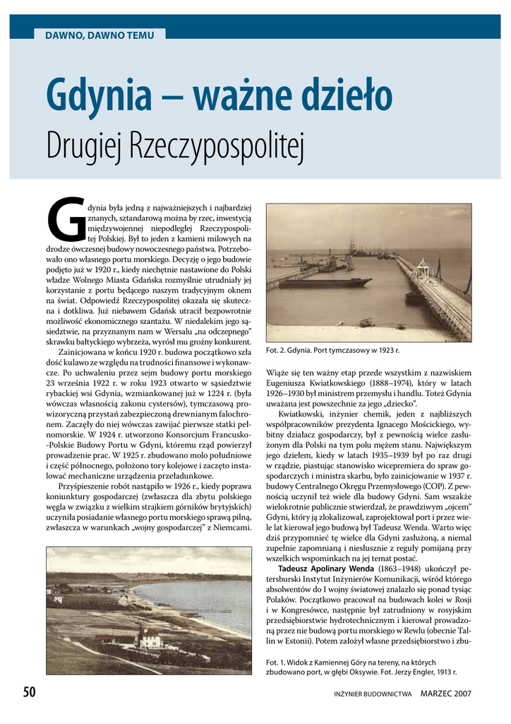 DAWNO, DAWNO TEMU Gdynia – ważne dzieło Drugiej Rzeczypospolitej G dynia była jedną z najważniejszych i najbardziej znanych, sztandarową można by rzec, inwestycją międzywojennej niepodległej Rzeczypospolitej Polskiej. Był to jeden z kamieni milowych na drodze ówczesnej budowy nowoczesnego państwa. Potrzebowało ono własnego portu morskiego. Decyzję o jego budowie podjęto już w 1920 r., kiedy niechętnie nastawione do Polski władze Wolnego Miasta Gdańska rozmyślnie utrudniały jej korzystanie z portu będącego naszym tradycyjnym oknem na świat. Odpowiedź Rzeczypospolitej okazała się skuteczna i dotkliwa. Już niebawem Gdańsk utracił bezpowrotnie możliwość ekonomicznego szantażu. W niedalekim jego sąsiedztwie, na przyznanym nam w Wersalu „na odczepnego” skrawku bałtyckiego wybrzeża, wyrósł mu groźny konkurent. Zainicjowana w końcu 1920 r. budowa początkowo szła dość kulawo ze względu na trudności finansowe i wykonawcze. Po uchwaleniu przez sejm budowy portu morskiego 23 września 1922 r. w roku 1923 otwarto w sąsiedztwie rybackiej wsi Gdynia, wzmiankowanej już w 1224 r. (była wówczas własnością zakonu cystersów), tymczasową prowizoryczną przystań zabezpieczoną drewnianym falochronem. Zaczęły do niej wówczas zawijać pierwsze statki pełnomorskie. W 1924 r. utworzono Konsorcjum Francusko-Polskie Budowy Portu w Gdyni, któremu rząd powierzył prowadzenie prac. W 1925 r. zbudowano molo południowe i część północnego, położono tory kolejowe i zaczęto instalować mechaniczne urządzenia przeładunkowe. Przyśpieszenie robót nastąpiło w 1926 r., kiedy poprawa koniunktury gospodarczej (zwłaszcza dla zbytu polskiego węgla w związku z wielkim strajkiem górników brytyjskich) uczyniła posiadanie własnego portu morskiego sprawą pilną, zwłaszcza w warunkach „wojny gospodarczej” z Niemcami. Fot. 2. Gdynia. Port tymczasowy w 1923 r. Wiąże się ten ważny etap przede wszystkim z nazwiskiem Eugeniusza Kwiatkowskiego (1888–1974), który w latach 1926–1930 był ministrem przemysłu i handlu. Toteż Gdynia uważana jest powszechnie za jego „dziecko”. Kwiatkowski, inżynier chemik, jeden z najbliższych współpracowników prezydenta Ignacego Mościckiego, wybitny działacz gospodarczy, był z pewnością wielce zasłużonym dla Polski na tym polu mężem stanu. Największym jego dziełem, kiedy w latach 1935–1939 był po raz drugi w rządzie, piastując stanowisko wicepremiera do spraw gospodarczych i ministra skarbu, było zainicjowanie w 1937 r. budowy Centralnego Okręgu Przemysłowego (COP). Z pewnością uczynił też wiele dla budowy Gdyni. Sam wszakże wielokrotnie publicznie stwierdzał, że prawdziwym „ojcem” Gdyni, który ją zlokalizował, zaprojektował port i przez wiele lat kierował jego budową był Tadeusz Wenda. Warto więc dziś przypomnieć tę wielce dla Gdyni zasłużoną, a niemal zupełnie zapomnianą i niesłusznie z reguły pomijaną przy wszelkich wspominkach na jej temat postać. Tadeusz Apolinary Wenda (1863–1948) ukończył petersburski Instytut Inżynierów Komunikacji, wśród którego absolwentów do I wojny światowej znalazło się ponad tysiąc Polaków. Początkowo pracował na budowach kolei w Rosji i w Kongresówce, następnie był zatrudniony w rosyjskim przedsiębiorstwie hydrotechnicznym i kierował prowadzoną przez nie budową portu morskiego w Rewlu (obecnie Tallin w Estonii). Potem założył własne przedsiębiorstwo i zbuFot. 1. Widok z Kamiennej Góry na tereny, na których zbudowano port, w głębi Oksywie. Fot. Jerzy Engler, 1913 r. 50 INŻYNIER BUDOWNICTWA MARZEC 2007 DAWNO, DAWNO TEMU Fot. 3. Projektant i budowniczy portu w Gdyni inż. Tadeusz Wenda. Fot. z 1919 r. dował przystań morską w Royen na Łotwie. Wrócił do kraju i w latach 1915–1916 pracował społecznie w Komitecie Obywatelskim miasta Warszawy. W 1918 r. uczestniczył w komisji organizującej zarząd dróg wodnych w Polsce. Pracując w Ministerstwie Robót Publicznych prowadził badania portowe. Przypuszczano wówczas, że Gdańsk będzie należał do Polski, Wenda opracował więc projekt rozbudowy portu w tym mieście. Badał możliwości zbudowania portu morskiego w Tczewie, oceniając je negatywnie, co przedstawił w publikacji „W sprawie wyboru miejsca pod budowę portu morskiego”. W maju 1920 r. problematyka ta przeniesiona została do Ministerstwa Spraw Wojskowych, gdzie Wenda został kierownikiem wydziału budowy portów. W tymże miesiącu przeprowadził studia terenowe na wybrzeżu bałtyckim i osobiście dokonał wyboru miejsca pod przyszły port w Gdyni w dolinie rzeczki Chylonki, pomiędzy Kępą Oksywską a Kamienna Górą. Oddelegowany w październiku 1920 r. do dyspozycji przedstawiciela do spraw morskich przy Generalnym Komisarzu Rzeczypospolitej w Wolnym Mieście Gdańsku, został naczelnikiem budowy portu gdyńskiego, którą rozpoczął w końcu 1920 r. Roboty prowadzono początkowo sposobem gospodarczym według projektu Wendy i pod jego bezpośrednim kierownictwem. 13 sierpnia 1923 r. wpłynął do portu gdyńskiego pierwszy statek zagraniczny „Kentucky” pod banderą francuską. Kiedy w 1924 r. rząd powierzył budowę portu wspomnianemu wyżej francusko-polskiemu konsorcjum z udziałem firm duńskiej i belgijskiej, Wenda staną na czele zarządu tej budowy, gdzie pod jego kierownictwem opracowywano dalsze związane z nią projekty oraz nadzorowano ich wykonanie. Nadal kierując budową, od 1932 r. był też Wenda naczelnikiem wydziału techniczno-budowlanego Urzędu Morskiego w Gdyni. W 1937 r. przeszedł na emeryturę. Za osiągnięcia zawodowe został odznaczony Krzyżem Oficerskim Orderu Odrodzenia Polski, francuską Legią Honorową i duńskim Orderem Dannebroga. Zmarł w 1948 r. w Komorowie pod Warszawą, został pochowany w Warszawie na Cmentarzu Powązkowskim. Uznana przez władze polskie za priorytetową budowa portu w Gdyni przebiegała szybko 