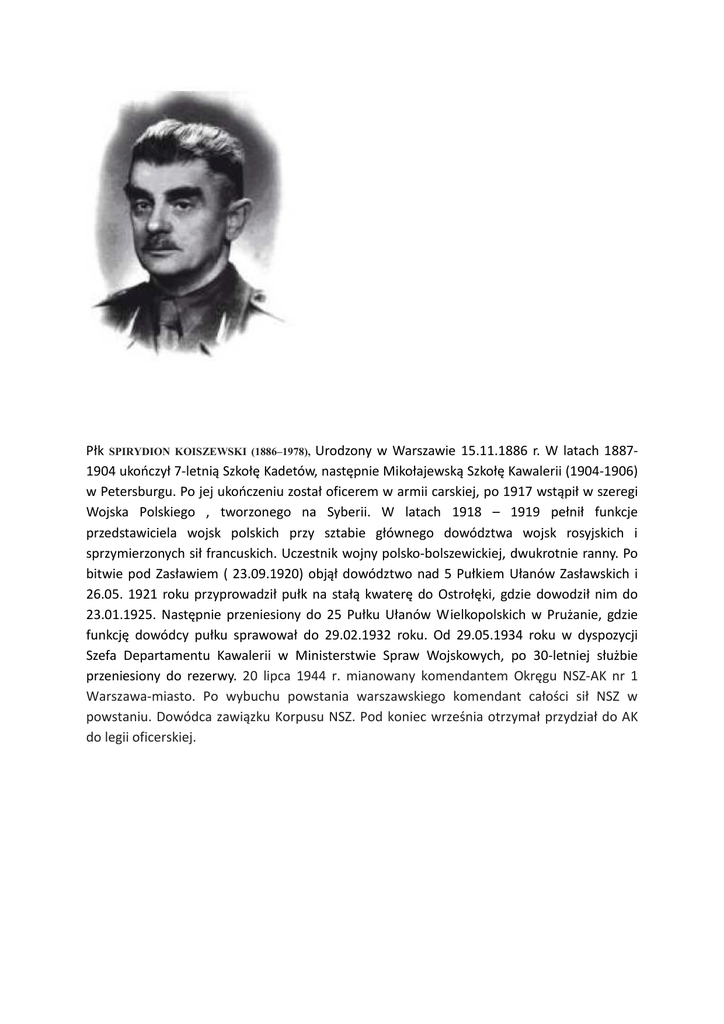 Płk SPIRYDION KOISZEWSKI (1886–1978), Urodzony w Warszawie 15.11.1886 r. W latach 18871904 ukończył 7-letnią Szkołę Kadetów, następnie Mikołajewską Szkołę Kawalerii (1904-1906) w Petersburgu. Po jej ukończeniu został oficerem w armii carskiej, po 1917 wstąpił w szeregi Wojska Polskiego , tworzonego na Syberii. W latach 1918 – 1919 pełnił funkcje przedstawiciela wojsk polskich przy sztabie głównego dowództwa wojsk rosyjskich i sprzymierzonych sił francuskich. Uczestnik wojny polsko-bolszewickiej, dwukrotnie ranny. Po bitwie pod Zasławiem ( 23.09.1920) objął dowództwo nad 5 Pułkiem Ułanów Zasławskich i 26.05. 1921 roku przyprowadził pułk na stałą kwaterę do Ostrołęki, gdzie dowodził nim do 23.01.1925. Następnie przeniesiony do 25 Pułku Ułanów Wielkopolskich w Prużanie, gdzie funkcję dowódcy pułku sprawował do 29.02.1932 roku. Od 29.05.1934 roku w dyspozycji Szefa Departamentu Kawalerii w Ministerstwie Spraw Wojskowych, po 30-letniej służbie przeniesiony do rezerwy. 20 lipca 1944 r. mianowany komendantem Okręgu NSZ-AK nr 1 Warszawa-miasto. Po wybuchu powstania warszawskiego komendant całości sił NSZ w powstaniu. Dowódca zawiązku Korpusu NSZ. Pod koniec września otrzymał przydział do AK do legii oficerskiej.