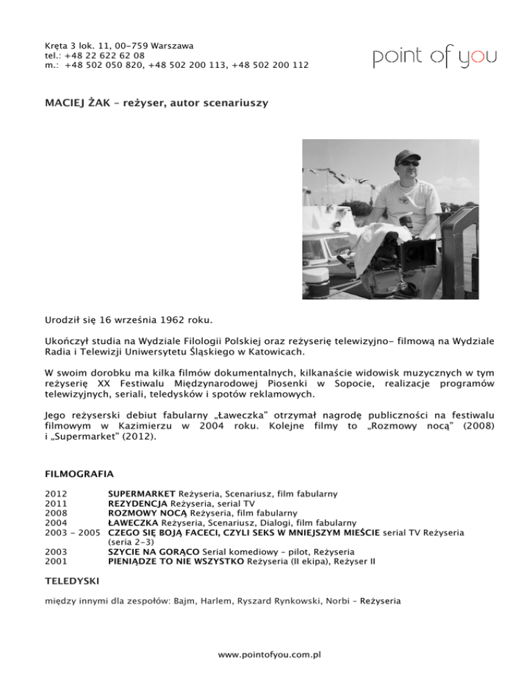 Kręta 3 lok. 11, 00-759 Warszawa tel.: +48 22 622 62 08 m.: +48 502 050 820, +48 502 200 113, +48 502 200 112 MACIEJ ŻAK – reżyser, autor scenariuszy Urodził się 16 września 1962 roku. Ukończył studia na Wydziale Filologii Polskiej oraz reżyserię telewizyjno- filmową na Wydziale Radia i Telewizji Uniwersytetu Śląskiego w Katowicach. W swoim dorobku ma kilka filmów dokumentalnych, kilkanaście widowisk muzycznych w tym reżyserię XX Festiwalu Międzynarodowej Piosenki w Sopocie, realizacje programów telewizyjnych, seriali, teledysków i spotów reklamowych. Jego reżyserski debiut fabularny „Ławeczka” otrzymał nagrodę publiczności na festiwalu filmowym w Kazimierzu w 2004 roku. Kolejne filmy to „Rozmowy nocą” (2008) i „Supermarket” (2012). FILMOGRAFIA 2012 2011 2008 2004 2003 - 2005 2003 2001 SUPERMARKET Reżyseria, Scenariusz, film fabularny REZYDENCJA Reżyseria, serial TV ROZMOWY NOCĄ Reżyseria, film fabularny ŁAWECZKA Reżyseria, Scenariusz, Dialogi, film fabularny CZEGO SIĘ BOJĄ FACECI, CZYLI SEKS W MNIEJSZYM MIEŚCIE serial TV Reżyseria (seria 2-3) SZYCIE NA GORĄCO Serial komediowy – pilot, Reżyseria PIENIĄDZE TO NIE WSZYSTKO Reżyseria (II ekipa), Reżyser II TELEDYSKI między innymi dla zespołów: Bajm, Harlem, Ryszard Rynkowski, Norbi – Reżyseria www.pointofyou.com.pl WIDOWISKA MUZYCZNE/ PROGRAMY TV KOMISARZ KROMER HANGAR ZWYCZAJNI NIEZWYCZAJNI NIE MA SIĘ Z CZEGO ŚMIAĆ XX Festiwal Międzynarodowej Piosenki w Sopocie FATALNE JAJA mini-serial komediowy - Reżyseria koncert zespołu brytyjskiego Stranglove - Reżyseria program społeczny - Reżyseria program rozrywkowy - Reżyseria reżyseria widowisko teatralne na podstawie powieści M. Bułhakowa reżyseria FILMY DOKUMENTALNE MĄDZIK MOLO NARTY film dokumentalny o teatrze Scena Plastyczna KUL w Lublinie reżyseria film dokumentalny o festiwalu piosenki w Sopocie - reżyseria film dokumentalny o narciarskim szaleństwie w Polsce - reżyseria NAGRODY I WYRÓŻNIENIA 2012 SUPERMARKET • 49. International Antalya Golden Orange Film Festival - nagroda dla najlepszego aktora – Mariana Dziędziela • Festiwal Polskich Filmów Fabularnych w Gdyni - konkurs główny • Plus Camerimage - Konkurs Filmów Polskich i Konkurs Debiutów Operatorskich 2008 ROZMOWY NOCĄ • Bilet, Nagroda Stowarzyszenia "Kina Polskie" Srebrny Bilet 2004 ŁAWECZKA • Kazimierz Dolny (Lato Filmowe) nagroda publiczności w kategorii: najlepszy film polski 1999 ZŁOTY ORZEŁ w kategorii reklama filmowa - rozrywka za film pt. „Zenek” dla firmy Reflex. www.pointofyou.com.pl