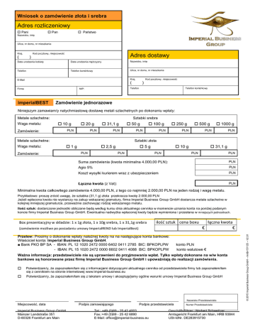 Wniosek o zamówienie złota i srebra Adres rozliczeniowy Pani Pan Państwo Nazwisko, imię Ulica, nr domu, nr mieszkania Kraj, ( Kod pocztowy, miejscowość Adres dostawy ) Data urodzenia kobiety Data urodzenia mężczyzny Nazwisko, imię Telefon Telefon komórkowy Ulica, nr domu, nr mieszkania Kraj, E-Mail Kod pocztowy, miejscowość ( Firma Telefon NIP: imperialBEST ) Telefon komórkowy Zamówienie jednorazowe Niniejszym zamawiam/y natychmiastową dostawę metali szlachetnych po dokonaniu wpłaty: Metale szlachetne: Waga metalu: Sztabki srebra 10 g Zamówienie: 20 g PLN 31,1 g PLN PLN Metale szlachetne: Waga metalu: Zamówienie: 50 g 100 g PLN 250 g PLN 500 g PLN 1000 g PLN PLN Sztabki złota 1g 2,5 g PLN 5g PLN 10 g PLN 31,1 g PLN PLN PLN Suma zamówienia (kwota minimalna 4.000,00 PLN): Agio 5% PLN Koszt wysyłki kurierem wraz z ubezpieczeniem PLN Łączna kwota (z Vat): PLN Minimalna kwota całkowitego zamówienia 4.000,00 PLN, z tego co najmniej 2.000,00 PLN na jeden rodzaj i wagę metalu. Przykładowo: proszę zrócić uwagę, że sztabka (31,1 g) złota przekracza kwotę 2.000,00 PLN Jeżeli wpłacona kwota nie wystarczy na zakup wskazanej gramatury, firma Imperial Business Group GmbH dostarcza metale szlachetne w kolejnej mniejszej gramaturze, przeważnie zachowując rodzaj wskazanego metalu. Ilość sztuk: dostarczone jednostki obliczane będą według kursu dnia aktualnego cennika w momencie uznania konta na poniżej podanym koncie firmy Imperial Business Group GmbH. Ewentualna nadwyżka wpłaconej kwoty będzie wymieniona i przesłana w mniejszych jednostkach. ilość sztuk cena boxu łączna kwota € (zamówienie możliwe po posiadaniu umowy ImperialREND lub ImperialBest) Przelew: Prosimy o dokonanie wpłaty należnej kwoty na na następujące konta bankowe: Właściciel konta: Imperial Business Group GmbH. ■ Bank PKO BP SA - IBAN: PL 12 1020 2472 0000 6402 0411 2785 BIC: BPKOPLPW - IBAN: PL 15 1020 2472 0000 6602 0411 4088 BIC: BPKOPLPW € konto PLN konto walutowe € Ważna informacja: przedstawiciele nie są uprawnieni do przyjmowania wpłat. Tylko wpłaty dokonane na w/w konta bankowe są honorowane przez firmę Imperial Business Group GmbH i upoważniają do realizacji zamówienia. Potwierdzam/y, że zapoznałem/łam się z informacjami dotyczącymi aktualnego cennika od przedstawiciela firmy lub zapoznałem/łam się z cennikiem na stronie internetowej www:imperial-business.eu Potwierdzam/y, że zapoznałem/łam się z tekstem umowy i akceptuję/jemy ogólne warunki umowy Imperial Business Group GmbH Nazwisko Przedstawiciela Miejscowość, data Imperial Business Group GmbH Mainzer Landstraße 351 D-60326 Frankfurt am Main Podpis zamawiającego Podpis przedstawiciela Tel.: +49 (0)69 - 25 42 4003 Fax.:+49 (0)69 - 25 42 6890 E-Mail: [email protected] Numer Przedstawiciela Geschäftsführer : Norbert Schweitzer Amtsgericht Frankfurt am Main, HRB 93844 USt-IdNr. DE283915730 © 2015 Imperial Business Group GmbH – AnIB-151125 – V2.01 Box prezentacyjny w składzie: 1 x 1g złota, 1 x 10g srebra, 1 x 31,1g srebra OGóLNE WARUNKI UMOWY § 1. Zakres Obowiązywania: W stosunkach handlowych między Imperial Buisness Group GmbH a zamawiającym obowiązują wyłącznie poniższe ogólne Warunki Zawierania umowy w wersji obowiązującej w momencie zamówienia. Różniących się warunków przedstawionych przez Zamawiającego Imperial Buisness Grup nie uznaje, chyba, że Imperial Buisness Group GmbH zgodziłaby się wyraźnie na ich obowiązywanie na piśmie. § 2. Obowiązek informowania: Imperial Buisness Group GmbH: ustawowy przedstawiciel: Imperial Buisness Group GmbH – Mainzer Landstr. 351 – 60326 Frankfurt am Main – reprezentowana przez prezesa Pana Norberta Schweitzer Tel.: +49 [0]69 25 42 4002 – Fax.: +49 [0]69 25 42 6890 § 3. Uznanie: Ogólne warunki zawierania umowy spółki Imperial Buisness Group GmbH akceptowane są wyraźnie i uznane wraz z podpisaniem zamówienia. § 4. Zawarcie umowy: Zamówienie stanowi ofertę dla Imperial Buisness Group GmbH do zawarcia umowy kupna. Umowa kupna dochodzi do skutku dopiero wtedy, kiedy płatność za zamówiony towar/ zamówione towary wpłynie na konto Imperial Buisness Group GmbH. Potwierdzenie kupna następuje najpóźniej następnego dnia roboczego e-mailem, drogą pocztową lub faxem. Partnerem umowy jest Imperial Buisness Group GmbH. Imperial Buisness Group GmbH nie oferuje produktów do kupowania przez małoletnich, także nasze produkty dla dzieci mogą być kupione tylko przez osoby pełnoletnie. (Jako pełnoletność uważa się osobę która ukończyła 18 lat) § 5. Brak prawa do odwołania: Według § 312d, ust. 4, cyfra 6 (BGB). nie zachodzi prawo do odwołania, jeżeli przedmiotem dostawy są towary, których cena na rynku finansowym ulega wahaniom, na które przedsiębiorca nie ma wpływu, a które mogą wystąpić w okresie terminu odwołania. § 6. Gwarancja: Imperial Buisness Group GmbH zapewnia fizyczne wydanie sprzedanych metali szlachetnych w danej cenie sprzedaży. Formą i rodzajami metali szlachetnych są powszechne sztabki [czyste złoto to sztabki 1 g, 2,5 g, 5 g. 10 g lub 31,1g, a czyste srebro to sztabki 10 g, 20 g, 31,1 g, 50 g, 100 g, 250 g, 500 g lub 1000 g przy czym możliwe na życzenie są większe jednostki], a odpowiadają one standardom London Good Delivery jak i Dubai Good Delivery. § 7. Płatność: Klient płaci za towar przelewem, ewentualnie stałym poleceniem bankowym. Płatności te muszą być zapisane na dobro rachunku Imperial Buisness Group przez kraj i zagranicę bez opłat i kosztów bankowych. § 8. Zastrzeżenie własności: Imperial Buisness Group GmbH zastrzega sobie prawo własności swojego świadczenia do momentu całkowitego uregulowania płatności towaru. § 9. Ceny i wysyłka: Zaoferowane ceny – aktualne w dany dzień pod www.imperial-business.eu rozumiane są jako ceny brutto łącznie z VAT -em bez ceł, ubezpieczenia i bez kosztów wysyłki. Klient mus