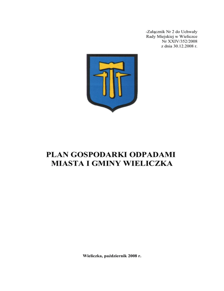 -Załącznik Nr 2 do Uchwały Rady Miejskiej w Wieliczce Nr XXIV/352/2008 z dnia 30.12.2008 r. PLAN GOSPODARKI ODPADAMI MIASTA I GMINY WIELICZKA Wieliczka, październik 2008 r. Wykonawca : Przedsiębiorstwo Usługowe „POŁUDNIE II” sp. z o.o. Zakład Pracy Chronionej Biuro Inżynierii Środowiska i Rozwoju Technologii 31-444 Kraków, ul. Śliczna 34 Zespół autorski: mgr inż. Stanisław Gastoł mgr inż. Agnieszka Dutkiewicz mgr inż. Mariusz Krawczyk SPIS TREŚCI 1. WSTĘP.................................................................................................................................................................5 1.1. PODSTAWA PRAWNA OPRACOWANIA......................................................................................................................5 1.2. WYMAGANIA PRAWNE STAWIANE GMINNYM PLANOM GOSPODARKI ODPADAMI..............................................................5 2. UWARUNKOWANIA WYNIKAJĄCE Z II POLITYKI EKOLOGICZNEJ PAŃSTWA I PLANÓW WYŻSZEGO RZĘDU.............................................................................................................................................7 2.1. PLAN GOSPODARKI ODPADAMI WOJEWÓDZTWA MAŁOPOLSKIEGO 2010 (PGOWM)..............................................12 2.2. POWIATOWY PLAN GOSPODARKI ODPADAMI (PPGO)..........................................................................................22 3. DANE PODSTAWOWE O GMINIE. CHARAKTERYSTYKA GMINY WIELICZKA.........................24 3.1. POŁOŻENIE......................................................................................................................................................25 3.2. LUDNOŚĆ........................................................................................................................................................26 3.3. UŻYTKOWANIE TERENU.....................................................................................................................................26 3.4. ROLNICTWO....................................................................................................................................................27 3.5. RYNEK PRACY.................................................................................................................................................27 3.6. UKSZTAŁTOWANIE TERENU, BUDOWA GEOLOGICZNA HYDROGEOLOGICZNA.................................................................28 4. GOSPODARKA ODPADAMI W GMINIE WIELICZKA – STAN AKTUALNY....................................31 4.1. ODPADY KOMUNALNE OGÓŁEM...........................................................................................................................31 4.2. ODPADY ULEGAJĄCE BIODEGRADACJI ZAWARTE W ODPADACH KOMUNALNYCH............................................................35 4.3. ODPADY NIEBEZPIECZNE OGÓŁEM........................................................................................................................36 4.4. ODPADY ZAWIERAJĄCE PCB.............................................................................................................................36 4.5. OLEJE ODPADOWE............................................................................................................................................37 4.6. ZUŻYTE BATERIE I AKUMULATORY......................................................................................................................38 4.7. ODPADY MEDYCZNE I WETERYNARYJNE................................................................................................................39 4.8. POJAZDY WYCOFANE Z EKSPLOATACJI..................................................................................................................40 4.9. ZUŻYTY SPRZĘT ELEKTRYCZNY I ELEKTRONICZNY..................................................................................................40 4.10. ODPADY ZAWIERAJĄCE AZBEST.........................................................................................................................41 4.11. OPAKOWANIA PO ŚRODKACH OCHRONY ROŚLIN I PRZETERMINOWANE PESTYCYDY......................................................41 4.12. ZUŻYTE OPONY..............................................................................................................................................42 4.13. ODPADY Z BUDOWY, REMONTÓW I DEMONTAŻU OBIEKTÓW BUDOWLANYCH ORAZ INFRASTRUKTURY DROGOWEJ.............42 4.14. KOMUNALNE OSADY ŚCIEKOWE........................................................................................................................43 4.14. ODPADY OPAKOWANIOWE................................................................................................................................43 4.15. ODPADY INNE NIŻ NIEBEZPIECZNE Z SEKTORA GOSPODARCZEGO.............................................................................44 4.16. PODSUMOWANIE.............................................................................................................................................44 4.17. INSTALACJE DO ZBIERANIA , ODZYSKU LUB UNIESZKODLIWIANIA ODPADÓW...............................................................45 4.17.1. Posiadacze odpadów prowadzący działalność w zakresie odbierania, odzysku lub unieszkodliwiania odpadów..........................................................................................................................46 4.18. OCENA REALIZACJI OBOWIĄZUJĄCEGO PLANU GOSPODARKI ODPADAMI..................................................................48 5. PROGNOZA ZMIAN W ZAKRESIE GOSPODARKI ODPADAMI.........................................................51 5.1. METODYKA OPRACOWANIA PROGNOZY.................................................................................................................51 5.2. ODPADY KOMUNALNE OGÓŁEM.............................................................................................