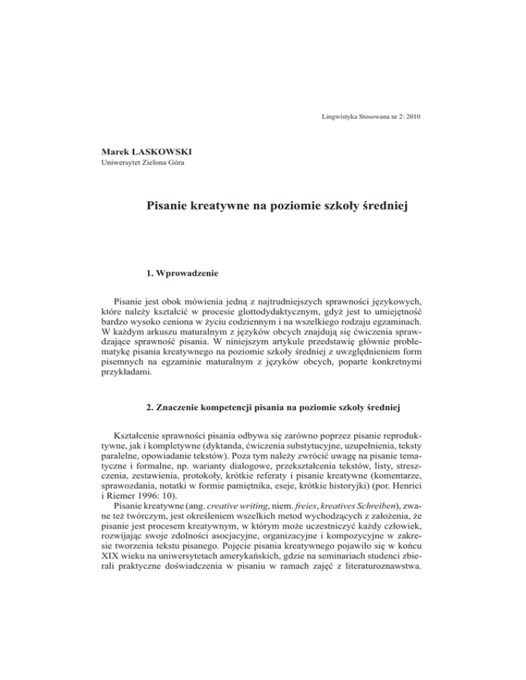 133 Lingwistyka Stosowana nr 2: 2010 Marek LASKOWSKI Uniwersytet Zielona Góra Pisanie kreatywne na poziomie szkoły średniej 1. Wprowadzenie Pisanie jest obok mówienia jedną z najtrudniejszych sprawności językowych, które należy kształcić w procesie glottodydaktycznym, gdyż jest to umiejętność bardzo wysoko ceniona w życiu codziennym i na wszelkiego rodzaju egzaminach. W każdym arkuszu maturalnym z języków obcych znajdują się ćwiczenia sprawdzające sprawność pisania. W niniejszym artykule przedstawię głównie problematykę pisania kreatywnego na poziomie szkoły średniej z uwzględnieniem form pisemnych na egzaminie maturalnym z języków obcych, poparte konkretnymi przykładami. 2. Znaczenie kompetencji pisania na poziomie szkoły średniej Kształcenie sprawności pisania odbywa się zarówno poprzez pisanie reproduktywne, jak i kompletywne (dyktanda, ćwiczenia substytucyjne, uzupełnienia, teksty paralelne, opowiadanie tekstów). Poza tym należy zwrócić uwagę na pisanie tematyczne i formalne, np. warianty dialogowe, przekształcenia tekstów, listy, streszczenia, zestawienia, protokoły, krótkie referaty i pisanie kreatywne (komentarze, sprawozdania, notatki w formie pamiętnika, eseje, krótkie historyjki) (por. Henrici i Riemer 1996: 10). Pisanie kreatywne (ang. creative writing, niem. freies, kreatives Schreiben), zwane też twórczym, jest określeniem wszelkich metod wychodzących z założenia, że pisanie jest procesem kreatywnym, w którym może uczestniczyć każdy człowiek, rozwijając swoje zdolności asocjacyjne, organizacyjne i kompozycyjne w zakresie tworzenia tekstu pisanego. Pojęcie pisania kreatywnego pojawiło się w końcu XIX wieku na uniwersytetach amerykańskich, gdzie na seminariach studenci zbierali praktyczne doświadczenia w pisaniu w ramach zajęć z literaturoznawstwa. 134 MAREK LASKOWSKI Oprócz kreatywnego pisania w szkolnej dydaktyce stosuje się to pojęcie również jako zabawę językiem, jako środek terapeutyczny i metodę autobiograficznej autorefleksji i jako pragmatykę pisania w zakresie literatury, teatru, filmu i nauki. Nas interesuje pisanie kreatywne na poziomie szkoły średniej. Brenner (1990: 16) definiuje to pojęcie następująco: „Kreativität in Schreibexperimenten bedeutet, dass Jugendliche sich ihnen bislang unzugängliche Möglichkeiten des Denkens, Empfindens und Formulierens erschließen”. W słowniku pedagogicznym możemy przeczytać, że określa się to pojęcie jako czynność twórczą, co obiektywnie nie przynosi ze sobą nic nowego, gdzie jednak pokonuje się nowe drogi i osiąga rezultaty, gdyż poprzez pisanie rozwija się cechy twórczego człowieka, twórcze zdolności (Laabs 1987: 324). We wcześniejszych etapach nauczania pisania chodziło o to, jak uczniowie mogą nauczyć się w ogóle pisać, tzn. łączyć litery i tworzyć wyrazy. Teraz chodzi o to, w jaki sposób można przekazać informacje w bardziej kompleksowej formie pisemnej, tzn. jak łączyć wyrazy w zdania tworząc teksty. Nauka odbywa się już na poziomie wyższym i wymaga bardziej skomplikowanych procesów kognitywnych. Na tym poziomie zna się już lepiej strukturę języka i opanowane są reguły pisemnej wypowiedzi. Teraz należy udoskonalić tę sprawność. Pisane kreatywne polega na utworzeniu przez osobę piszącą konkretnej treści na podstawie gotowej lub samodzielnie wybranej intencji komunikatywnej. Kreatywność wyrażana jest tutaj przez samodzielny wybór dowolnych jednostek leksykalnych i struktur gramatycznych. Celem ćwiczeń produktywnych jest rozwijanie komunikatywnych możliwości porozumiewania się. Wraz z rosnącą liczbą konstelacji językowych zmienia się forma pisania kreatywnego. Punkt ciężkości przesuwa się w większej mierze na kompleksowe zadania, jak np. pisanie listu, sprawozdania o wydarzeniach osobistych, szkolnych, międzynarodowych i historycznych, sporządzanie notatek i w końcu pisemne utrwalanie własnych myśli. W trakcie takich ćwiczeń wzrasta stopniowo twórczy element i samodzielność. Na tym etapie muszą być czytelne dla uczącego się sytuacja, cel komunikatywny partnera i zamiar. Uczeń sam określa odpowiednie środki językowe i kolejność przekazywanych treści. Przy tym wsparcie ze strony nauczyciela jest coraz mniejsze. Dzięki takim produktywnym formom ćwiczeń nauczyciel może się przekonać, w jakim stopniu uczący przyswoili sobie ortografię, gdyż przy pisaniu kreatywnym uwaga bardziej skoncentrowana jest na stronie treściowej. Przy takich produktywnych formach ćwiczeń uczeń przyzwyczaja się do pracy ze słownikami, do samokontroli i autokorekty, które stanowią warunek dalszego doskonalenia języka obcego (por. Kast 1989: 145). Wzrasta, więc samodzielność uczniów. Podczas procesu pisania uczniowie odczuwają poza trudem również zadowolenie z wykonanej pracy Davis i Widdowson (1983:153) rozróżniają trzy etapy w odbiorze i tworzeniu tekstów pisanych. Najtrudniejszym poziomem procesu pisania jest kodowanie strukturalne z umiejętnym zastosowaniem komponentów graficzno-semantycznych w konkretnym PISANIE KREATYWNE NA POZIOMIE SZKOŁY ŚREDNIEJ 135 rodzaju tekstu, który wymusza na autorze tekstu użycia konkretnych, charakterystycznych dla niego elementów. Faza pisania jest czymś szczególnym w procesie lekcyjnym. Uczniowie szukają wyrażeń do swoich pomysłów zamiast wybierać z gotowych podanych list środków językowych. Podczas pisania można uczyć i powtarzać gramatykę według potrzeb, które występują podczas pisania i formułowania myśli, według planu. To wspiera również progresję indywidualną. Uczniowie stwierdzają, że nie tylko mają konkretne braki językowe, ale również, że coś potrafią (Mummert 1989: 75-76). 3. Brainstorming, clustering i mind-mapping Pisanie kreatywne jest działaniem twórczym o znaczącej funkcji kształcącej u uczniów rozwój wyobraźni i pewności siebie w sytuacjach
