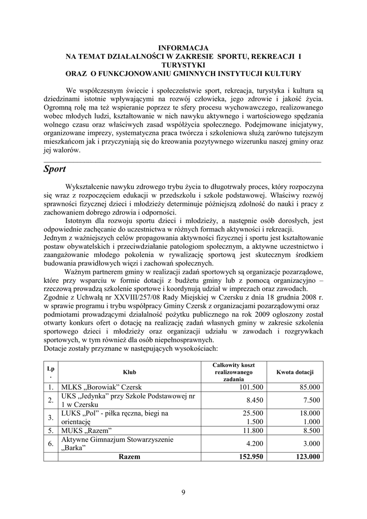 INFORMACJA NA TEMAT DZIAŁALNOŚCI W ZAKRESIE SPORTU, REKREACJI I TURYSTYKI ORAZ O FUNKCJONOWANIU GMINNYCH INSTYTUCJI KULTURY We współczesnym świecie i społeczeństwie sport, rekreacja, turystyka i kultura są dziedzinami istotnie wpływającymi na rozwój człowieka, jego zdrowie i jakość Ŝycia. Ogromną rolę ma teŜ wspieranie poprzez te sfery procesu wychowawczego, realizowanego wobec młodych ludzi, kształtowanie w nich nawyku aktywnego i wartościowego spędzania wolnego czasu oraz właściwych zasad współŜycia społecznego. Podejmowane inicjatywy, organizowane imprezy, systematyczna praca twórcza i szkoleniowa słuŜą zarówno tutejszym mieszkańcom jak i przyczyniają się do kreowania pozytywnego wizerunku naszej gminy oraz jej walorów. ___________________________________________________________________________ Sport Wykształcenie nawyku zdrowego trybu Ŝycia to długotrwały proces, który rozpoczyna się wraz z rozpoczęciem edukacji w przedszkolu i szkole podstawowej. Właściwy rozwój sprawności fizycznej dzieci i młodzieŜy determinuje późniejszą zdolność do nauki i pracy z zachowaniem dobrego zdrowia i odporności. Istotnym dla rozwoju sportu dzieci i młodzieŜy, a następnie osób dorosłych, jest odpowiednie zachęcanie do uczestnictwa w róŜnych formach aktywności i rekreacji. Jednym z waŜniejszych celów propagowania aktywności fizycznej i sportu jest kształtowanie postaw obywatelskich i przeciwdziałanie patologiom społecznym, a aktywne uczestnictwo i zaangaŜowanie młodego pokolenia w rywalizację sportową jest skutecznym środkiem budowania prawidłowych więzi i zachowań społecznych. WaŜnym partnerem gminy w realizacji zadań sportowych są organizacje pozarządowe, które przy wsparciu w formie dotacji z budŜetu gminy lub z pomocą organizacyjno – rzeczową prowadzą szkolenie sportowe i koordynują udział w imprezach oraz zawodach. Zgodnie z Uchwałą nr XXVIII/257/08 Rady Miejskiej w Czersku z dnia 18 grudnia 2008 r. w sprawie programu i trybu współpracy Gminy Czersk z organizacjami pozarządowymi oraz podmiotami prowadzącymi działalność poŜytku publicznego na rok 2009 ogłoszony został otwarty konkurs ofert o dotację na realizację zadań własnych gminy w zakresie szkolenia sportowego dzieci i młodzieŜy oraz organizacji udziału w zawodach i rozgrywkach sportowych, w tym równieŜ dla osób niepełnosprawnych. Dotacje zostały przyznane w następujących wysokościach: Lp . 1. 2. 3. 5. 6. Całkowity koszt realizowanego zadania Klub MLKS „Borowiak” Czersk UKS „Jedynka” przy Szkole Podstawowej nr 1 w Czersku LUKS „Pol” - piłka ręczna, biegi na orientację MUKS „Razem” Aktywne Gimnazjum Stowarzyszenie „Barka” Razem 9 Kwota dotacji 101.500 85.000 8.450 7.500 25.500 1.500 11.800 18.000 1.000 8.500 4.200 3.000 152.950 123.000 Poza dotacjami dla organizacji pozarządowych gmina dofinansowuje działalność sportową bezpośrednio z budŜetu poprzez działalność Szkolnego Związku Sportowego, UKS-u „Brda” Rytel, Rady Miejsko - Gminnej LZS, w drodze organizacji rozgrywek dzikich druŜyn, a takŜe zakup nagród i wynajęcie hali sportowej na zawody i turnieje. PoniŜej przedstawiamy materiały opracowane przez poszczególne kluby. _____________________________________________________________ MLKS „Borowiak” Władze klubu: Prezes: Przytarski Mirosław v-ce prezes Schumacher Jarosław ds. piłki noŜnej v-ce prezes Ziemak Marek ds. piłki ręcznej sekretarz: Łangowski Jacek Skarbnik: Rompkowski Sławomir Kierownik sekcji piłki noŜnej: Pliszka Zbigniew Kierownik sekcji piłki ręcznej: Literski Radosław Członkowie: Cisewski Leszek, Leszczyński Artur W sekcji piłki noŜnej prowadzimy pięć zespołów: 1. Senior 2. Junior A rocznik 1991 i młodsi 3. Junior C 1 rocznik 1995 i młodsi 4. Junior D 1 rocznik 1997 i młodsi 5. Junior E 1 rocznik 1999 i młodsi Seniorzy: W sezonie 2008-2009 zajęli IV miejsce w V-lidze pomorskiej. Obecnie w sezonie 2009-2010 zajmują XII miejsce. W zespole Seniora zgłoszonych jest do rozgrywek 22 zawodników. Trenerem zespołu jest Jędrzejewski Sebastian. Junior „A” klasa okręgowa: Zespół w sezonie 2008-2009 brał udział w rozgrywkach Juniora”B” i zajął III miejsce. Obecnie w sezonie 2009-2010 zajmuje V miejsce. Zespół liczy 21 zawodników. Trenerem zespołu jest Szynwelski Grzegorz. Junior „C” 1: W sezonie 2008-2009 zespół zajął II miejsce, w obecnym sezonie 2009-2010 zajmuje miejsce IV. Zawodników zgłoszonych w zespole jest 19. Trenerem zespołu jest Szynwelski Krzysztof. Junior ”D” 1 liga pomorska: W sezonie 2008-2009 druŜyna zajęła V miejsce. W gronie zespołów takich jak „Arka Gdynia”, „Lechia Gdańsk”, „Gedania Gdańsk”, „Pogoń Lębork”. W obecnym sezonie 20092010 zespół zajmuje miejsce IV. Zgłoszonych w druŜynie jest 22 zawodników. Trenerem zespołu jest Schumacher Jarosław. Junior „E” 1: W sezonie 2008-2009 tworzyła grupę naborową, biorącą udział w turniejach i meczach sparingowych. W sezonie 2009-2010 zespół zgłoszony został do rozgrywek ligowych. Przez grupę naborową przewinęło się ok. 60 chłopców. Obecnie zespół w lidze zajmuje IV miejsce. Trenerem zespołu jest Szynwelski Kazimierz. Osiągnięcia Klubu: 1. Przejście dwóch zawodników do Szkoły Mistrzostwa Sportowego w Łodzi. 2. Zespół Juniora „D” 1 bierze udział w najwyŜszej klasie rozgrywkowej w roczniku 1997. Cele Klubu: 1. Utrzymanie jak największej ilości wychowanków klubu w druŜynie Seniora. 2. Awans grup młodzieŜowych do najwyŜszych klas rozgrywkowych w danym roczniku. 10 3. Utworzenie grupy naborowej rocznika 2000-2001. Sekcja piłki ręcznej W sezonie 2008/2009 klub zgłosił do rozgrywek dwie druŜyny: druŜynę młodzików 94/95, której trenerem był Marcin Linda oraz druŜynę juniorów młodszych, której trenerem był Piotr Fryca. DruŜyna młodzików zajęła w rozgrywkach Ligi Wojew
