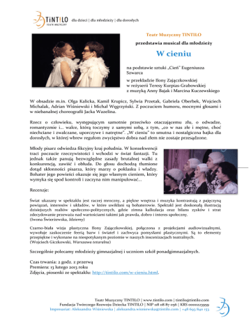 dla dzieci | dla młodzieży | dla dorosłych Teatr Muzyczny TINTILO przedstawia musical dla młodzieży W cieniu na podstawie sztuki „Cień” Eugeniusza Szwarca w przekładzie Ilony Zajączkowskiej w reżyserii Teresy Kurpias-Grabowskiej z muzyką Anny Bajak i Marcina Kuczewskiego W obsadzie m.in. Olga Kalicka, Kamil Krupicz, Sylwia Przetak, Gabriela Oberbek, Wojciech Michalak, Adrian Wiśniewski i Michał Węgrzyński. Z poczuciem humoru, mocnymi głosami i w niebanalnej choreografii Jacka Wazelina. Rzecz o człowieku, występującym samotnie przeciwko otaczającemu złu, o odwadze, romantyzmie i... walce, którą toczymy z samymi sobą, z tym, „co w nas złe i mętne, choć niechciane i zwalczane, uporczywe i natrętne”. „W cieniu” to smutna i nostalgiczna bajka dla dorosłych, w której wbrew regułom zwycięstwo dobra nad złem nie zostaje przesądzone. Młody pisarz odwiedza fikcyjny kraj południa. W konsekwencji traci poczucie rzeczywistości i wchodzi w świat fantazji. Tu jednak także panują bezwzględne zasady brutalnej walki z konkurencją, zawiść i obłuda. Do głosu dochodzą tłumione dotąd skłonności pisarza, który marzy o poklasku i władzy. Bohater jego powieści okazuje się jego własnym cieniem, który wymyka się spod kontroli i zaczyna nim manipulować... Recenzje: Świat ukazany w spektaklu jest raczej mroczny, a piękne wnętrza i muzyka kontrastują z pajęczyną powiązań, interesów i układów, w które uwikłani są bohaterowie. Spektakl jest doskonałą ilustracją dzisiejszych realiów społeczno-politycznych, gdzie zimna kalkulacja oraz bilans zysków i strat zdecydowanie przeważa nad wartościami takimi jak prawda, dobro i interes społeczny. (Iwona Świerżewska, Idziemy) Czarno-biała wizja plastyczna Ilony Zajączkowskiej, połączona z projekcjami audiowizualnymi, wywołuje zaskoczenie feerią barw i świateł i zachwyca pomysłami plastycznymi. Są to elementy przepiękne i wykonane na niespotykanym poziomie w naszych inscenizacjach teatralnych. (Wojciech Giczkowski, Warszawa tetaralna) Szczególnie polecamy młodzieży gimnazjalnej i uczniom szkół ponadgimnazjalnych. Czas trwania: 2 godz. z przerwą Premiera: 13 lutego 2013 roku Zdjęcia, piosenki ze spektaklu: http://tintilo.com/w-cieniu.html. Teatr Muzyczny TINTILO | www.tintilo.com | [email protected] Fundacja Twórczego Rozwoju Dziecka TINTILO | NIP 118 08 87 056 | KRS 0000223959 Impresariat: Aleksandra Wiśniewska | [email protected] | +48 693 840 153 1