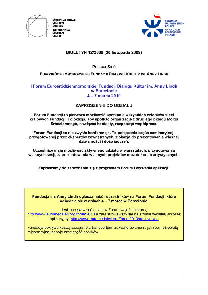 BIULETYN 12/2009 (30 listopada 2009) POLSKA SIEĆ EUROŚRÓDZIEMNOMORSKIEJ FUNDACJI DIALOGU KULTUR IM. ANNY LINDH I Forum Eurośródziemnomorskiej Fundacji Dialogu Kultur im. Anny Lindh w Barcelonie 4 – 7 marca 2010 ZAPROSZENIE DO UDZIAŁU Forum Fundacji to pierwsza moŜliwość spotkania wszystkich członków sieci krajowych Fundacji. To okazja, aby spotkać organizacje z drugiego brzegu Morza Śródziemnego, nawiązać kontakty, rozpocząć współpracę. Forum Fundacji to nie zwykła konferencja. To połączenie część seminaryjnej, przygotowanej przez ekspertów zewnętrznych, z okazją do prezentowania własnej działalności i doświadczeń. Uczestnicy mają moŜliwość aktywnego udziału w warsztatach, przygotowania własnych sesji, zaprezentowania własnych projektów oraz dokonań artystycznych. Zapraszamy do zapoznania się z programem Forum i wysłania aplikacji! Fundacja im. Anny Lindh ogłasza nabór uczestników na Forum Fundacji, które odbędzie się w dniach 4 – 7 marca w Barcelonie. Jeśli chcesz wziąć udział w Forum wejdź na stronę http://www.euromedalex.org/forum2010 a zarejstrowawszy się na stronie wypełnij wniosek aplikacyjny: http://www.euromedalex.org/forum2010/getinvolved Fundacja pokrywa koszty związane z transportem, zakwaterowaniem, jak równieŜ opłatę rejestracyjną, napoje oraz część posiłków. 1 Uczestnik musi: • być obywatelem jednego z 43 krajów Partnerstwa Eurośródziemnomorskiego, • posiadać wiedzę/doświadczenie w obszarze tematycznym warsztatów (tzw. Agora), i/lub • być w stanie reprezentować organizację/realizowany projekt podczas sesji (tzw. Medina), • być zmotywowanym do współpracy z partnerami zagranicznymi i aktywnego uczestnictwa w Forum, • posiadać znajomość języka angielskiego lub francuskiego, • uczestniczyć we wszystkich wydarzeniach Forum. Wybór uczestników, 150 osób ze wszystkich 43 krajów Partnerstwa Eurośródziemnomorskiego, będzie się opierał na wkładzie wniesionym przez nich do poszczególnych sesji, a zostanie poprzedzony konsultacjami z narodowymi koordynatorami. Termin zgłaszania upływa we wtorek, 15 grudnia, o godzinie 20.00 (czas GMT) Wybrani uczestnicy zostaną powiadomieni o przyjęciu najpóźniej w niedzielę, 10 stycznia 2010. Wstępny program CZWARTEK 4 marca 2010 PIĄTEK 5 marca 2010 9.30 - 11.00 sesja inauguracyjna SOBOTA 6 marca 2010 AGORA 9.30 - 11.00 Sesja plenarna NIEDZIELA 7 marca 2010 AGORA 10.00 - 11.30 Sesja plenarna Od 11.00 – rejestracja AGORA 11.30 - 13.30 5 równoległych sesji warsztatowych 11.30 - 13.30 5 równoległych sesji warsztatowych 12.00 - 13.30 Sesja zamykająca 13.30 - 15.00 Lunch z Radą Gubernatorów, Radą Doradczą i koordynatorami narodowymi 13.30 - 15.00 Przerwa lunchowa 13.30 - 15.00 Przerwa lunchowa 16.00 Otwarcie MEDINY MEDINA 15.00-20.00 Targi międzykulturowe Własne sesje Sesje informacyjne Najlepsze praktyki Propozycje projektów Wymiana artystyczna MEDINA 15.00-20.00 Targi międzykulturowe Własne sesje Sesje informacyjne Najlepsze praktyki Propozycje projektów Wymiana artystyczna 13.30 poŜegnalny drink 2 AGORA Sesje plenarne Debaty nt. osiągnięć i przeszkód w rozwoju współpracy społecznej i kulturalnej w regionie eurośródziemnomorskim. Wśród tematów: trendy interkulturowe w regionie, ludzki i kulturalny wymiar Unii dla Śródziemnomorza. Planowana transmisja telewizyjna. Sesje warsztatowe Debaty nt. najwaŜniejszy kwestii związanych z dialogiem eurośródziemnomorskim i osiągnięciami Fundacji im. A. Lindh w tym zakresie mające słuŜyć dalszemu rozwojowi programów Fundacji. Tematy warsztatów są wynikiem sesji przygotowawczych (m.in. Rodos, Tirana) i odnoszą się to strategicznych zakresów tematycznych przewidzianych przez Fundację w planie trzyletnim. • Edukacja, nauczanie międzykulturowe i młodzieŜ: „Jak Ŝyć wspólnie w róŜnorodności” • Współpraca kulturalna i artystyczna: „Kreatywność na rzecz dialogu” • Tworzenie przestrzeni dla pokoju i współistnienia: „Przywracając zaufanie, odbudowując mosty” • Miasta, migranci i róŜnorodność: „Doceniając róŜnorodność, rozumiejąc migracje” • Religia, duchowość i wartości: „Dialog międzyreligijny i wspólne wartości w działaniu” MEDINA Zaproszenie do dzielenia się pomysłami, doświadczeniem, wiedzą w celu rozpoczęcia nowej współpracy i wspólnych działań. • Targi międzykulturowe – stoiska sieci narodowych (moŜliwość prezentacji własnych organizacji i ich działań) • Najlepsze praktyki – moŜliwość 10 minutowej prezentacji w sali plenarnej swoich doświadczeń (pozytywnych ale i negatywnych) w zakresie pracy na rzecz dialogu międzykulturowego • Propozycje projektów – moŜliwość prezentacji pomysłów na projekt, ofert współpracy, poszukiwania partnerów w salach warsztatowych (do 40 osób) • Sesje własne – moŜliwość zaproponowania i poprowadzenia sesji tematycznej w sali do 100 osób • Sesje informacyjne – Sekretariat Fundacji przygotuje sesje dot. m.in. programów wspólnotowych, technologii komunikacyjnych itp. • Wymiana artystyczna – moŜliwość prezentacji swoich dokonań w postaci wystaw, pokazów filmowych, instalacji; prace muszą dotyczyć dialogu międzykulturowego; częściowe wsparcie finansowe Fundacji. Polska sieć będzie reprezentowana podczas targów międzykulturowych. Zgłoszenie do udziału w Forum ALF w Barcelonie wiąŜe się z udzieleniem pomocy koordynatorom podczas prezentacji polskiej sieci. Serdecznie pozdrawiamy, Joanna Sanetra-Szeliga Robert Kusek Koordynatorzy polskiej sieci Fundacji im. A. Lindh 3