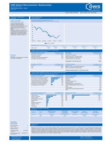 DWS Sektora Nieruchomo ci i Budownictwa DWS Real Estate Securities Subfundusz akcji - wiat Equity - World Kwiecie 2009 / April 2009 Informacje o Subfunduszu Wyniki Subfunduszu Subfund data Subfund performance Polityka inwestycyjna Zmiana warto ci aktywów netto Subfunduszu (kat. A) na jednostk uczestnictwa (PLN) / Performance - Share class A (PLN) Investment policy (Eng. on request) Do 100% warto ci aktywów netto subfunduszu lokowane jest w akcje emitentów z sektora budownictwa i nieruchomo ci oraz w jednostki uczestnictwa subfunduszy wchodz cych w sk ad zagranicznego funduszu inwestycyjnego RREEF. Subfundusze RREEF inwestuj g ównie w akcje spó ek notowanych na ró nych rynkach z ca ego wiata, które posiadaj , buduj , zarz dzaj nieruchomo ciami i projektami deweloperskimi lub czerpi korzy ci z najmu nieruchomo ci i powierzchni biurowych. Dane na dzie / As of: 30.04.2009 110 100 90 80 70 60 50 40 30.01.08 30.04.08 30.07.08 30.10.08 30.01.09 30.04.09 Subfundusz / Subfund Stopa zwrotu (w %) / Performance (in %) 1 msc / 1 m 3 msc / 3 m 12,85 13,28 kat. A / class A 6 msc / 6 m 0,68 12 msc / 12 m 36 msc / 36 m 60 msc / 60 m -39,17 brak brak Analiza portfela DWS Nieruchomo ci i Budownictwa Portfolio Analysis of Real Estate Securities Dywersyfikacja sektorowa (akcje) Breakdown by sector (equities) (w % aktywów netto) (in % of net assets) 22,57 Sk ad portfela Investment ratio (w % aktywów netto) (in % of net assets) Benchmark Przemys owy / Industrials Benchmark Subfundusz nie posiada portfela wzorcowego / Benchmark not established Finansowy / Financials 9,93 Papiery d Dobra luksusowe / Consumer Discretionary 3,76 Fundusze inwestycyjne / Investment funds Informatyka / Information Technology 3,19 Gotówka i depozyty / Cash and Deposit Akcje razem / Total equities 39,45 ne razem / Total debt securities 0,00 51,66 8,89 Portfel ogó em / Total investment ratio Otwarte pozycje walutowe (w % aktywów netto) Currencies PLN (in % of net assets) 50,88 EUR 49,12 100,00 Fundusze inwestycyjne (w % aktywów netto) Investment funds (in % of net assets) RREEF European (ex-UK) Real Estate Securities 29,73 RREEF Asia-Pacific Real Estate Securities 21,93 Fundusze inwestycyjne ogó em / Total Investment funds 51,66 Analiza portfela RREEF European (ex-UK) Real Estate Securities Portfolio Analysis of RREEF European (ex-UK) Real Estate Securities Dywersyfikacja sektorowa (akcje) Breakdown by sector (equities) (w % aktywów netto) ówne inwestycje (akcje) (w % aktywów netto) (in % of net assets) Principal holdings (equities) (in % of net assets) Fundusze nieruch.handlowych / Retail REITs 26,50 UNIBAIL-RODAMCO Zarz. nieruchom. / Real Estate Operating 20,60 CORIO NV 8,30 Fundusze nieruchomo ci / Diversified REITs 10,30 4,80 Fundusze nieruch. biurowych / Office REITs Deweloperzy / Real Estate Development 9,40 KLEPIERRE PSP SWISS PROPERTY AG 9,60 5,10 WERELDHAVE NV 4,20 Nieruchomo ci / Diversified Real Estate 1,90 EUROCOMMERCIAL PROPERTIES NV 3,70 Nie zklasyfikowane / Not classified 5,30 SOCIETE IMMOBILIERE DE LOCATION POU 3,60 ICADE 3,30 4,70 CASTELLUM AB 3,20 3,10 CAMPER & NICHOLSONS MARINA INVESTM Total (w % aktywów netto) Dywersyfikacja geograficzna (akcje) (in % of net assets) Breakdown by country (equities) 48,50 Otwarte pozycje walutowe (w % aktywów netto) (in % of net assets) Currencies Francja / France 24,20 EUR Holandia / Netherlands 16,20 SEK 9,70 9,70 GBP 8,30 Szwecja / Sweden 69,80 5,90 CHF 4,70 Belgia / Belgium 5,80 USD 0,20 Austria 4,70 Szwajcaria / Switzerland 4,70 Finlandia / Finland 3,30 Guernsey 3,10 Cypr / Cyprus 2,10 Wielka Brytania / Great Britain Kategorie jednostek uczestnictwa Share classes Kategoria Waluta Maksymalna op ata manipulacyjna Wynagrodzenie Towarzystwa (stan aktualny) Zmienna op ata za zarz dzanie Minimalna pierwsza wp ata Minimalna kolejna wp ata Share class Currency Front load fee Current management fee Performance fee Minimal investment Minimal subsequent PLN 5,00% 4,00% - 100,00 50,00 A Zarz dzaj cy Portfolio manager Piotr Lubczy ski Nota prawna DWS - klasa ryzyka 4 Disclaimer DWS - risk class Aktywa (w mln PLN) 1,1 Assets (in mln PLN) Pocz tek dzia alno ci 28.01.2008 Launch date Identyfikator Bloomberga DWSRESA PW Dotychczasowe wyniki Subfunduszu nie stanowi gwarancji osi gni cia podobnych wyników w przysz ci. DWS Polska TFI S.A. ani DWS Parasol SFIO nie gwarantuj osi gni cia za onych celów inwestycyjnych Subfunduszu. Niniejszy materia ma charakter informacyjny i nie zawiera pe nych informacji niezb dnych do oceny ryzyka zwi zanego z inwestycj w Subfundusz i nie stanowi przekazu reklamowego. Przy nabyciu jednostek uczestnictwa Subfunduszu pobierana jest op ata manipulacyjna na zasadach i w wysoko ci okre lonej w Prospekcie Informacyjnym DWS Parasol SFIO. Prezentowane stopy zwrotu z inwestycji nie uwzgl dniaj op at manipulacyjnych pobieranych przy nabyciu lub konwersji jednostek uczestnictwa. Szczegó owy opis czynników ryzyka, zasady sprzeda y jednostek uczestnictwa Subfunduszu, tabela op at manipulacyjnych oraz szczegó owe informacje podatkowe zawarte s w Prospekcie Informacyjnym DWS Parasol SFIO, dost pnym w punktach dystrybucji Funduszu, siedzibie Towarzystwa oraz na stronie www.dws.com.pl. Zyski osi gni te z inwestycji w jednostki uczestnictwa Subfunduszu obci one s podatkiem od dochodów kapita owych, na podst. Ustawy z dnia 26 lipca 1991 r. o podatku dochodowym od osób fizycznych, (Dz. U. 00.14.176 z pó niejszymi zmianami). Bloomberg Ticker DWS Polska TFI S.A. al. Armii Ludowej 26 00-609 Warszawa Infolinia 0 801 605 505 Internet www.dws.com.pl