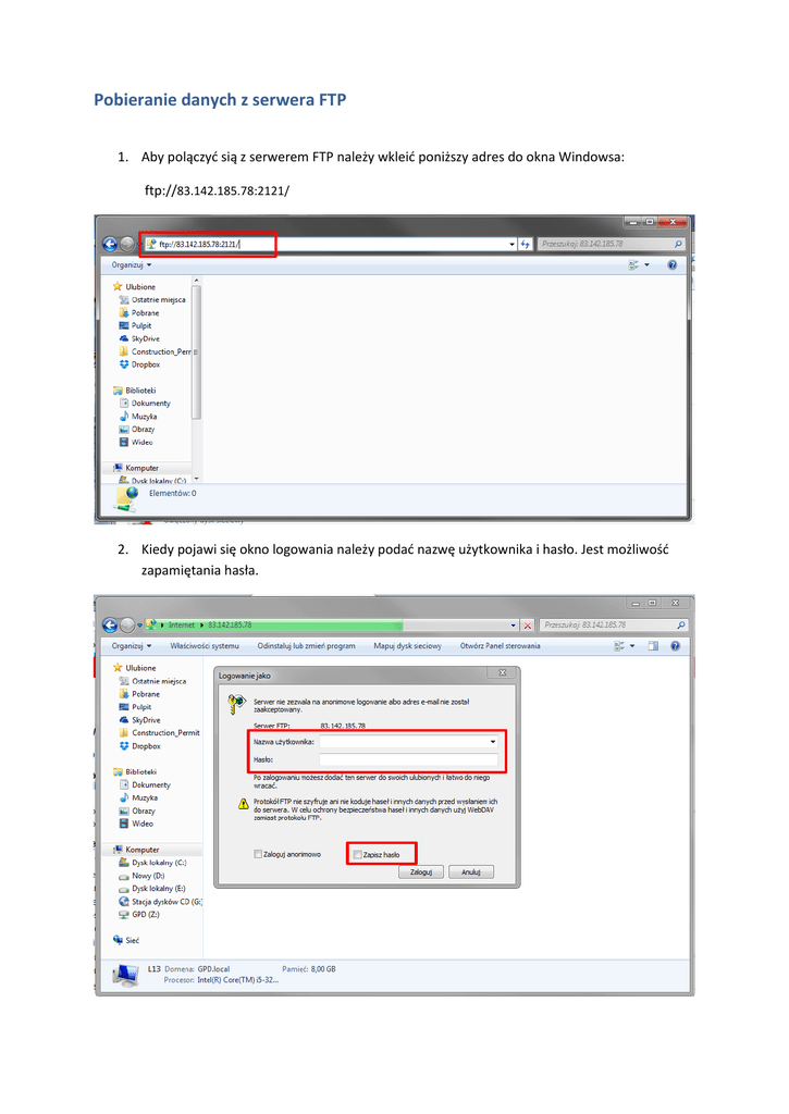 Pobieranie danych z serwera FTP 1. Aby polączyć sią z serwerem FTP należy wkleić poniższy adres do okna Windowsa: ftp://83.142.185.78:2121/ 2. Kiedy pojawi się okno logowania należy podać nazwę użytkownika i hasło. Jest możliwość zapamiętania hasła. 3. Po połączeniu jest możliwość kopiowania danych z serwera FTP na własną przestrzeń dyskową, a także wgrywania danych na FTP, zależnie od uprawnień konta.