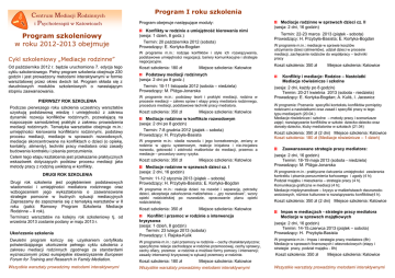 Centrum Mediacji Rodzinnych i Psychoterapii w Katowicach Program szkoleniowy w roku 2012-2013 obejmuje Cykl szkoleniowy „Mediacje rodzinne” Od października 2012 r. będzie uruchomiona 7. edycja tego cyklu szkoleniowego. Pełny program szkolenia obejmuje 230 godzin i jest prowadzony metodami interaktywnymi w formie warsztatowej przez okres dwóch lat. Program składa się z dwudniowych modułów szkoleniowych o narastającym stopniu zaawansowania. PIERWSZY ROK SZKOLENIA Podczas pierwszego roku szkolenia uczestnicy warsztatów uzyskują podstawową wiedzę i umiejętności z zakresu dynamiki rozwoju konfliktów rodzinnych, pozwalającą na rozpoczęcie samodzielnej praktyki z zakresu prowadzenia mediacji rodzinnych. Tematyka warsztatów obejmuje m.in.: umiejętności kierowania konfliktami rodzinnymi, podstawy procesu mediacji, mediacje w sprawach rozwodowych, mediacje skoncentrowane na konfliktach o dzieci (o opiekę, kontakty, alimenty), techniki pracy mediatora oraz zasady budowania kontraktu i pisania porozumienia. Celem tego etapu kształcenia jest przekazanie praktycznych wskazówek dotyczących podstaw procesu mediacji jako metody pracy z rodziną uwikłaną w konflikty. DRUGI ROK SZKOLENIA Drugi rok szkolenia jest pogłębieniem podstawowych wiadomości i umiejętności mediatora rodzinnego oraz wzbogaceniem jego wykształcenia o zaawansowane strategie pomocne w trudnych sytuacji mediacyjnych Zapraszamy do zapoznania się z tematyką warsztatów w II roku (patrz: Ramowy Program Szkolenia Mediacje Rodzinne – II rok). Terminarz warsztatów na kolejny rok szkoleniowy tj. od września 2013 zostanie podany w maju 2013 r. Ukończenie szkolenia Dwuletni program kończy się uzyskaniem certyfikatu potwierdzającego ukończenie pełnego cyklu szkolenia z zakresu mediacji rodzinnych zgodnego ze standardami wyznaczonymi przez europejskie stowarzyszenie European Forum for Training and Research in Family Mediation. Wszystkie warsztaty prowadzimy metodami interaktywnymi Program I roku szkolenia Program obejmuje następujące moduły: Konflikty w rodzinie a umiejętność kierowania nimi (sesja: 1 dzień, 8 godz.) Termin: 20 października 2012 (sobota) Prowadzący: E. Kortyka-Bogdan W programie m.in.: rodzaje konfliktów i style ich rozwiązywania, podstawowe umiejętności negocjacji, bariery komunikacyjne i strategie negocjacyjne. Koszt szkolenia: 180 zł Miejsce szkolenia: Katowice Podstawy mediacji rodzinnych (sesja: 2 dni po 8 godz.) Termin: 10-11 listopada 2012 (sobota – niedziela) Prowadzący: M. PliŜga-Jonarska W programie m.in.: podstawy teorii i praktyki mediacji, rodzina w procesie mediacji – zakres spraw i etapy pracy mediatora rodzinnego, procedura mediacji, podstawowe techniki pracy mediatora. Koszt szkolenia: 350 zł Miejsce szkolenia: Katowice Mediacje rodzinne w konflikcie rozwodowym (sesja: 2 dni po 8 godzin) Termin: 7-8 grudnia 2012 (piątek – sobota) Prowadzący: H. Przybyła-Basista W programie m.in.: stadia rozwodu i jego konsekwencje, zmiany w rodzinie w ujęciu systemowym, reakcje inicjatora i nie-inicjatora rozwodu, gotowość i zdolność małŜonków do mediacji, przemoc a mediacje – procedury oceny ryzyka. Koszt szkolenia: 350 zł Miejsce szkolenia: Katowice Mediacje rodzinne w sprawach dzieci cz. I (sesja: 2 dni, 16 godzin) Termin: 11-12 stycznia 2013 (piątek – sobota) Prowadzący: H. Przybyła-Basista; E. Kortyka-Bogdan W programie m.in.: reakcje dzieci na rozwód i separację, potrzeby dzieci, akceptacja zakończenia małŜeństwa – „gry rozwodowe”, wzory opieki rodzicielskiej po rozwodzie, opracowanie planu opieki rodzicielskiej. Koszt szkolenia: 350 zł Miejsce szkolenia: Katowice Konflikt i przemoc w rodzinie a interwencja kryzysowa (sesja: 1 dzień, 8 godzin) Termin: 23 lutego 2013 (sobota) Prowadzący: I. Rajska-Kulik W programie m.in.: cykl przemocy w rodzinie – cechy charakterystyczne; specyficzne relacje zachodzące w rodzinie przemocowej, cechy sprawcy, cechy ofiary, przemoc w rodzinie a moŜliwe formy pomocy i interwencji; zasady interwencji kryzysowej w sytuacji przemocy w rodzinie. Koszt szkolenia: 180 zł Mediacje rodzinne w sprawach dzieci cz. II (sesja: 2 dni, 16 godzin) Termin: 22-23 marca 2013 (piątek - sobota) Prowadzący: H. Przybyła-Basista; E. Kortyka-Bogdan W programie m.in.: mediacje w sprawie kosztów utrzymania dzieci (alimentów), udział dzieci w procesie mediacji, zachęcanie rodziców do współpracy – techniki pracy Koszt szkolenia: 350 zł Miejsce szkolenia: Katowice Konflikty i mediacje: Rodzice – Nastolatki Mediacje rówieśnicze i szkolne (sesja: 2 dni, kaŜdy po 8 godzin) Termin: 20-21 kwietnia 2013 (sobota - niedziela) Prowadzący: E. Kortyka-Bogdan; A. Kuliś, I. Jacewicz W programie: Poznanie specyfiki kontekstu konfliktów pomiędzy rodzicami a nastolatkami oraz zasad i specyfiki pracy w tego typu mediacjach (20.04.) Mediacje rówieśnicze i szkolne – metody pracy i scenariusze zajęć; rozwiązywanie konfliktów w szkole: dziecko-dziecko oraz dorosły-dziecko, kluby mediatorów w szkołach (21.04) Koszt szkolenia: 350 zł (2 dni) Miejsce szkolenia: Katowice Koszt szkolenia: 180 zł (Mediacje rówieśnicze – 1 dzień) Zaawansowane strategie pracy mediatora: (sesja: 2 dni, 16 godzin) Termin: 18-19 maja 2013 (sobota - niedziela) Prowadzący: M. PliŜga-Jonarska W programie m.in.: praktyczne ćwiczenia umiejętności zawierania kontraktu i pisania porozumienia końcowego i ugody (4 h); Podział majątku i mieszkania – strategie pracy (4 h). Komunikacja graficzna w mediacji (4 h); Mediacje międzynarodowe – kryzys w małŜeństwach dwunarodowościowych, róŜnice kulturowe w rozwiązywaniu konfliktów(4 h). Koszt szkolenia: 350 zł (2 dni) Miejsce szkolenia: Katowice Impas w mediacjach - strategie pracy mediatora Mediacje w sprawach majątkowych (sesja: 2 dni, 16 godzin) Termin: 14-15.czerwca 2013 (piątek – sobota) Prowadzący: H. Przybyła-Basista W programie m.in.: Impas i strategie pra