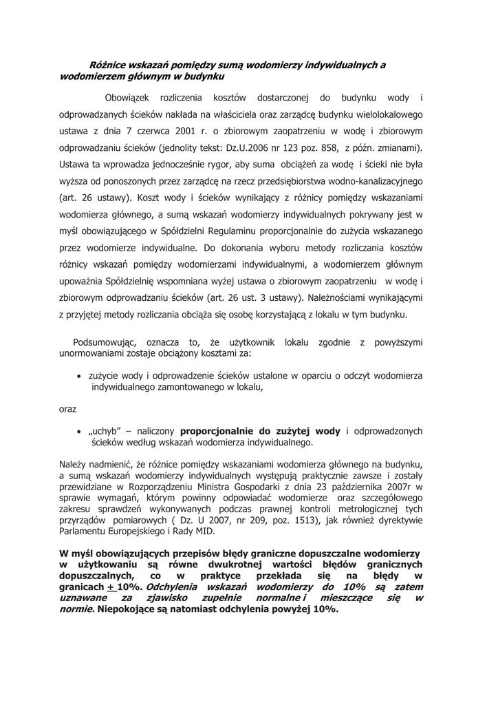 Różnice wskazań pomiędzy sumą wodomierzy indywidualnych a wodomierzem głównym w budynku Obowiązek rozliczenia kosztów dostarczonej do budynku wody i odprowadzanych ścieków nakłada na właściciela oraz zarządcę budynku wielolokalowego ustawa z dnia 7 czerwca 2001 r. o zbiorowym zaopatrzeniu w wodę i zbiorowym odprowadzaniu ścieków (jednolity tekst: Dz.U.2006 nr 123 poz. 858, z późn. zmianami). Ustawa ta wprowadza jednocześnie rygor, aby suma obciążeń za wodę i ścieki nie była wyższa od ponoszonych przez zarządcę na rzecz przedsiębiorstwa wodno-kanalizacyjnego (art. 26 ustawy). Koszt wody i ścieków wynikający z różnicy pomiędzy wskazaniami wodomierza głównego, a sumą wskazań wodomierzy indywidualnych pokrywany jest w myśl obowiązującego w Spółdzielni Regulaminu proporcjonalnie do zużycia wskazanego przez wodomierze indywidualne. Do dokonania wyboru metody rozliczania kosztów różnicy wskazań pomiędzy wodomierzami indywidualnymi, a wodomierzem głównym upoważnia Spółdzielnię wspomniana wyżej ustawa o zbiorowym zaopatrzeniu w wodę i zbiorowym odprowadzaniu ścieków (art. 26 ust. 3 ustawy). Należnościami wynikającymi z przyjętej metody rozliczania obciąża się osobę korzystającą z lokalu w tym budynku. Podsumowując, oznacza to, że użytkownik unormowaniami zostaje obciążony kosztami za: lokalu zgodnie z powyższymi • zużycie wody i odprowadzenie ścieków ustalone w oparciu o odczyt wodomierza indywidualnego zamontowanego w lokalu, oraz • „uchyb” – naliczony proporcjonalnie do zużytej wody i odprowadzonych ścieków według wskazań wodomierza indywidualnego. Należy nadmienić, że różnice pomiędzy wskazaniami wodomierza głównego na budynku, a sumą wskazań wodomierzy indywidualnych występują praktycznie zawsze i zostały przewidziane w Rozporządzeniu Ministra Gospodarki z dnia 23 października 2007r w sprawie wymagań, którym powinny odpowiadać wodomierze oraz szczegółowego zakresu sprawdzeń wykonywanych podczas prawnej kontroli metrologicznej tych przyrządów pomiarowych ( Dz. U 2007, nr 209, poz. 1513), jak również dyrektywie Parlamentu Europejskiego i Rady MID. W myśl obowiązujących przepisów błędy graniczne dopuszczalne wodomierzy w użytkowaniu są równe dwukrotnej wartości błędów granicznych dopuszczalnych, co w praktyce przekłada się na błędy w granicach + 10%. Odchylenia wskazań wodomierzy do 10% są zatem uznawane za zjawisko zupełnie normalne i mieszczące normie. Niepokojące są natomiast odchylenia powyżej 10%. się w Główną przyczyną powstawania różnicy wskazań wodomierzy, o której mowa powyżej jest klasa i sposób zamontowania wodomierzy głównych i indywidualnych (im wyższa klasa wodomierza, tym mniejsze różnice wskazań, przy wyższej klasie wodomierza nie ma też znaczenia czy jest on montowany w pionie, czy w poziomie ), niejednoczesność odczytów wodomierzy indywidualnych i wodomierza głównego, błędy pomiarowe wodomierzy, niewłaściwy dobór wodomierza głównego oraz pobór wody poniżej progu rozruchu wodomierza indywidualnego ( np. cieknące spłuczki, krany, itp.). Należy też zwrócić uwagę, że w ostatnim przypadku mowa jest o wodzie pobranej i odnotowanej przez wodomierz główny na budynku, ale nie odnotowanej przez wodomierz indywidualny zamontowany w lokalu ( stąd powstające różnice). W celu ograniczenia uchybu Spółdzielnia podejmuje szereg działań, z których wymienić należy przede wszystkim: • przestrzeganie okresu legalizacyjnego wodomierzy, który wynosi 5 lat, • montaż nowoczesnych wodomierzy (firmy Apator Powogaz SA, smart+) wyposażonych w nakładki radiowe do zdalnego odczytu, które są bardzo czułe i dokładne (klasa MID 100 i MID 80), posiadają niski próg rozruchu – 6-8 litrów/godzinę, a poprzez nakładkę radiową pozwalają na jednoczesność odczytu wszystkich wodomierzy indywidualnych w budynku bez wchodzenia do poszczególnych lokali, wodomierze te pozwalają też na wykrycie przypadków manipulacji przy wodomierzu (rejestrują datę i okres oddziaływania magnesem neodymowym, uszkodzenia mechaniczne wodomierza lub nakładki), • poddawanie jednoczesnej kontroli wizualnej i zdalnej wodomierzy kilkukrotnie przeprowadzała kontrole w roku 2012 i 2013, w celu prawidłowości działania wodomierzy, a także prawidłowości urządzeń pobierających wodę, takich jak: pralki, zmywarki, spłuczki, (Spółdzielnia sprawdzenia podłączenia itp), • analizowanie wskazań wodomierzy i w razie stwierdzenia niepokojących sygnałów montowanie nowych lub legalizację urządzeń, Uczulamy jednocześnie mieszkańców, aby na bieżąco kontrolowali swoje wodomierze w lokalach i niezwłocznie zawiadamiali Dział Techniczny o ewentualnych nieprawidłowościach. Bardzo ważne jest też utrzymywanie w sprawności armatury łazienkowej, aby wyeliminować zjawisko „cieknących spłuczek” i „kapiących kranów”. Niestety mimo podejmowania różnych działań i zamontowania nowocześniejszych wodomierzy uchyby są nadal zjawiskiem występującym i to nie tylko w naszych zasobach. Zapewniamy, że działania związane z kontrolą i ograniczeniem tego stanu rzeczy są i będą na bieżąco wykonywane przez pracowników Spółdzielni. Z poważaniem Grzegorz Dejneka Z‐ca Prezesa ds. Technicznych