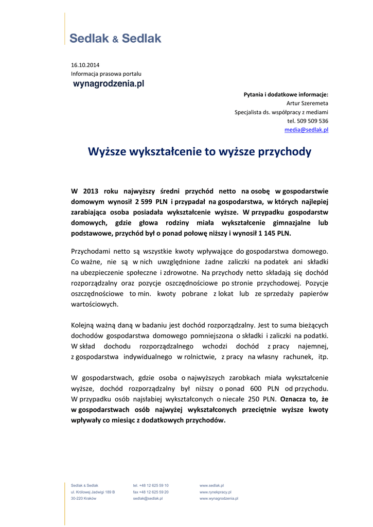 16.10.2014 Informacja prasowa portalu Pytania i dodatkowe informacje: Artur Szeremeta Specjalista ds. współpracy z mediami tel. 509 509 536 [email protected] Wyższe wykształcenie to wyższe przychody W 2013 roku najwyższy średni przychód netto na osobę w gospodarstwie domowym wynosił 2 599 PLN i przypadał na gospodarstwa, w których najlepiej zarabiająca osoba posiadała wykształcenie wyższe. W przypadku gospodarstw domowych, gdzie głowa rodziny miała wykształcenie gimnazjalne lub podstawowe, przychód był o ponad połowę niższy i wynosił 1 145 PLN. Przychodami netto są wszystkie kwoty wpływające do gospodarstwa domowego. Co ważne, nie są w nich uwzględnione żadne zaliczki na podatek ani składki na ubezpieczenie społeczne i zdrowotne. Na przychody netto składają się dochód rozporządzalny oraz pozycje oszczędnościowe po stronie przychodowej. Pozycje oszczędnościowe to min. kwoty pobrane z lokat lub ze sprzedaży papierów wartościowych. Kolejną ważną daną w badaniu jest dochód rozporządzalny. Jest to suma bieżących dochodów gospodarstwa domowego pomniejszona o składki i zaliczki na podatki. W skład dochodu rozporządzalnego wchodzi dochód z pracy najemnej, z gospodarstwa indywidualnego w rolnictwie, z pracy na własny rachunek, itp. W gospodarstwach, gdzie osoba o najwyższych zarobkach miała wykształcenie wyższe, dochód rozporządzalny był niższy o ponad 600 PLN od przychodu. W przypadku osób najsłabiej wykształconych o niecałe 250 PLN. Oznacza to, że w gospodarstwach osób najwyżej wykształconych przeciętnie wyższe kwoty wpływały co miesiąc z dodatkowych przychodów. Sedlak & Sedlak tel. +48 12 625 59 10 www.sedlak.pl ul. Królowej Jadwigi 189 B fax +48 12 625 59 20 www.rynekpracy.pl 30-220 Kraków [email protected] www.wynagrodzenia.pl Tabela 1. Przeciętne miesięczne przychody na osobę w gospodarstwach domowych według poziomu wykształcenia osoby odniesienia (w PLN) wykształcenie osoby otrzymującej najwyższe wynagrodzenie ogółem wyższe policealne; średnie zawodowe i ogólnokształcące zasadnicze zawodowe gimnazjalne; podstawowe ukończone; bez wykształcenia przychody netto 1 2 599,13 667,21 1 666,22 1 288,91 1 145,88 dochód rozporządzalny 1 1 986,50 299,07 1 305,78 1 017,65 903,37 Opracowanie Sedlak & Sedlak na podstawie danych GUS-u Dominika Staniszewska Sedlak & Sedlak Sedlak & Sedlak wyraża zgodę na publikację niniejszego opracowania pod warunkiem powołania się na źródło: wynagrodzenia.pl oraz zamieszczenie pod artykułem aktywnego linku do strony Ogólnopolskiego Badania Wynagrodzeń 2014 (http://wynagrodzenia.pl/obw.php) czcionką nie mniejszą niż czcionka użyta w publikacji. Sedlak & Sedlak tel. +48 12 625 59 10 www.sedlak.pl ul. Królowej Jadwigi 189 B fax +48 12 625 59 20 www.rynekpracy.pl 30-220 Kraków [email protected] www.wynagrodzenia.pl