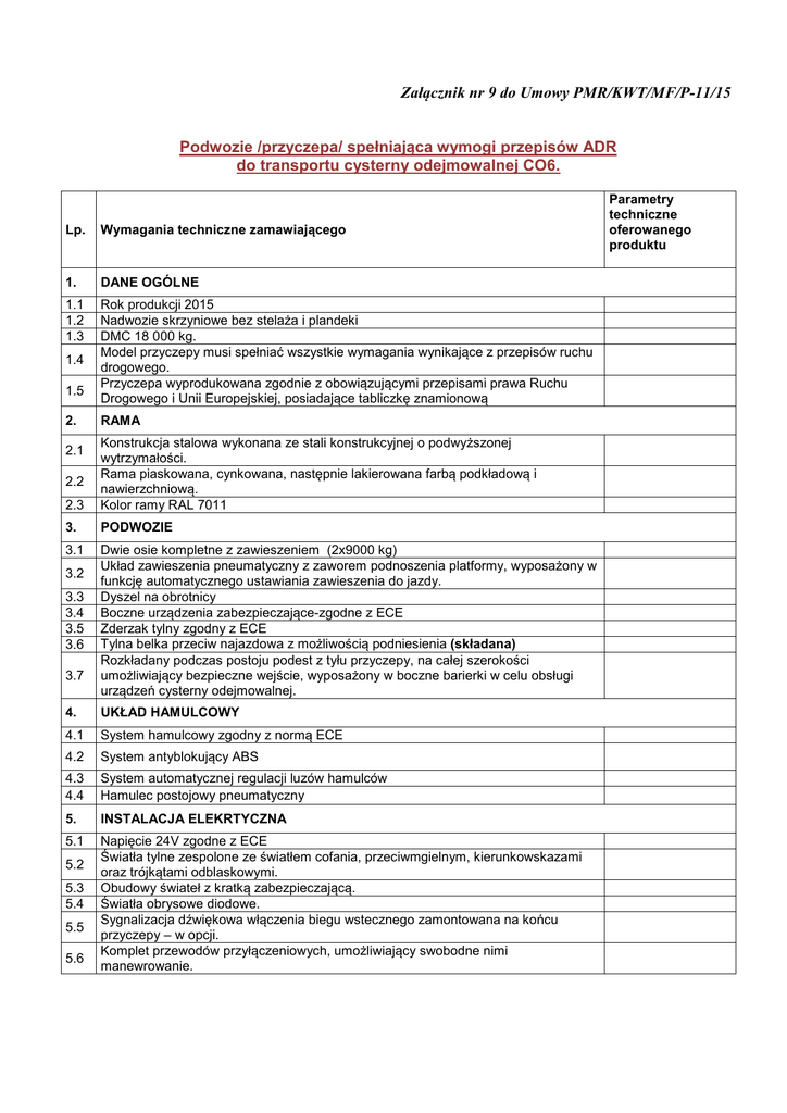 Załącznik nr 9 do Umowy PMR/KWT/MF/P-11/15 Podwozie /przyczepa/ spełniająca wymogi przepisów ADR do transportu cysterny odejmowalnej CO6. Lp. Wymagania techniczne zamawiającego 1. DANE OGÓLNE 1.1 1.2 1.3 Rok produkcji 2015 Nadwozie skrzyniowe bez stelaża i plandeki DMC 18 000 kg. Model przyczepy musi spełniać wszystkie wymagania wynikające z przepisów ruchu drogowego. Przyczepa wyprodukowana zgodnie z obowiązującymi przepisami prawa Ruchu Drogowego i Unii Europejskiej, posiadające tabliczkę znamionową 1.4 1.5 2. RAMA 2.3 Konstrukcja stalowa wykonana ze stali konstrukcyjnej o podwyższonej wytrzymałości. Rama piaskowana, cynkowana, następnie lakierowana farbą podkładową i nawierzchniową. Kolor ramy RAL 7011 3. PODWOZIE 3.1 Dwie osie kompletne z zawieszeniem (2x9000 kg) Układ zawieszenia pneumatyczny z zaworem podnoszenia platformy, wyposażony w funkcję automatycznego ustawiania zawieszenia do jazdy. Dyszel na obrotnicy Boczne urządzenia zabezpieczające-zgodne z ECE Zderzak tylny zgodny z ECE Tylna belka przeciw najazdowa z możliwością podniesienia (składana) Rozkładany podczas postoju podest z tyłu przyczepy, na całej szerokości umożliwiający bezpieczne wejście, wyposażony w boczne barierki w celu obsługi urządzeń cysterny odejmowalnej. 2.1 2.2 3.2 3.3 3.4 3.5 3.6 3.7 4. UKŁAD HAMULCOWY 4.1 System hamulcowy zgodny z normą ECE 4.2 System antyblokujący ABS 4.3 4.4 System automatycznej regulacji luzów hamulców Hamulec postojowy pneumatyczny 5. INSTALACJA ELEKRTYCZNA 5.1 Napięcie 24V zgodne z ECE Światła tylne zespolone ze światłem cofania, przeciwmgielnym, kierunkowskazami oraz trójkątami odblaskowymi. Obudowy świateł z kratką zabezpieczającą. Światła obrysowe diodowe. Sygnalizacja dźwiękowa włączenia biegu wstecznego zamontowana na końcu przyczepy – w opcji. Komplet przewodów przyłączeniowych, umożliwiający swobodne nimi manewrowanie. 5.2 5.3 5.4 5.5 5.6 Parametry techniczne oferowanego produktu 6. KOŁA 6.1 6.2 Felgi stalowe Ogumienie – 385/65 R 22.5 – sztuk 5 z bieżnikiem terenowym np. typu Jodła. 7. WYPOSAŻENIE DODATKOWE 7.1 7.2 7.3 7.4 7.5 7.6 7.7 7.8 7.9 7.10 7.11 7.12 7.13 7.14 7.15 7.16 7.17 7.18 7.19 8. 8.1 Gaśnica dla grup pożarów A,B,C – szt. 1 nie mniejsza niż 6 kg, zamontowana w obudowie z tworzywa Dwa stojące znaki ostrzegawcze, ( typu pachołki lub trójkąty ) 2 kliny pod koła z mocowaniem, 2 kamizelki odblaskowe Wyposażenie podstawowe pojazdu zgodne z aktualnymi przepisami polskimi i unijnymi Oznakowanie pojazdu przyczepy i sprzęt ochronny: - tablica barwy pomarańczowej ( numeryczna 30/1202 ) umocowana z tyłu pojazdu - oznaczona nalepkami kl 3 ( 5.2.2.2.2 ) i znakiem dla materiałów zagrażających środowisku ( 5.2.1.8.3) - boki i tył pojazdu - przyczepy) Przewód do pompowania kół. Podnośnik dostosowany do DMC. Światło ostrzegawcze błyskowe koloru pomarańczowego, /tzw kogut/ mocowany z przodu i z tyłu przyczepy - na ramieniu, zasilany z instalacji przyczepy, uruchamiany ręcznie z przełącznika Przyczepa przystosowana do przewozu materiałów niebezpiecznych Burty aluminiowe, opuszczane, o wysokości 80 cm. Tylne błotniki z fartuchami ochronnymi z możliwością podwieszenia Kosz ochronny na jedno koło zapasowe Podłoga wyłożona sklejką wodoodporną, antypoślizgową Uchwyty w obrysie mocujące ramę cysterny odejmowalnej, uniemożliwiające przesunięcie się ładunku podczas transportu /dostosowane do miejsc mocowań w cysternie odejmowalnej eksploatowanej przez Oddział KWB Turów/ Obrys boczny nadwozia zabezpieczony przed uszkodzeniami mechanicznymi odbojami z tworzywa sztucznego Aluminiowe zabezpieczenia boczne Skrzynka narzędziowa z fabrycznym zestawem narzędzi - zamykana na klucz Skrzynka na wyposażenie dodatkowe z zabezpieczeniem przed przemieszczaniem się dodatkowego wyposażenia – zamykana na klucz. Oznaczenia konturowe UWAGI Przyczepa przystosowana do przewozu i obsługi cysterny odejmowalnej CO6. Przystosowanie przyczepy do transportu cysterny CO6 nie może powodować utraty cech użytkowych przyczepy do transportu innych towarów 9. DOKUMENTACJA 9.1 Instrukcja obsługi pojazdu w języku polskim 9.2 9.3 9.4 9.5 9.6 Przyczepa powinna posiadać świadectwo homologacji wydane przez ustawowo uprawniony organ lub odpis decyzji zwalniającej z obowiązku uzyskania świadectwa homologacji, wydane zgodnie z przepisami o ruchu drogowym, powinien odpowiadać wymogom wyrobów dopuszczonych do obrotu na terenie kraju i posiadać wymagane prawem lub przepisami dokumenty, dokument określający warunki gwarancji i serwisu pogwarancyjnego oraz DTR, dokumenty niezbędne do rejestracji przyczepy - Każdy pojazd kompletny ( przyczepa ) musi być poddany badaniom technicznym przeprowadzony przez właściwą władzę TDT celem wydania świadectwa dopuszczenia pojazdów do przewozu niektórych towarów niebezpiecznych przez TDT Gwarancja dostawcy 24 m-ce na całą przyczepę ze wszystkimi zainstalowanymi urządzeniami. Instrukcja obsługi przyczepy w języku polskim – szt.1 Książka technologii napraw w języku polskim – w opcji. Aktualny katalog części w wydaniu książkowym, dopuszcza się na nośniku 9.7 9.8 9.9 9.10 9.11 elektronicznym – szt. 2. Dokumenty niezbędne do zarejestrowania przyczepy. Rysunek wykonawczy przyczepy z wymiarami. Schemat instalacji elektrycznej przyczepy. Schemat instalacji hamulcowej. Schemat instalacji pneumatycznej. Wykonawca może w ofercie przedstawić propozycje różniące się do parametrów technicznych zamawiającego. W takim przypadku zamawiający zastrzega sobie jednak prawo do odrzucenia oferty, jeżeli zaproponowane parametry techniczne będą nie do przyjęcia dla zamawiającego. Dział Umowy ADR nr 9 pojazd AT ( a ) - Wymagania ogólne. Każdy pojazd kompletny ( przyczepa ) musi być poddany badaniom technicznym przeprowadzony przez właściwą władzę.( 9.1.2.1 ) TDT coroczne badania techniczne ( 9.1.2.3 i 9.1.3 )