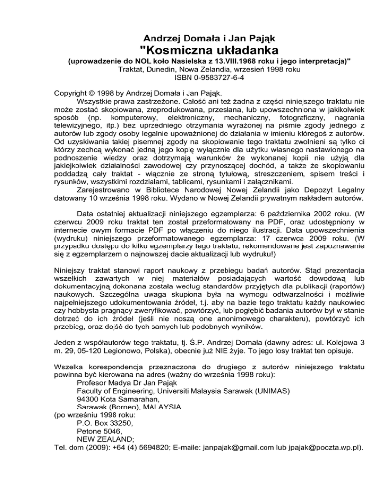 Andrzej Domała i Jan Pająk "Kosmiczna układanka (uprowadzenie do NOL koło Nasielska z 13.VIII.1968 roku i jego interpretacja)" Traktat, Dunedin, Nowa Zelandia, wrzesień 1998 roku ISBN 0-9583727-6-4 Copyright © 1998 by Andrzej Domała i Jan Pająk. Wszystkie prawa zastrzeżone. Całość ani też żadna z części niniejszego traktatu nie może zostać skopiowana, zreprodukowana, przesłana, lub upowszechniona w jakikolwiek sposób (np. komputerowy, elektroniczny, mechaniczny, fotograficzny, nagrania telewizyjnego, itp.) bez uprzedniego otrzymania wyrażonej na piśmie zgody jednego z autorów lub zgody osoby legalnie upoważnionej do działania w imieniu któregoś z autorów. Od uzyskiwania takiej pisemnej zgody na skopiowanie tego traktatu zwolnieni są tylko ci którzy zechcą wykonać jedną jego kopię wyłącznie dla użytku własnego nastawionego na podnoszenie wiedzy oraz dotrzymają warunków że wykonanej kopii nie użyją dla jakiejkolwiek działalności zawodowej czy przynoszącej dochód, a także że skopiowaniu poddadzą cały traktat - włącznie ze stroną tytułową, streszczeniem, spisem treści i rysunków, wszystkimi rozdziałami, tablicami, rysunkami i załącznikami. Zarejestrowano w Bibliotece Narodowej Nowej Zelandii jako Depozyt Legalny datowany 10 września 1998 roku. Wydano w Nowej Zelandii prywatnym nakładem autorów. Data ostatniej aktualizacji niniejszego egzemplarza: 6 października 2002 roku. (W czerwcu 2009 roku traktat ten został przeformatowany na PDF, oraz udostępniony w internecie owym formacie PDF po włączeniu do niego ilustracji. Data upowszechnienia (wydruku) niniejszego przeformatowanego egzemplarza: 17 czerwca 2009 roku. (W przypadku dostępu do kilku egzemplarzy tego traktatu, rekomendowane jest zapoznawanie się z egzemplarzem o najnowszej dacie aktualizacji lub wydruku!) Niniejszy traktat stanowi raport naukowy z przebiegu badań autorów. Stąd prezentacja wszelkich zawartych w niej materiałów posiadających wartość dowodową lub dokumentacyjną dokonana została według standardów przyjętych dla publikacji (raportów) naukowych. Szczególna uwaga skupiona była na wymogu odtwarzalności i możliwie najpełniejszego udokumentowania źródeł, t.j. aby na bazie tego traktatu każdy naukowiec czy hobbysta pragnący zweryfikować, powtórzyć, lub pogłębić badania autorów był w stanie dotrzeć do ich źródeł (jeśli nie noszą one anonimowego charakteru), powtórzyć ich przebieg, oraz dojść do tych samych lub podobnych wyników. Jeden z współautorów tego traktatu, tj. Ś.P. Andrzej Domała (dawny adres: ul. Kolejowa 3 m. 29, 05-120 Legionowo, Polska), obecnie już NIE żyje. To jego losy traktat ten opisuje. Wszelka korespondencja przeznaczona do drugiego z autorów niniejszego traktatu powinna być kierowana na adres (ważny do września 1998 roku): Profesor Madya Dr Jan Pająk Faculty of Engineering, Universiti Malaysia Sarawak (UNIMAS) 94300 Kota Samarahan, Sarawak (Borneo), MALAYSIA (po wrześniu 1998 roku: P.O. Box 33250, Petone 5046, NEW ZEALAND; Tel. dom (2009): +64 (4) 5694820; E-maile: [email protected] lub [email protected]). 2 STRESZCZENIE traktatu [3B] "Kosmiczna układanka", ISBN 0-9583727-6-4. Bardzo brzydkim zwyczajem UFOnautów jest że po każdym uprowadzeniu kogoś na pokład swego statku dokładnie wymazują tej osobie pamięć. Jeśli zaś czyjąś pamięć pozostawili niewymazaną, wówczas to oznacza, że mają w tym jakiś niecny interes. Pamięć z uprowadzenia UFOnauci pozwalają bowiem utrzymywać tylko tym osobom, którzy wykorzystani potem zostaną w jakichś celach propagandowych, kamuflarzowych, dla szerzenia konfuzji, mylenia naszej opinii publicznej, kierowania nas na błędne tory, itp. Jedną z osób które powtarzalnie uprowadzane były na pokład UFO, jednak u których pamięć z przeżytych tam doświadczeń nie zostawała potem wymazywana, jest współautor niniejszego traktatu, Pan Andrzej Domała. Dokładne raporty z przebiegu jego uprowadzeń przytoczone zostaną w rozdziale B niniejszego traktatu. Naszym zadaniem jest więc ustalenie jakież to dodatkowe i dobrze maskowane intencje UFOnautów kryją się za faktem pozostawienia u niego pamięci uprowadzeń. Bez wątpienia intencje te służyć jakoś mają tym naszym okupantom z UFO. Czy więc służą one poprzez umożliwienie siania konfuzji, fałszywej propagandy, a może denuncjacji, fałszerstwa i nieufności. Treść tego traktatu będzie starała się odkryć i wypunktować prawdziwe zamiary okupujących nas UFOnautów. Pan Andrzej Domała znajdował się w bardzo delikatnej sytuacji. Aby go do kogoś obrazowo porównać, to jest on jak wolny Polak podczas okupacji hitlerowskiej który zatrudniony został w biurze obozu koncentracyjnego. Z jednej strony jego przynależność do rasy ludzi z planety Ziemia nakłada na niego obowiązek dbania o nasze interesy. Z drugiej strony znajduje się on w mocy wroga, który jednym ruchem by w stanie go całkowicie zniszczyć (i zniszczył), a ponadto który zainstalował w jego ciele najróżniejsze urządzenia jakich zadanie nie jest całkowicie przez nas poznane a jakie najprawdopodobniej ukierunkowywały jego poglądy na takie jakie służą naszemu kosmicznemu okupantowi. W związku z delikatną sytuacją Pana Domały musimy więc być bardzo wyrozumiali w odniesieniu do jego działań i analizować je z dużej perspektywy biorąc pod uwagę wszelkie wpływające na nią czynniki. Musimy wszakże pamiętać, że inaczej się coś odbiera kiedy ma się poczucie bezpieczeństwa, inaczej zaś kiedy się naocznie doświadczy, że nawet mury i straże więzienne nie byłyby w stanie powstrzymać naszych okupantów gdyby ci zechcieli za coś się zemścić. Oczywiście, Pan Domała nie jest jedynym z obu współautorów tego traktatu, któremu UFOnauci zagrażają poprzez wkręcenie go w tryby swojej piekielnej maszyny. Ja również ponoszę wielkie ryzyko biorąc na siebie wspó