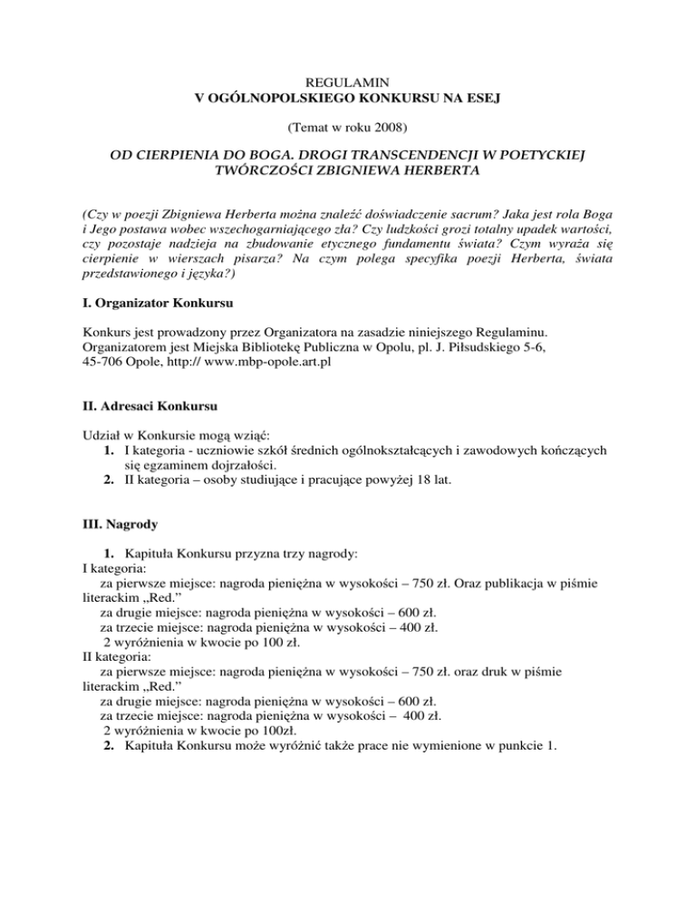 REGULAMIN V OGÓLNOPOLSKIEGO KONKURSU NA ESEJ (Temat w roku 2008) OD CIERPIENIA DO BOGA. DROGI TRANSCENDENCJI W POETYCKIEJ TWÓRCZOŚCI ZBIGNIEWA HERBERTA (Czy w poezji Zbigniewa Herberta można znaleźć doświadczenie sacrum? Jaka jest rola Boga i Jego postawa wobec wszechogarniającego zła? Czy ludzkości grozi totalny upadek wartości, czy pozostaje nadzieja na zbudowanie etycznego fundamentu świata? Czym wyraża się cierpienie w wierszach pisarza? Na czym polega specyfika poezji Herberta, świata przedstawionego i języka?) I. Organizator Konkursu Konkurs jest prowadzony przez Organizatora na zasadzie niniejszego Regulaminu. Organizatorem jest Miejska Bibliotekę Publiczna w Opolu, pl. J. Piłsudskiego 5-6, 45-706 Opole, http:// www.mbp-opole.art.pl II. Adresaci Konkursu Udział w Konkursie mogą wziąć: 1. I kategoria - uczniowie szkół średnich ogólnokształcących i zawodowych kończących się egzaminem dojrzałości. 2. II kategoria – osoby studiujące i pracujące powyżej 18 lat. III. Nagrody 1. Kapituła Konkursu przyzna trzy nagrody: I kategoria: za pierwsze miejsce: nagroda pieniężna w wysokości – 750 zł. Oraz publikacja w piśmie literackim „Red.” za drugie miejsce: nagroda pieniężna w wysokości – 600 zł. za trzecie miejsce: nagroda pieniężna w wysokości – 400 zł. 2 wyróżnienia w kwocie po 100 zł. II kategoria: za pierwsze miejsce: nagroda pieniężna w wysokości – 750 zł. oraz druk w piśmie literackim „Red.” za drugie miejsce: nagroda pieniężna w wysokości – 600 zł. za trzecie miejsce: nagroda pieniężna w wysokości – 400 zł. 2 wyróżnienia w kwocie po 100zł. 2. Kapituła Konkursu może wyróżnić także prace nie wymienione w punkcie 1. 2 IV. Czas trwania konkursu Konkurs rozpoczyna się 14.04.2008 r. i trwać będzie do 31.10.2008 r. (decyduje data stempla pocztowego). V. Zasady Konkursu 1. Warunkiem udziału w Konkursie jest zapoznanie się z Regulaminem. 2. Udział w Konkursie jest bezpłatny. 3. W Konkursie udział wezmą wyłącznie prace dotąd nigdzie nie publikowane drukiem i nie będące zwycięzcami innych konkursów. 4. Uczestnik Konkursu zgadza się na nieodpłatne wykorzystanie przez Organizatora nadesłanej pracy do celów promocyjnych, wydawniczych i innych zgodnych z działalnością Organizatora. 5. Każda praca powinna być podpisana godłem lub pseudonimem, dane osobowe (imię i nazwisko, dokładny adres z kodem pocztowym, telefon, e-mail) powinny zostać umieszczone w zamkniętej kopercie, oznaczonej tym samym godłem lub pseudonimem co praca. 6. Każdy uczestnik może wystąpić pod jednym godłem lub pseudonimem i może przesłać tylko jedną pracę konkursową. 7. Organizator nie bierze odpowiedzialności za naruszenie praw autorskich przez Uczestników Konkursu. Odpowiedzialność ta spoczywa na Uczestnikach Konkursu. 8. Rozstrzygnięcie Konkursu nastąpi 03.12.2008 r. i dokona tego Kapituła Konkursu w składzie: pracownik naukowy Uniwersytetu Opolskiego, - dr Adrian Gleń, pracownik naukowy Uniwersytetu Opolskiego, poeta, krytyk literacki - dr Jacek Gutorow, nauczyciel Kolegium Języków Obcych i LO V Opolu, poeta, krytyk literacki - mgr Sławomir Kuźnicki 9. Informacje o wynikach Konkursu będą dostępne na stronie internetowej: www.mbp-opole.art.pl 10. Zwycięzcy Konkursu oraz osoby, których prace zostaną wyróżnione będą powiadomieni telefonicznie lub pocztą elektroniczną. Pozostali uczestnicy nie będą indywidualnie powiadamiani. 11. Wszyscy laureaci zobowiązani są do osobistego odbioru nagrody. VI. Warunki techniczne 1. Praca musi być przygotowana w edytorze tekstowym, Times New Roman (wielkość czcionki 12, marginesy 2,5 cm, odstępy między wierszami 1,5cm), objętość tekstu nie może przekroczyć 5 stron maszynopisu i powinna być dostarczona w 4 egzemplarzach, oraz dodatkowo na nośniku elektronicznym (CD-ROM, dyskietka) . 2. Do Konkursu przyjmowane będą tylko te prace, które zostaną nadesłane w postaci maszynopisu. 3. Prace należy przesłać na adres: Miejska Biblioteka Publiczna pl. J.Piłsudskiego 5-6, 45-706 Opole z dopiskiem „ESEJ”. 4. Prace nie spełniające warunków technicznych nie będą uwzględniane w Konkursie.