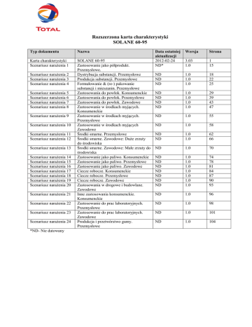 Rozszerzona karta charakterystyki SOLANE 60-95 Typ dokumentu Nazwa Karta charakterystyki Scenariusz narażenia 1 SOLANE 60-95 Zastosowanie jako półprodukt. Przemysłowe. Dystrybucja substancji. Przemysłowe Produkcja substancji. Przemysłowe Formułowanie & (re-) pakowanie substancji i mieszanin. Przemysłowe Zastosowania do powłok. Konsumenckie Zastosowania do powłok. Przemysłowe Zastosowania do powłok. Zawodowe Zastosowanie w środkach myjących. Konsumenckie Zastosowanie w środkach myjących. Przemysłowe Zastosowanie w środkach myjących Zawodowe Środki smarne. Przemysłowe Środki smarne. Zawodowe: Duże zrzuty do środowiska Środki smarne. Zawodowe: Małe zrzuty do środowiska Zastosowanie jako paliwo. Konsumenckie Zastosowanie jako paliwo. Przemysłowe Zastosowanie jako paliwo. Zawodowe Ciecze robocze. Konsumenckie Ciecze robocze. Przemysłowe Ciecze robocze. Zawodowe Zastosowania w drogowe i budowlane. Zawodowe Inne zastosowania konsumenckie. Konsumenckie Zastosowanie do prac laboratoryjnych. Przemysłowe Zastosowanie do prac laboratoryjnych. Zawodowe Produkcja i przetwórstwo gumy. Przemysłowe Scenariusz narażenia 2 Scenariusz narażenia 3 Scenariusz narażenia 4 Scenariusz narażenia 5 Scenariusz narażenia 6 Scenariusz narażenia 7 Scenariusz narażenia 8 Scenariusz narażenia 9 Scenariusz narażenia 10 Scenariusz narażenia 11 Scenariusz narażenia 12 Scenariusz narażenia 13 Scenariusz narażenia 14 Scenariusz narażenia 15 Scenariusz narażenia 16 Scenariusz narażenia 17 Scenariusz narażenia 18 Scenariusz narażenia 19 Scenariusz narażenia 20 Scenariusz narażenia 21 Scenariusz narażenia 22 Scenariusz narażenia 23 Scenariusz narażenia 24 *ND- Nie datowany Data ostatniej aktualizacji 2012-02-24 ND* Wersja Strona 3.03 1.0 1 15 ND ND ND 1.0 1.0 1.0 18 22 25 ND ND ND ND 1.0 1.0 1.0 1.0 29 39 43 47 ND 1.0 55 ND 1.0 58 ND ND 1.0 1.0 62 66 ND 1.0 70 ND ND ND ND ND ND ND 1.0 1.0 1.0 1.0 1.0 1.0 1.0 74 78 81 84 87 90 93 ND 1.0 96 ND 1.0 98 ND 1.0 101 ND 1.0 104 KARTA CHARAKTERYSTYKI Zgodna z rozporządzeniem WE 1907/2006 Karta rozszerzona: 1/108 SOLANE 60-95 Wersja: 3.03 Strona: 1/14 z dnia: 2012-02-24 Data aktualizacji wersji polskiej: 2012-04-24 Nr karty: 30060 1. IDENTYFIKACJA SUBSTANCJI/MIESZANINY I IDENTYFIKACJA PRZEDSIĘBIORSTWA 1.1 Identyfikator produktu Nazwa produktu: REACH, Nazwa rejestracyjna Numer rejestracji REACH: Nazwa handlowa: Substancja/Mieszanina: SOLANE 60-95 Hydrocarbons, C6-C7, n-alkanes, isoalkanes, cyclics, <5 % n-hexane 01-2119475514-35 Substancja 1.2 Istotne zidentyfikowane zastosowanie substancji lub mieszaniny oraz zastosowania odradzane Produkcja substancji. Dystrybucja substancji. Zastosowanie jako produkt Zastosowania zidentyfikowane: pośredni. Formułowanie i pakowanie (przepakowywanie) substancji i mieszanin. Zastosowanie w powłokach. Zastosowanie w środkach myjących. Zastosowanie jako paliwo. Ciecze robocze. Zastosowanie w drogownictwie i budownictwie. Inne zastosowania konsumenckie. Zastosowanie do prac laboratoryjnych. Produkcja i przetwórstwo gumy. 1.3 Dane dotyczące dostawcy karty charakterystyki Dostawca: Dalsze informacje, kontakt: Dostawca polski: TOTAL FLUIDES 24, cours Michelet 92800 PUTEAUX -FRANCE tel: + 33(0)1 41 35 40 00 Serwis QSE: tel: 01 41 35 33 64 e-mail: [email protected] Numer alarmowy, 24h/24h: +33 (0) 1 41 35 65 00 Wydział udzielający informacji: Total Polska Sp. z o.o Al. Jana Pawła II 80 00-175 Warszawa HSEQ tel. +48 22 481 93 87 Dział techniczny tel. +48 22 481 93 56 Dni robocze, w godzinach: 9-16 1.4 Numer telefonu alarmowego Telefony alarmowe do Informacji Toksykologicznej: Warszawa:(22) 619 66 54, Poznań: (61) 847 69 46 Gdańsk: (58) 682 04 04, Kraków: (12) 411 99 99 2. IDENTYFIKACJA ZAGROŻEŃ 2.1 Klasyfikacja substancji lub mieszaniny Rozporządzenie WE 1272/2008: Pełen tekst zwrotów H powołanych w tej sekcji jest podany w sekcji 2.2. Klasyfikacja Flammable liquids- Category 2- H225 Aspiration toxicity- Category 1 – H304 Skin corrosion/irritation- Category 2- H315 Specific target organ systemic toxicity (single exposure)- Category 3-H336 Chronic aquatic toxicity- Category 2-H411 Dyrektywa 67/548/EEC i 1999/45/EC: Pełen tekst zwrotów powołanych w tej sekcji jest podany w sekcji 16. Symbole F - Wysoce łatwopalny. Xn- Szkodliwy KARTA CHARAKTERYSTYKI Zgodna z rozporządzeniem WE 1907/2006 Karta rozszerzona: 2/108 SOLANE 60-95 Wersja: 3.03 Strona: 2/14 z dnia: 2012-02-24 Data aktualizacji wersji polskiej: 2012-04-24 Nr karty: 30060 N- Niebezpieczny dla środowiska Klasyfikacja F: R11 Xi: R38 Xn: R65, R67 N: R51/53 2.2 Elementy oznakowania Oznakowanie zgodnie z rozporządzeniem nr 1272/2008 Zawiera: Węglowodory, C6-C7, n-alkany, izoalkany, cykliczne, <5 % n-heksanu Nr WE: 921-024-6 Piktogramy zagrożenia Hasło ostrzegawcze: NIEBEZPIECZEŃSTWO Zwroty zagrożenia H: H225 - Wysoce łatwopalna ciecz i pary. H304 - Połknięcie i dostanie się przez drogi oddechowe może grozić śmiercią. H315- Działa drażniąco na skórę. H336 – Może powodować senność lub zawroty głowy. H411- Działa toksycznie na organizmy wodne, powodując długotrwałe zmiany. Zwroty ostrzegawcze: P210 – Przechowywać z dala od źródeł ciepła/iskrzenia/otwartego ognia/gorących powierzchni- Palenie wzbronione. P243 – Przedsięwziąć środki ostrożności zapobiegające statycznemu rozładowaniu. P403 + P235- Przechowywać w dobrze wentylowanym miejscu. Przechowywać w chłodnym miejscu. P280 – Stosować rękawice ochronne i ochronę oczu/twarzy. P301 + P310 – W PRZYPADKU POŁKNIĘCIA: Natychmiast skontaktować się z OŚRODKIEM ZATRUĆ lub lekarzem. P331- Nie wywoływać wymiotów. P273 – Unikać uwolnienia do środowiska. 2.3 Inne zagrożenia Właściwości fizyczne i chemiczne Wpływ na środowisko 3. Pary mogą tworzyć wybuchowe mieszaniny z powietrzem. Produkt może akumulować ładunki statyczne, przez co może nastąpić zapłon elektryczny. Nie odprowadzać do środowiska. SKŁAD/INFORM