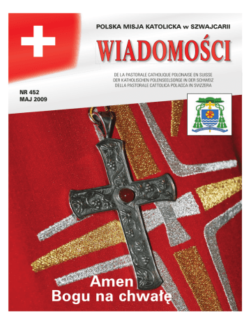 POLSKA MISJA KATOLICKA w SZWAJCARII DE LA PASTORALE CATHOLIQUE POLONAISE EN SUISSE DER KATHOLISCHEN POLENSEELSORGE IN DER SCHWEIZ DELLA PASTORALE CATTOLICA POLACCA IN SVIZZERA NR 452 MAJ 2009 Amen Bogu na chwa∏´ PIELGRZYMKA POLONII SZWAJCARSKIEJ DO SANKTUARIUM CZARNEJ MADONNY w EINSIEDELN 1 Czerwca 2009 r., g. 12.00 w drugi Dzieƒ Zielonych Âwiàt i w uroczystoÊç NajÊwi´tszej Maryi Panny, Matki KoÊcio∏a Uroczystej Mszy Êwi´tej przewodniczyç b´dzie i homili´ wyg∏osi Ksiàdz Biskup Dr Krzysztof Zadarko W czasie Mszy Êw. w Einsiedeln dzi´kowaç b´dziemy Panu Bogu za dar 25 lat kap∏aƒstwa ks. dr S∏awomira Kaweckiego, rektora PMK N a K o n c e r t G a l o w y Z e s p o ł u TRUBADURZY zaprasza do Genewy w dniu 29 maja 2009 roku pan Miros∏aw T∏okiƒski, by∏y pi∏karz „Widzewa” ¸ódê i reprezentant Polski Szczegó∏owe informacje na stronie 14 Na ok∏adce: Ks. Biskup Krzysztof Zadarko, Koszalin 25 kwietnia 2009. Fot 2 WIADOMOÂCI – NR 452 (MAJ 2009) Drodzy Czytelnicy! Tak du˝o dzieje si´ ostatnio w naszej Misji, ˝e aby informowaç Was o tym na bie˝àco, musimy nieustannie czuwaç nad zawartoÊcià „WiadomoÊci”; stàd niektóre artyku∏y uka˝à si´ w póêniejszym terminie, a inne, niestety, stracà na aktualnoÊci, za co serdecznie autorów przepraszamy. Na pierwszy plan wysuwajà si´ dwa donios∏e wydarzenia: nominacja ksi´dza arcybiskupa Zygmunta Zimowskiego na przewodniczàcego Papieskiej Rady ds. Duszpasterstwa S∏u˝by Zdrowia oraz Êwi´cenia biskupie w Koszalinie ksi´dza dr. Krzysztofa Zadarko, duszpasterza Polskiej Misji Katolickiej w Szwajcarii. Ksi´dzu arcybiskupowi Zygmuntowi Zimowskiemu z ca∏ego serca dzi´kujemy za ogromnà ˝yczliwoÊç i wsparcie w tym nie∏atwym czasie dla Polskiej Misji Katolickiej w Szwajcarii. Ufamy, ˝e ten trud nie pójdzie na marne. Gratulujemy nominacji i zapewniamy o naszej modlitewnej pami´ci. Dla naszej Misji bez wàtpienia Êwi´cenia biskupie w Koszalinie przejdà do historii. Wype∏niona po brzegi katedra koszaliƒska by∏a Êwiadectwem, jak bardzo diecezja potrzebuje biskupa Krzysztofa. Tym bardziej jesteÊmy wdzi´czni Panu Bogu za to, ˝e mogliÊmy mieç tego kap∏ana w naszej Misji przez prawie dwa lata. Nasze dzi´kczynienie za jego prac´ wyraziliÊmy w czasie Mszy Êwi´tej w Zurychu, w Poniedzia∏ek Wielkanocny. S∏owa wypowiedziane zw∏aszcza przez najm∏odszych na d∏ugo pozostanà w pami´ci uczestników. Ju˝ dzisiaj zapraszam wszystkich do Einsiedeln na 1 czerwca, gdzie ksiàdz biskup Krzysztof b´dzie przewodniczy∏ naszym uroczystoÊciom. S∏owa wdzi´cznoÊci w imieniu Polskiej Misji Katolickiej przekaza∏em tak˝e ksi´dzu biskupowi Ryszardowi Karpiƒskiemu podczas uroczystoÊci 50-lecia jubileuszu jego Êwi´ceƒ kap∏aƒskich w Lublinie, dnia 18 kwietnia bie˝àcego roku. Nie zapominamy podzi´kowaç tym wszystkim, którzy anga˝owali si´ w przeprowadzenie rekolekcji wielkopostnych oraz obchodów rocznicy Êmierci Jana Paw∏a II. W Êrodowiskach, gdzie pami´ç o Janie Pawle II tak szybko przemija, naszym obowiàzkiem jest pomyÊleç ju˝ teraz, w jaki sposób uczciç piàtà rocznic´ jego Êmierci. Wa˝nym wydarzeniem dla naszej Misji w tym czasie jest obecnoÊç ksi´dza profesora Józefa Naumowicza, który przez kilka miesi´cy b´dzie nas wspiera∏ w pracy duszpasterskiej. W tym kontekÊcie pragnà∏bym przekazaç wielkie s∏owa uznania i podzi´kowania tym wszystkim, którzy wspierajà nasz fundusz stypendialny i odpowiedzieli na nasz apel w Wielkà Sobot´. W sytuacji, kiedy coraz trudniej b´dzie pozyskaç kap∏anów do pracy w naszej Misji, zagadnienie funduszu stypendialnego nabiera szczególnego znaczenia. Miesiàc maj niesie ze sobà wspomnienie rocznicy uchwalenia Konstytucji 3 maja. Bardzo ucieszy∏ nas tekst, którego autor – pan Marco Schmid – zaprezentowa∏ punkt widzenia obcokrajowca, Szwajcara, na ten niezwyk∏y moment historii narodu polskiego. Piel´gnowanie pami´ci stawiamy sobie jako jeden z najwa˝niejszych celów w dzia∏alnoÊci naszej Misji i dlatego nie zapominamy o wielkim zwyci´stwie pod Monte Cassino. Wybierajàc si´ do W∏och, koniecznie trzeba zaplanowaç sobie czas na odwiedzenie tego miejsca. Tekst ojca J. Bocheƒskiego w tym numerze „WiadomoÊci” ma szczególnà wartoÊç, poniewa˝ jego autor by∏ Êwiadkiem i uczestnikiem tamtego wydarzenia sprzed 65 lat. Nie zapominamy tak˝e o 20. rocznicy wyborów 4 czerwca. I chocia˝ wiele szans zosta∏o zaprzepaszczonych, to dla historii Êwiata b´dzie to wa˝na data. By∏oby du˝ym b∏´dem, gdybyÊmy o tym nie pami´tali. 28 czerwca b´dziemy obchodziç 10-lecie naszej Polskiej Szko∏y w Lozannie. Chcemy pami´taç o tych, którzy przyczynili si´ do powstania tej szko∏y i jej rozwoju, a jednoczeÊnie zastanowiç si´ nad celami, jakim s∏u˝y, i ich realizacjà. Dlatego zwracam si´ z proÊbà o nadsy∏anie informacji zwiàzanych z powstawaniem, funkcjonowaniem oraz jej perspektywami. W archiwum Polskiej Misji Katolickiej w Marly kontynuowane sà prace nad porzàdkowaniem, i jednoczeÊnie opracowywaniem, najwa˝niejszych dokumentów. JesteÊmy wdzi´czni dyrekcji archiwów paƒstwowych za przys∏anie nam tak znakomitego fachowca w osobie pani Moniki Panter, kustosza Archiwum Paƒstwowego w Gdaƒsku. Najpóêniej w numerze wakacyjnym zamieÊcimy obszernà relacj´ z wyników jej prac i osiàgni´ç. Na poczàtku czerwca odb´dà si´ wybory do Parlamentu Europejskiego. Szkoda, ˝e frekwencja wyborcza przy tych wyborach jest bardzo mizerna. Trzeba sobie dobitnie uÊwiadomiç, ˝e parlament europejski stanowi prawo, które potem jest wcielane w ˝ycie przez poszczególne paƒstwa. Fakt: w Szwajcarii nic nie uczyniono od ostatnich wyborów, aby Polakom by∏o bli˝ej do punktu wyborczego, ale to jednak w miar´ mo˝liwoÊci warto zadaç sobie trud i wziàç w tych udzia∏ w tym wa˝nym wydarzeniu. Nie zapominamy, ˝e w maju jest tak˝e Dzieƒ Mat