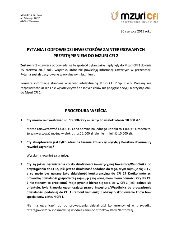Poniższe informacje stanowią własność intelektualną Mzuri CFI 2 Sp. z o.o. Prosimy nie