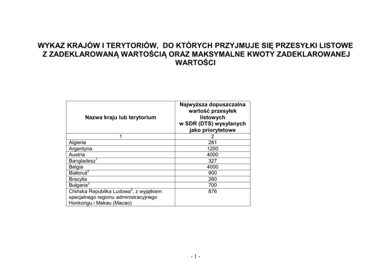 WYKAZ KRAJÓW I TERYTORIÓW, DO KTÓRYCH PRZYJMUJE SIĘ PRZESYŁKI LISTOWE Z ZADEKLAROWANĄ WARTOŚCIĄ ORAZ MAKSYMALNE KWOTY ZADEKLAROWANEJ WARTOŚCI Nazwa kraju lub terytorium Najwyższa dopuszczalna wartość przesyłek listowych w SDR (DTS) wysyłanych jako priorytetowe 1 Algieria Argentyna Austria Bangladesz1 Belgia Białoruś2 Brazylia Bułgaria3 Chińska Republika Ludowa4, z wyjątkiem specjalnego regionu administracyjnego Honkongu i Makau (Macao) 2 281 1200 4000 327 4000 900 260 700 876 -1- 1 Hongkong specjalny region administracyjny Makau (Macao) Chorwacja Cypr Czechy Dania Egipt Estonia5 Finlandia Francja6 Grecja Gruzja7 Hiszpania Holandia Indie Iran Irlandia (Eire) Islandia Japonia Kazachstan Korea Południowa (Republika) Litwa 8 Luksemburg Łotwa9 Macedonia Malezja Maroko Mołdawia (Mołdowa) Norwegia Nowa Zelandia10 2 4000 876 4000 4000 4000 4000 1000 4000 4000 630 4000 200 2668 440 1502 400 1056 4000 4000 4000 4000 1000 4000 1000 1633 550 3840 2000 4000 726 -2- 1 Pakistan Portugalia Rosja 11 Rumunia Senegal Serbia Singapur Słowacja Słowenia Syria Szwajcaria z Liechtensteinem12 Szwecja13 Tajlandia14 Tajwan Tunezja Turcja Ukraina15 Watykan Węgry Włochy 2 595 4000 4000 4000 600 4000 2000 843 4000 4000 1000 1000 1000 326 2500 653 4000 1630 4000 2530 1 nie można umieszczać przedmiotów podlegających opłatom celnym; maksymalna wartość wysyłanej waluty nie może być wyższa niż równowartość 200 USD; kwota tytułów płatniczych w walucie zagranicznej nie może przekroczyć równowartości 200 USD; 3 nie można umieszczać pieniędzy i innych przedmiotów wartościowych; 4 nie można umieszczać monet, banknotów, waluty, jakichkolwiek walorów płatnych na okaziciela i czeków podróżnych; 5 nie należy umieszczać pieniędzy; 6 maksymalna wartość handlowa zawartości nie może być wyższa niż 630 SDR; nie można deklarować wartości niższej niż wartość handlowa przesyłki; 2 -3- 7 nie można umieszczać pieniędzy, jakichkolwiek walorów płatnych na okaziciela, czeków podróżnych, platyny, złota lub srebra, przetworzonych lub nie, kamieni szlachetnych, klejnotów i innych przedmiotów wartościowych; 8 nie można umieszczać jakichkolwiek pieniędzy; 9 nie można umieszczać monet, banknotów, wartości na okaziciela i czeków podróżnych; 10 nie można umieszczać jakichkolwiek pieniędzy; 11 nie można umieszczać będących w obiegu banknotów, walorów (czeków) płatnych na okaziciela oraz waluty obcej. 12 zaleca się, aby nie umieszczać gotówki; 13 maksymalna wartość handlowa zawartości nie może być wyższa niż 1000 SDR; 14 nie można umieszczać banknotów; 15 maksymalna wartość wysyłanej do osób fizycznych waluty obcej i maksymalna wartość czeków w walucie obcej wystawionych na osoby prywatne nie może być wyższa niż 300 USD lub kwoty odpowiadającej 300 USD w innej walucie przeliczonej według oficjalnego kursu hrywny (UAH) ustalonego przez Narodowy Bank Ukrainy z dnia wystawienia deklaracji celnej; nie można przesyłać paszportów, dowodów tożsamości i książeczek pracy. SDR (SDR – w języku angielskim, DTS – w języku francuskim) – „Specjalne Prawa Ciągnienia” - jednostka walutowa Międzynarodowego Funduszu Walutowego stosowana w zagranicznym obrocie pocztowym. Kurs SDR do PLN (złotego polskiego) jest ustalany przez Narodowy Bank Polski i podawany w tabeli kursów walut tego banku. -4-