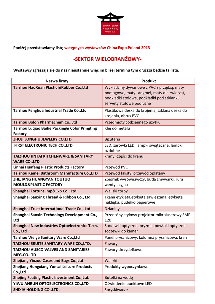 Poniżej przedstawiamy listę wstępnych wystawców China Expo Poland 2013 -SEKTOR WIELOBRANŻOWYWystawcy zgłaszają się do nas nieustannie więc im bliżej terminu tym dłuższa będzie ta lista. Nazwa firmy Taizhou HaoXuan Plastic &Rubber Co.,Ltd Produkt Wykładziny dywanowe z PVC z przędzą, maty podłogowe, maty Langmei, maty dla zwierząt, podkładki stołowe, podkładki pod szklanki, serwety stołowe podłużne Taizhou Fenghua Industrial Trade Co.,Ltd Plastikowa deska do krojenia, szklana deska do krojenia, obrus PVC Przedmioty codziennego użytku Klej do metalu Taizhou Bolon Pharmachem Co.,Ltd Taizhou Luqiao Baihe Packing& Color Pringting Factory ZHUJI LONGHU JEWELRY CO.LTD FIRST ELECTRONIC TECH CO.,LTD TAIZHOU JINTAI KITCHENWARE & SANITARY WARE CO.,LTD Linhai Huafeng Plastic Products Factory Taizhou Kemei Bathroom Manufacture Co.,LTD ZHEJIANG HUANGYAN TOUTUO MOULD&PLASTIC FACTORY Shanghai Fortuns Imp&Exp Co., Ltd Shanghai Sanxing Thread & Ribbon Co., Ltd Shanghai Trust International Trade Co., Ltd Shanghai Sanxin Technology Development Co., Ltd Shanghai New Industries Optoelectronics Tech. Co., Ltd Taizhou Weiye Sanitary Ware Co.,Ltd TAIZHOU SRUITE SANITARY WARE CO.,LTD. TAIZHOU AUSCO VALVES AND SANITARIES MFG.CO.LTD Zhejiang Yinzuo Cases and Bags Co.,Ltd Zhejiang Hongxiang Yuncai Leisure Products Co.,Ltd Zhejing Feating Plastic Investment Co.,Ltd. YIWU ANRUN OPTOELECTRONICS CO.,LTD SHIXIA HOLDING CO.,LTD. Biżuteria LED, żarówki LED, lampki świąteczne, lampki ozdobne krany, części do kranu Przewód PVC Przewód falisty, przewód oplatany Zbiornik wyrównawczy, butla zmywarki, rura wentylacyjna Walizki torby Tkana etykieta,etykieta zawieszana, etykieta naklejka, pudełko papierowe Dzianiny Przenośny stylowy projektor mikrolaserowy SMP120 Soczewki optyczne, pryzma, powłoki optyczne, soczewki do kamer Panel prysznicowy, kolumna prysznicowa, kran Zawory Zawory skrzydełkowe Walizki Produkty wypoczynkowe Butelki na wodę Oświetlenie punktowe LED Spryskiwacze JIAXING EK FASHION CO.,LTD ZHEJIANG QIAOQIAO INDUSTRIAL CO., LTD Zhejiang Chaoyu Tools Co.,Ltd Taizhou Chenda Sanitary Ware Co .,Ltd STANDARD VALVE CO.,LTD. JIEYANG FENGFA TOYS CO.,LTD Swetry tkane Wyposażenie placu zabaw Narzędzia ręczne Wanny zawór kulkowy skrzydełkowy, zawór kątowy, zawór kontrolny, kurek czerpalny, zawór chłodnicy, seria rur rozgałęźnych, mocowanie zaworu sztućce ze stali nierdzewnej JIEYANG SHUNHUI HARDWARE & PLASTIC PRODUCTS LTD. sztućce ze stali nierdzewnej JIEYANG CITY JIATAI INDUSTRY CO.LTD sztućce ze stali nierdzewnej JIEYANG XIONG YING HARDWARE & PLASTIC PRODUCTS CO.,LTD. sztućce ze stali nierdzewnej JIEYANG CITY SHUNXING STAINLESS STEEL MANFACTORY CO.,LTD Termosy ze stali nierdzewnej JIEYANG KANGJIEDENG ELECTRIC APPLIANCE CO.,LTD. suszarki do włosów JIEYANG CITY SHI HE ELECTRIC CO.,LTD suszarki do włosów JIEYANNG MINGSHIDA HARDWARE ELECTRICAL APPIANCE CO.,LTD suszarki do włosów, narzędzia do krojenia mięsa JIEYANG CITY XINDAMAN HARDWARE ELECTRIC APPLIANCE CO.,LTD suszarki do włosów JIEYANG CITY SHUNLI MOLD ELECTRIC APPLIANCE CO.,LTD. suszarki do włosów JIEYANG ZHENXING PLASTIC FACTORY CO.,LTD obuwie JIEYANG HONGXIN SHOES INDUSTRY CO.,LTD. obuwie JIEYANG CITY YIFA INDUSTRIES CO.,LTD obuwie JIEYANG CITY MAIST PLASTIC PRODUCT CO.,LTD obuwie JIEYANG CITY XIOCG XING SHOES CO.,LTD obuwie JIEYANG CITY RONGRUN PLASTIC CO.,LTD zabawki JIEYANG CITY RONGCHUANG HARDWARE ELECTRIC CO.,LTD. latarka LED Jieyang zhongnan plastic electronic industrial co., LTD latarka LED JIEYANG ZHONGCHENG GROUP CO.,LTD. ogniwa słoneczne JIEYANG ZHONGCHENG CHEMICAL INDUSTRIAL LTD ogniwa słoneczne GUANGDONG WANJIADA FAMLY EXPENSES ELECTRICAL EQUIPMENT CO.,LTD. wentylatory klimatyzacji JIEYANG CITY JIMNANYING HARDWARE ELECTRIC APPLIANCE IND.CO.,LTD wyroby z tworzyw sztucznych