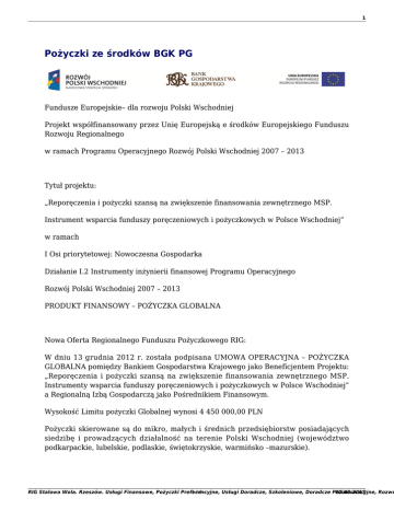 1 Pożyczki ze środków BGK PG Fundusze Europejskie– dla rozwoju Polski Wschodniej Projekt współfinansowany przez Unię Europejską e środków Europejskiego Funduszu Rozwoju Regionalnego w ramach Programu Operacyjnego Rozwój Polski Wschodniej 2007 – 2013 Tytuł projektu: „Reporęczenia i pożyczki szansą na zwiększenie finansowania zewnętrznego MSP. Instrument wsparcia funduszy poręczeniowych i pożyczkowych w Polsce Wschodniej” w ramach I Osi priorytetowej: Nowoczesna Gospodarka Działanie I.2 Instrumenty inżynierii finansowej Programu Operacyjnego Rozwój Polski Wschodniej 2007 – 2013 PRODUKT FINANSOWY – POŻYCZKA GLOBALNA Nowa Oferta Regionalnego Funduszu Pożyczkowego RIG: W dniu 13 grudnia 2012 r. została podpisana UMOWA OPERACYJNA – POŻYCZKA GLOBALNA pomiędzy Bankiem Gospodarstwa Krajowego jako Beneficjentem Projektu: „Reporęczenia i pożyczki szansą na zwiększenie finansowania zewnętrznego MSP. Instrumenty wsparcia funduszy poręczeniowych i pożyczkowych w Polsce Wschodniej” a Regionalną Izbą Gospodarczą jako Pośrednikiem Finansowym. Wysokość Limitu pożyczki Globalnej wynosi 4 450 000,00 PLN Pożyczki skierowane są do mikro, małych i średnich przedsiębiorstw posiadających siedzibę i prowadzących działalność na terenie Polski Wschodniej (województwo podkarpackie, lubelskie, podlaskie, świętokrzyskie, warmińsko –mazurskie). RIG Stalowa Wola. Rzeszów. Usługi Finansowe, Pożyczki Preferencyjne, -1/4Usługi Doradcze, Szkoleniowe, Doradcze Proinnowacyjne, 02.03.2017 Rozwó 2 RODZAJE POŻYCZEK - pożyczka na zasadach rynkowych - pożyczka na zasadach korzystniejszych niż rynkowe (pożyczka preferencyjna udzielana na zasadach pomocy de minimis) KWOTA POŻYCZKI: Łączna maksymalna wartość jednostkowych pożyczek udzielanych jednemu pożyczkobiorcy wynosi 445 000 zł. PRZEZNACZENIE POŻYCZEK 1. Środki finansowe z udzielonej przez Fundusz pożyczki mogą być wykorzystywane na finansowanie działalności gospodarczej mikro, małego lub średniego przedsiębiorcy, w tym w szczególności na: a) finansowanie inwestycji polegających m.in. na zakupie, budowie lub modernizacji obiektów produkcyjno – usługowo – handlowych, b) tworzenie nowych miejsc pracy, c) wdrażanie nowych rozwiązań technicznych lub technologicznych, d) zakup wyposażenia w maszyny, urządzenia, aparaty w tym także zakup środków transportu bezpośrednio związanych z celem realizowanego przedsięwzięcia, e) oraz inne cele gospodarcze przyczyniające się do rozwoju MŚP 2. Jednostkowe Pożyczki nie mogą by przeznaczone wyłącznie na pokrywanie bieżących kosztów prowadzenia działalności gospodarczej. 3. Jednostkowe Pożyczki nie mogą być przeznaczone na cele konsumpcyjne, spłatę innych pożyczek i kredytów zaciągniętych w innych instytucjach finansowych oraz spłatę zobowiązań publiczno – prawnych. Pożyczka na warunkach korzystniejszych niż rynkowe (pożyczka preferencyjna) nie może być przeznaczona na zakup środków transportu drogowego towarów podmiotom prowadzącym działalność gospodarczą w zakresie drogowego transportu. Pożyczka preferencyjna udzielona zostaje na mocy Rozporządzenia Ministra Rozwoju Regionalnego z dnia 13 września 2011r. w sprawie udzielania przez Polską Agencję Rozwoju Przedsiębiorczości pomocy finansowej na rozwój instrumentów inżynierii finansowej w ramach Programu Operacyjnego Rozwój Polski Wschodniej (Dz. U. z 2011 nr 210 poz. 1255). RIG Stalowa Wola. Rzeszów. Usługi Finansowe, Pożyczki Preferencyjne, -2/4Usługi Doradcze, Szkoleniowe, Doradcze Proinnowacyjne, 02.03.2017 Rozwó 3 Pożyczka preferencyjna udzielona jest jako pomoc de minimis na warunkach określonych w Rozporządzeniu Komisji nr 1998/2006 z dnia 15 grudnia 2006r. Warunki: • spłata przez okres do 60 miesięcy; • możliwość skorzystania z 6-miesięcznej karencji na spłatę kapitału; • oprocentowanie: • na warunkach korzystniejszych niż rynkowe (pożyczka preferencyjna) – 2% • na warunkach rynkowych – od 5,80% w skali roku (dla rozpoczynających działalność od 8,80% w skali roku) (oprocentowanie ustalane jest zgodnie z wytycznymi nt. ustalania stóp referencyjnych); • prowizja – jednorazowo od 0,8% kwoty pożyczki; • zabezpieczeniem spłaty pożyczki jest weksel in blanco wraz z deklaracją wekslową. Ponadto zabezpieczenie może mieć formę: hipoteki, zastawu, poręczenia osób fizycznych lub prawnych, poręczenie funduszy doręczeniowych, przewłaszczenia na zabezpieczenie, przelewu (cesji) wierzytelności, kaucji lub innych form zabezpieczenia przewidzianych przez prawo. Wartość proponowanego zabezpieczenia powinna być dostosowana do wnioskowanej kwoty pożyczki. Szczegółowe warunki dotyczące pożyczek znajdują się w Regulaminie Regionalnego Funduszu Pożyczkowego RIG (link do Regulaminu BGK PG). Zespół Regionalnego Funduszu Pożyczkowego RIG BGK PG: Dyrektor RIG: Jolanta Budkowska Tel: 15 844 03 57 e-mail: [email protected] Specjaliści: Jolanta Garbacz Tel: 15 844 03 57, 15 813 84 33 e-mail: [email protected], [email protected] RIG Stalowa Wola. Rzeszów. Usługi Finansowe, Pożyczki Preferencyjne, -3/4Usługi Doradcze, Szkoleniowe, Doradcze Proinnowacyjne, 02.03.2017 Rozwó 4 Analityk ds. rozliczeń Marta Partyka Tel: 15 813 84 33 e-mail: [email protected] godziny pracy: poniedziałek – piątek – 7:30 – 15:30. RIG Stalowa Wola. Rzeszów. Usługi Finansowe, Pożyczki Preferencyjne, -4/4Usługi Doradcze, Szkoleniowe, Doradcze Proinnowacyjne, 02.03.2017 Rozwó