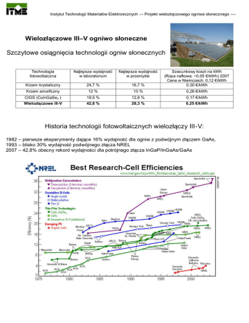 Instytut Technologii Materiałów Elektronicznych --- Projekt wielozłączowego ogniwa słonecznego ---- Wielozłączowe III–V ogniwo słoneczne Szczytowe osiągnięcia technologii ogniw słonecznych Technologia fotowoltaiczna Najlepsza wydajność w laboratorium Najlepsza wydajność w przemyśle Krzem krystaliczny 24,7 % 16,7 % Szacunkowy koszt na kWh (Ropa naftowa: ~0,05 €/kWh) 2007 Cena w Niemczech: 0,12 €/kWh 0,30 €/kWh Krzem amorficzny 12 % 10 % 0,26 €/kWh CIGS (CuInGaSe2 ) 19,5 % 12,6 % 0,17 €/kWh Wielozłączowe III-V 42,8 % 28,3 % 0,25 €/kWh Historia technologii fotowoltaicznych wielozłączy III-V: 1982 – pierwsze eksperymenty dające 16% wydajność dla ogniw z podwójnym złączem GaAs, 1993 – blisko 30% wydajność podwójnego złącza NREL 2007 – 42,8% obecny rekord wydajności dla potrójnego złącza InGaP/InGaAs/GaAs Instytut Technologii Materiałów Elektronicznych --- Projekt wielozłączowego ogniwa słonecznego ---- 1. Tradycyjne ogniwo z pojedynczym złączem Światło słoneczne Złącze p-n Jak to działa: + Teoretyczna granica wydajności ok. 31 % 2. Ogniwo z potrójnym złączem Światło słoneczne Sub ogniwo 1 Sub ogniwo 2 Sub ogniwo 3 Koncentracja światła do ok. 500 słońc zwiększa wydajność i wysoce obniża koszty: tylko 10-20 cm2 kosztu ogniwa na 1 m2 promieniowania słonecznego jest wymagane. Każde z sub ogniw przetwarza inną część widma promieniowania słonecznego. Teoretyczna graniczna wydajność złącza wynosi 51,5 – 56% i zależy od koncentracji światła. Wydajność kwantowa potrójnego InGaP/GaAs/InGaAs ogniwa słonecznego: złącza Instytut Technologii Materiałów Elektronicznych --- Projekt wielozłączowego ogniwa słonecznego ---- Propozycja badań ITME 1. Potrójne złącze InGaP/GaAs/InGaAs ogniwa słonecznego wytworzone metodą MOCVD GaAs Górne złącze 1 μm In0.5Ga0.5P ogniwo Środkowe złącze 3 μm GaAs ogniwo Warstwa przezroczysta 2 μm warstwa przejściowa (Zmienny InxGa1-xP) Dolne złącze 3 μm In0.3Ga0.7As ogniwo Podłoże Si Złącza tunelowe Obecnie, tego typu ogniwa osiągają 39% wydajność w laboratorium. Możliwe są pewne modyfikacje, np.: obniżenie zawartości In w górnym InGaP złączu, stosowanie InxGa1-xP lub InxGa1-xAs zamiast GaAs w środkowym złączu, lub zwiększenie zawartości In w warstwach In0,3Ga0,7As w dolnym złączu i innych 2. Obszar badań: - Wzrost metodą MOCVD płytek InGaP/InGaAs/Ge łączących ogniwa Struktura (z wyjątkiem podłoża Ge) jest podobna do górnego złącza. Ten typ ogniwa osiągnął 42,8% wydajności tego roku. - Wielozłączowe InGaN ogniwo słoneczne Przerwa energetyczna półprzewodnika In xGa1-xN zawiera się w zakresie od 0,7 do 3,5 eV, obejmując cały zakres widma słonecznego, które to można przetworzyć z efektywnością powyżej 50%. 3. Wzrost struktur epitaksjalnych SiC dla przetwarzania energii i przyrządów transportujących Węglik krzemu jest materiałem z ogromnym potencjałem dla przyrządów elektronicznych mocy i wysokotemperaturowej elektroniki. SiC może wytrzymać różnice napięcia (lub pole elektryczne) ponad osiem razy większe niż Si lub GaAs bez doznania przebicia lawinowego. To wysokie pole przebicia elektrycznego umożliwia wytworzenie przyrządów bardzo wysokich napięć oraz wysokiej mocy takich, jak: diody, tranzystory mocy, tyrystory mocy i ograniczniki skoków napięcia, jak również mikrofalowe przyrządy wysokiej mocy.