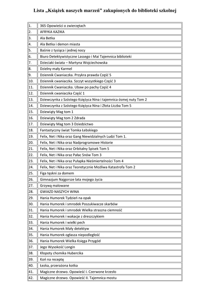 Lista „Książek naszych marzeń” zakupionych do biblioteki szkolnej 1. 365 Opowieści o zwierzętach 2. AFRYKA KAZIKA 3. Ala Betka 4. Ala Betka i demon miasta 5. Baśnie z tysiąca i jednej nocy 6. Biuro Detektywistyczne Lassego i Mai Tajemnica biblioteki 7. Dzieciaki świata – Martyna Wojciechowska 8. Dzielny mały Karmel 9. Dziennik Cwaniaczka. Przykra prawda Część 5 10. Dziennik cwaniaczka. Szczyt wszystkiego Część 3 11. Dziennik Cwaniaczka. Ubaw po pachy Część 4 12. Dziennik cwaniaczka Część 1 13. Dziewczynka z Szóstego Księżyca Nina i tajemnica ósmej nuty Tom 2 14. Dziewczynka z Szóstego Księżyca Nina i Złota Liczba Tom 5 15. Dziewiąty Mag tom 1 16. Dziewiąty Mag tom 2 Zdrada 17. Dziewiąty Mag tom 3 Dziedzictwo 18. Fantastyczny świat Tomka Łebskiego 19. Felix, Net i Nika oraz Gang Niewidzialnych Ludzi Tom 1. 20. Felix, Net i Nika oraz Nadprogramowe Historie 21. Felix, Net i Nika oraz Orbitalny Spisek Tom 5 22. Felix, Net i Nika oraz Pałac Snów Tom 3 23. Felix, Net i Nika oraz Pułapka Nieśmiertelności Tom 4 24. Felix, Net i Nika oraz Teoretycznie Możliwa Katastrofa Tom 2 25. Figa tęskni za domem 26. Gimnazjum Najgorsze lata mojego życia 27. Grzywą malowane 28. GWIAZD NASZYCH WINA 29. Hania Humorek Tydzień na opak 30. Hania Humorek i smrodek Poszukiwacze skarbów 31. Hania Humorek i smrodek Wielka straszna ciemność 32. Hania Humorek i wakacje z dreszczykiem 33. Hania Humorek i wielki pech 34. Hania Humorek Mały detektyw 35. Hania Humorek ogłasza niepodległość 36. Hania Humorek Wielka Księga Przygód 37. Jego Wysokość Longin 38. Kłopoty chomika Hubercika 39. Koń na receptę 40. Łezka, przerażona kotka 41. Magiczne drzewo. Opowieść I. Czerwone krzesło 42. Magiczne drzewo. Opowieść II. Tajemnica mostu 43. MAPY Obrazkowa podróż po lądach, morzach i kulturach świata 44. Martynka W górach Moje czytanki 45. Martynka W szkole Moje czytanki 46. Martynka W zoo Moje czytanki 47. Martynka Zaczynam czytać z Martynką. Ulubione opowieści 48. Na ratunek Rufiemu! 49. Niespodzianki chomika Hubercika 50. Nowe szaty cesarza i inne baśnie 51. OSKAR I PANI RÓŻA 52. Paddington 53. Paddington Kolejne historie 54. PAN KULECZKA 55. PAN KULECZKA 2 Skrzydła 56. PAN KULECZKA 3 Spotkanie 57. PAN KULECZKA 4 Światło 58. PAN KULECZKA 5 Dom 59. PAN KULECZKA 6 Radość 60. Piaskowy Wilk 61. Piaskowy Wilk i prawdziwe wymysły 62. Piotruś Pan 63. Porwanie małej Mili 64. Przygody kota Filemona 65. Przyjaźnie chomika Hubercika Świat Chomika Hubercika 66. Rafik został sam 67. Reks szczeniak z wakacji 68. Samotne święta Oskara 69. Seria niefortunnych zdarzeń. księga 1. Przykry początek 70. Seria niefortunnych zdarzeń. księga 2. Gabinet gadów 71. Seria niefortunnych zdarzeń. księga 3. Ogromne okno 72. Seria niefortunnych zdarzeń. księga 4. Tartak tortur 73. Seria niefortunnych zdarzeń. księga 5. Akademia antypatii 74. Tajemnica meczu Biuro Detektywistyczne Lassego i Mai 75. Tajemnica miłości Biuro Detektywistyczne Lassego i Mai 76. Tajemnica pływalni Biuro Detektywistyczne Lassego i Mai 77. Tajemnica szkoły Biuro Detektywistyczne Lassego i Mai 78. Tajemnica urodzin Biuro detektywistyczne Lassego i Mai 79. Tajemnica zwierząt Biuro Detektywistyczne Lassego i Mai 80. Trylogia Igrzyska śmierci 3 tomy w 1 81. Ulubieniec całej klasy Świat Chomika Hubercika 82. Wróć Alfiku! 83. Zagubiona w śniegu 84. Zaopiekuj się mną. Zimowy wilk 85. Złodziejka książek 86. Saga Zmierzch 87. Zosia z ulicy Kociej 88. Zosia z ulicy Kociej. Na wiosnę 89. Zosia z ulicy Kociej. Na wycieczce 90. Zosia z ulicy Kociej. Na zimę 91. Zwierzaki świata - – Martyna Wojciechowska 92. Kroniki Archeo Tajemnica klejnotu Nefertiti 93 SEKRET WIELKIEGO MISTRZA KRONIKI ARCHEO 93 Kroniki Archeo Przepowiednia Synów Słońca 94 Kroniki Archeo Klątwa złotego smoka 95 Kroniki Archeo Zagadka Diamentowej Doliny 96 Kroniki Archeo Szyfr Jazona 97 Zuźka D. Zołzik żegna zerówkę 98 Zuźka D. Zołzik pierwszakiem 99 Zuźka D. Zołzik imprezuje 100 Zuźka D. Zołzik świruje 101 SŁUP SOLI 102 Wiedźmin - komiks 103 Momo, ty łobuzie! 104 Magiczne drzewo Świat Ogromnych 105 Magiczne Drzewo Cień smoka 106 Magiczne Drzewo Pojedynek 107 Angry Birds – Mały pomocnik Świętego Mikołaja 108 Angry Birds – Przyjaciele o pięknych piórkach 109 PERCY JACKSON I – złodziej pioruna 110 PERCY JACKSON I – morze potworów 111 PERCY JACKSON I – klątwa tytana 112 PERCY JACKSON I – bitwa w labiryncie 113 PERCY JACKSON I – ostatni olimpijczyk 114 10 niesamowitych przygód Neli 115 Nela na tropie przygód 116 Nela na trzech kontynentach. Podróże w nieznane. 117 Nela i tajemnice świata. 118 Kuba i Buba czyli awantura do kwadratu 119 Kuba i Buba w szpitalu 120 Przygody Koziołka Matołka cz. 1 121 Przygody Koziołka Matołka cz. 2 122 Przygody Koziołka Matołka cz. 3 123 Przygody Koziołka Matołka cz. 4 124 Jak pomyślę tak zrobię 125 Batman – zielone miasto 126 Batman – podwójny kłopot 127 Batman – urodzinowa wpadka 128 Batman – zbrodnia naśladowcza 129 Miłość czy chciwość 130 Marek chłopiec, który miał marzenia 131 Świętujemy – 12 opowiadań 132 Najwyższa góra świata