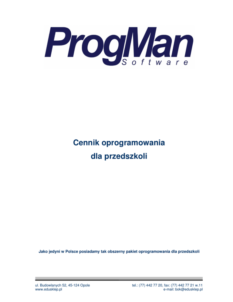 Cennik oprogramowania dla przedszkoli Jako jedyni w Polsce posiadamy tak obszerny pakiet oprogramowania dla przedszkoli ul. Budowlanych 52, 45-124 Opole www.edusklep.pl tel.: (77) 442 77 20, fax: (77) 442 77 21 w.11 e-mail: [email protected] CENNIK ważny do 31.12..2008 Systemy dla przedszkoli: Programy przeznaczone dla przedszkoli: Ewidencja dzieci + Kwitariusz dla Windows© 98 / ME / NT / 2000 / XP netto brutto 790 963,80 Program służy do ewidencji dzieci w przedszkolu i ich rozliczeń finansowych. System umożliwia również prowadzenie ewidencji rodziców dziecka lub jego opiekunów. W programie można wpisywać informacje na temat obecności dziecka oraz przypisać mu spożywane przez niego posiłki. System prowadzi pełne comiesięczne rozliczanie finansowe dziecka. Kwitariusz 190 231,80 Program obejmuje ewidencję kwitariuszy. W programie istnieje możliwość wydruku kwitów za dokonane wpłaty oraz sporządzania raportów kwitariuszy dla różnych rodzajów opłat. Kadry 620 756,40 Program umożliwia pełną ewidencję danych o pracowniku, przeliczanie stażu na podstawie wpisanego przebiegu pracy oraz eksport formularzy zgłoszeniowych do programu Płatnik. W programie istnieje możliwość wydruku kilkudziesięciu zdefiniowanych druczków kadrowych i łatwej zmiany podstaw prawnych; system zawiera gotowe zestawienia i generator wydruków. Płace 1 190 1 451,80 System nalicza i ewidencjonuje płace pracowników z każdego miesiąca dla następujących list płac: składników płac, potrąceń, zasiłków, składek ZUS i danych dodatkowych. Eksportuje dane do programu Płatnik i automat.przenosi główne informacje o wypłacie na następny miesiąc. Tworzy wszystkie potrzebne wydruki (listy płac, odcinki dla pracowników, karty wynagrodzeń, Pity: 4,11,40 itd.). Zlecone 290 353,80 Program ewidencjonuje dane osobowe zleceniobiorców i wszelkiego rodzaju wypłaty rozliczane przez PIT 8A i 8B. W systemie można zdefiniować rodzaj wypłaty związany z różnymi sposobami naliczania podatku i składek ZUS. Przelewy 90 109,80 Program obejmuje ewidencję przelewów i wpłat. W programie istnieje możliwość wydruku aktualnych formularzy przelewów i wpłat akceptowanych przez wszystkie banki i pocztę. Finanse 1 090 1 329,80 Program został specjalnie zaprojektowany dla jednostek, zakładów budżetowych oraz innych jednostek sektora finansów publicznych w celu prowadzenia pełnej księgowości oraz obsługi sprawozdawczości budżetowej i finansowej. Program uwzględnia specyfikę rachunkowości budżetowej, zawiera kartotekę paragrafów oraz kont. Umożliwia dopisywanie, poprawianie oraz księgowanie dokumentów. Pracę z programem można zacząć w każdym dowolnym momencie roku obrachunkowego. System zawiera wydruki wymagane przepisami ustawy o rachunkowości, sprawozdania budżetowe Rb 23, 27, 27S, 28, 28S, 30, 34, N, Z, ST oraz bilans, rachunek zysków i strat, zestawienie zmian w funduszu jednostki. Kasa 350 427,00 Program umożliwia pełną obsługę obrotu gotówkowego w jednostce lub przedsiębiorstwie w zakresie jednej lub wielu kas. W systemie można wykonać następujące operacje kasowe: wpłata, wypłata, pobranie zaliczki, rozliczenie zaliczki, zapłata za fakturę, rachunek. Istnieje możliwość wydrukowania dokumentu KP, KW oraz raportu kasowego. Program zawiera opcję bilansowania kasy oraz wyszukiwania operacji kasowych. Pracę w systemie można rozpocząć w dowolnym momencie. Program współpracuje z modułem Finanse DDJ Dyplomy 40,17 49,00 Program zawiera gotowe szablony z treścią, daje możliwość zaprojektowania własnych szablonów, pozwala na podgląd przygotowanego dyplomu przed wydrukiem (tekst wraz z tłem), jest zintegrowany ze wzorami dyplomów oferowanych przez ProgMan Software. Standardowo do programu Dyplomy dołączane są czyste druki dyplomów na różne okazje w ilości 100 sztuk ( 4 rodzaje po 25 szt.). Istnieje także możliwość zakupu dodatkowych druków dyplomów od ProgMan Software. 2 CENNIK ważny do 31.12..2008 Systemy dla przedszkoli: Programy przeznaczone dla przedszkoli: Magazyn dla Windows© 98 / ME / NT / 2000 / XP netto brutto 350 427,00 Program obsługuje kartoteki magazynów, dokonywanie wszelkich operacji na danym towarze oraz bieżący wydruk wszelkich niezbędnych druków, zestawień. Stołówka + Magazyn 620 756,40 Program zawiera wszystkie elementy programu „Magazyn”, dodatkowo umożliwia definiowanie dziennych zapotrzebowań, wydruk jadłospisu i zapotrzebowania z automatycznie wyliczonym przeciętnym kosztem, obliczanie kalorii, definiowanie posiłków. Wyposażenie 620 756,40 Program został specjalnie zaprojektowany w celu prowadzenia ewidencji wyposażenia, środków trwałych, a także wartości niematerialnych i prawnych. Program usprawnia proces inwentaryzacji w jednostce, automatycznie nalicza amortyzację, umożliwia obsługę czytnika kodów kreskowych, pracę na wielu stanowiskach, pozwala na generowanie niezbędnych wydruków takich jak np. księgi inwentarzowe, stan wyposażenia, tabele amortyzacyjne, karty środków trwałych, wykazy różnic inwentaryzacyjnych, protokoły przekazania, dokumenty przyjęcia, przemieszczenia czy też likwidacji środka. System umożliwia eksport danych do programu SIO. Zamówienia publiczne 350 427,00 Program służy do ewidencjonowania dokumentów zakupów oraz umożliwia kontrolę ich wysokości w nawiązaniu do przepisów ustawy o zamówieniach publicznych. Na podstawie wprowadzonych dokumentów program przygotowuje rejestr zakupu oraz deklarację VAT. W programie istnieje możliwość założenia grup funduszy według numerów CPV, wprowadzenia kwoty planu dla każdej z nich oraz kontroli ich wykonania. System zawiera wydruki wg towarów, faktur, kontrahentów, numerów CPV. Arkusz organizacyjny dla przedszkoli 325 396,50 Program specjalnie skonstruowany i dostosowany do tworzenia projektu organizacyjnego dla przedszkoli. Pozwala na wprowadzenie nauczycieli, o