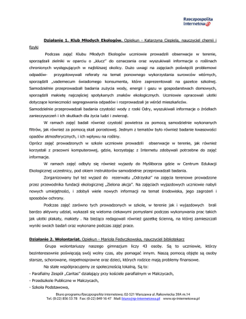 Działanie 1. Klub Młodych Ekologów. Opiekun - Katarzyna Ciepiela, nauczyciel chemii i fizyki Podczas zajęć Klubu Młodych Ekologów uczniowie prowadzili obserwacje w terenie, sporządzali zielniki w oparciu o „klucz” do oznaczania oraz wyszukiwali informacje o roślinach chronionych występujących w najbliższej okolicy. Dużo uwagi na zajęciach poświęcili problemowi odpadów- przygotowywali referaty na temat ponownego wykorzystania surowców wtórnych, sporządzili „vademecum świadomego konsumenta, które zaprezentowali na gazetce szkolnej. Samodzielnie przeprowadzali badania zużycia wody, energii i gazu w gospodarstwach domowych, sporządzili makietę najczęściej spotykanych znaków ekologicznych. Uczniowie opracowali ulotki dotyczące konieczności segregowania odpadów i rozprowadzali je wśród mieszkańców. Samodzielnie przeprowadzali badania czystości wody z rzeki Odry, wyszukiwali informacje o źródłach zanieczyszczeń i ich skutkach dla życia ludzi i zwierząt. W ramach zajęć badali również czystość powietrza za pomocą samodzielnie wykonanych filtrów, jak również za pomocą skali porostowej. Jednym z tematów było również badanie kwasowości opadów atmosferycznych, i ich wpływu na rośliny. Oprócz zajęć prowadzonych w szkole uczniowie prowadzili obserwacje w terenie, jak również korzystali z pracowni komputerowej, gdzie, korzystając z Internetu zdobywali potrzebne do zajęć informacje. W ramach zajęć odbyły się również wyjazdy do Myśliborza gdzie w Centrum Edukacji Ekologicznej uczestnicy, pod okiem instruktorów samodzielnie przeprowadzali badania. Zorganizowany był też wyjazd do rezerwatu „Odrzyska” na zajęcia terenowe prowadzone przez przewodnika fundacji ekologicznej „Zielona akcja”. Na zajęciach wyjazdowych uczniowie nabyli nowych umiejętności, i zdobyli wiele nowych informacji na temat środowiska, jego zagrożeń i sposobów ochrony. Podczas zajęć zarówno tych prowadzonych w szkole, w terenie jak i wyjazdowych brali bardzo aktywny udział, wykazali się wieloma ciekawymi pomysłami podczas wykonywania prac takich jak ulotki plakaty, makiety . Na bieżąco redagowali również gazetkę ścienną, na której zamieszczali wyniki swoich badań oraz wykonane podczas zajęć prace. Działanie 2. Wolontariat. Opiekun - Mariola Fedyczkowska, nauczyciel bibliotekarz Grupa wolontariuszy naszego gimnazjum liczy 43 osoby. Są to uczniowie, którzy bezinteresownie poświęcają swój wolny czas, aby pomagać innym. Naszą pomocą objęte są osoby starsze, schorowane, niepełnosprawne oraz dzieci, których rodzice mają problemy finansowe. Na stałe współpracujemy ze społecznością lokalną. Są to: - Parafialny Zespół „Caritas” działający przy kościele parafialnym w Malczycach, - Przedszkole Publiczne w Malczycach, - Szkoła Podstawowa, - Gminny Ośrodek Pomocy Społecznej, - Ochotnicza Straż Pożarna, - Dom Pomocy Społecznej „Caritas”. Młodzież regularnie roznosi produkty żywnościowe do osób starszych. Paczki z żywnością są dość ciężkie, ale uczniowie widzą sens swojej pracy. Zwykłe słowo dziękuję od osoby obdarowanej wynagradza im ich wysiłek. Żywność rozdzielana jest przez członków Zespołu „Caritas”, a wolontariusze zawsze służą pomocą przy jej roznoszeniu. Przed Mikołajkami wolontariusze zorganizowali zbiórkę słodyczy. Przy pomocy Gminnego Ośrodka Pomocy Społecznej ustaliliśmy listę dzieci, których rodzice borykają się z poważnymi trudnościami finansowymi. Przygotowano 11 dużych słodkich paczek i rozwieziono je na terenie całej gminy. Samochodu nieodpłatnie użyczyła nam Straż Pożarna. W każdym domu uczniowie śpiewali piosenki i rozmawiali z dziećmi. Radość na buziach najmłodszych utwierdziła nas w celowości takich działań. Uwrażliwiła też młodzież na biedę innych ludzi. Tego samego dnia grupa wolontariuszy odwiedziła Publiczne Przedszkole w Malczycach. Jeden z uczniów przebrał się za św. Mikołaja i rozdawał paczki dla wszystkich dzieci. Pozostałe wolontariuszki były Śnieżynkami, które czytały dzieciom bajki, bawiły się z nimi i organizowały konkursy. Okazją do wymiany doświadczeń było spotkanie z okazji Międzynarodowego Dnia Wolontariusza we Wrocławiu. Uczniowie ze szkół gimnazjalnych i ponadgimnazjalnych rozmawiali o trudach i radościach pracy wolontariusza. Kolejną akcją przygotowaną przez wolontariat było zorganizowanie Dnia Babci i Dziadka w Domu Pomocy Społecznej „Caritas”. Każdy wolontariusz własnoręcznie przygotował laurkę i dnia 21 stycznia uroczyście wręczyliśmy je wszystkim pensjonariuszom. Łzy wzruszenia w oczach starszych ludzi były wymownym znakiem potrzeby organizowania takich akcji. Regularnie czytane są książki w przedszkolu w Malczycach. Wybierane są teksty dla każdej grupy wiekowej. Po lekturze osoby czytające organizują konkursy ze znajomości przeczytanej książki. Zawsze mają też słodycze dla wszystkich dzieci. W ramach akcji Malczyce czytają dzieciom do czytania książek zapraszane są także znane osoby z naszej gminy. Do tej pory czytali przedstawiciele kościoła, Służby Zdrowia i dyrekcje szkół. Było to nowe doświadczenie zarówno dla dzieci jak i dorosłych. Wszyscy zgodnie stwierdzili, że sztuką jest zainteresować najmłodszych do wysłuchania tekstów w całości. Na terenie naszej gminy jest wiele osób niepełnosprawnych. W związku z tym postanowiliśmy im pomóc. Trzy wolontariuszki odwiedzają chorą koleżankę Anię, która porusza się na wózku inwalidzkim. Od rodziców Ani wiem, że te wizyty są zawsze wyczekiwane i choć na chwilę pozwalają ich córce oderwać się od trudów codziennego życia. Wolontariuszki plotkują z Anią o chłopakach, słuchają muzyki i zabierają ją na spacery. Jest to również chwila wytchnienia dla jej rodziców. Nasi wolontariusze mają jeszcze mnóstwo pomysłów. Już wiedzą, gdzie 