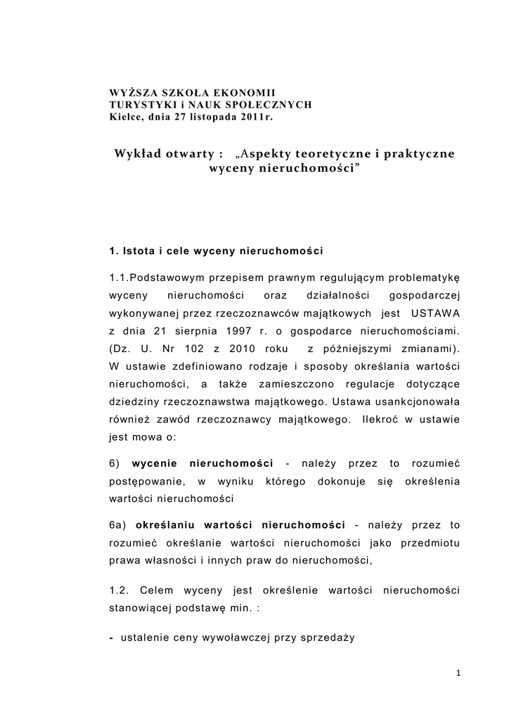 WYŻS ZA S ZK OŁA EK ONOMII TURYS TYK I i NAUK SPOŁECZNYCH K ielce, dnia 27 li stopada 2011 r. Wykład otwarty : „Aspekty teoretyczne i praktyczne wyceny nieruchomości” 1. Istota i cele w yceny nie ruc homoś ci 1.1.Podsta wo wym przepise m pra wnym regulującym problemat ykę wyceny nieruchomości oraz działalności wykonywane j przez rzeczozna wcó w majątko wych gospodarczej jest USTAW A z dnia 21 sierpnia 1997 r. o gospodarce nieruchomościa mi. (Dz. U. Nr 102 z 2010 roku z późniejszymi zmiana mi). W ustawie zdefiniowano rodzaje i sp osoby określania wartości nieruchomości, a także za mie szczono regulacje dotyczące dziedziny rzeczoznawst wa ma jątko weg o. Usta wa usankcjono wała również zawód rzeczozna wcy ma jątkowego. Ilekroć w usta wie jest mo wa o: 6) wyce nie nie rucho mości postępowanie, w wyniku - należy którego przez dokonuje to się rozu mieć określenia wartości nierucho mości 6a) określaniu wa rtości nieruc homości - należy przez to rozu mieć określanie wartości nierucho mości jako przed miot u prawa własności i innych praw do nierucho mości, 1.2. Celem wyceny jest określenie wartości nieruchomości stanowiące j podsta wę min. : - ustalenie ceny wywoła wcze j przy spr zedaży 1 - aktualizacja opłat za użytko wanie wieczyste - ustalenie wielkości zabezpieczenia kredytu - ustalenie odszkodowania za wywłaszczenie 2. Rodzaje wartości W wyniku wyceny nierucho mości doko nuje się: 1) określenia wartości rynkowe j, 2) określenia wartości odtworzenio we j, 3) ustalenia wartości katastralnej, 4)określenia innych rodzajów wartości przewidzianych w odrębnych przepisach. 2. Wartość rynkową określa się dla nieruchomości, które są lub mogą być przed miote m obrotu. 3. Wartość odtworzeniową określa się dla nieruchomości, które ze względu na rodzaj, obecne użytko wanie lub przeznaczenie nie są lub nie mogą być przed miote m o brotu rynkowego, a także jeżeli wymaga ją tego przepisy szczegó lne. 4. Wartość nieruchomości, katastralną nierucho mości ustala się dla o których mo wa w przepisach o podatku od nieruchomości. 3. Definicja i i nterp retacja wartości rynkowej 3.1. W artość prawdopodobna rynkową je j cena, nierucho mości możliwa do stanowi uzyskania na jbardziej na rynku, określona z uwzględnieniem cen transakcyjnych przy przyjęciu następujących założeń: 2 1) strony u mo wy były od siebie niezależne, nie działały w sytuacji przymuso we j oraz miały stanowczy za miar zawarcia u mo wy; 2) upłynął czas niezbędny do wyekspo nowania nieruchomości na rynku i do wynegocjo wania warunkó w u mo wy. W artość rynkową określa się dla nierucho mości, które są lub mogą być przed miote m obrotu. 4. Sposoby określania wa rtości W yceny nieruchomości dokonuje się przy zastoso waniu podejść: 4.1. porówna wczego, 4.2. dochodowego 4.3. koszto wego, 4.4. mieszanego, za wierającego ele menty podejść poprzednich. Przy zasto so waniu pode jścia poró wn awczego lub dochodo wego określa się wartość rynkową nierucho mości. Jeżeli istniejące uwarunko wania porówna wczego nie pozwalają lub nieruchomości określa zastoso waniu podejścia na zastoso wanie dochodo we go, się w wartość pod ejściu koszto weg o podejścia rynko wą mieszanym. określa się Przy wartość odtworzenio wą nierucho mości. 5. Operat szacunkowy, definicja Rozporządzenie Rady Ministrów w spra wie wycen y nieruchomości i sporządzania operatu szacunko wego z dnia 21 1. września Operat 2004 r. z późniejszymi szacunkowy przedsta wia zmiana mi postępowanie, o – którym mo wa w art. 4 pkt. 6 Usta wy o gosp odarce nieruchomościa mi. W operacie szacunkowym przedsta wia się sposób dokonania wyceny nierucho mości, w tym: 3 1) określenie przedmiotu i zakresu wyceny; 2) określenie celu wyceny; 3) podstawę for malną wyceny nieruchomości oraz źródła danych o nieruchomości; 4) ustalenie dat istotnych dla określenia wartości nierucho mości; 5) opis stanu nieruchomości; 6) wska zanie przeznaczenia wycenianej nierucho mości; 7) analizę i charakterystykę rynku nierucho mości w zakresie dotyczącym celu i sposobu wyceny; 8) wska zanie rodzaju określane j warto ści, wyboru pode jścia, metody i techniki szacowania; 9) przedstawienie obliczeń wartości nierucho mości oraz wyniku wyceny wraz z uzasadnienie m. Definicja na podstawie Krajowego Standardu Wyceny KSWP3 Operat szacunkow y – doku ment sta nowiący pise mną autorską opinię rzeczoznawcy ma jątko wego o wartości przed miot u wyceny, u względniający za łożenia oraz warunki ograniczające , stanowiące podsta wy wyceny, za wie rający istotne infor macje uzyskane podczas szaco wania nierucho mości 4 7. Preze ntacja sporządzonego operatu szacunkowego z w yceny nie ruc homości (preze ntacja w toku wykładu) 8. Działalność zawodowa w dziedzinie gospodarowania nie ruc homościa mi - rzec zoznaw ca majątkowy 8.1.Rzeczozna wst wo ma jąt ko we jest działalnością zawodową wykonywaną przez rzeczo zna wcó w na zasadach określonych w u sta wie o gospodarce nieruchomościami. 8.2.Rzeczozna wcą ma jątko wym jest osoba fizyczna posiadająca uprawnienia zawodo we w za kresie szaco wania nieruchomości, nadane w trybie przepisów rozdziału 4 Ustawy o gospodarce nieruchomościa mi. 8.3.Rzeczozna wca ma jątko wy ma prawo szaco wania nieruchomości, a także maszyn i urządzeń trwale związanych z gruntem. Rzeczozna wca ma jątko wy je st zobo wiązany do wykonywania czynności szaco wania nieruchomości zgodnie z zasada mi wynika jącymi z przepisów pra wa i standardami zawodo wymi, ze szczególną starannością wła ściwą dla zawodo wego charakteru tych czynności oraz z zasadami etyki zawodo we j, kierując się zasadą bezstronności w wycenie nieruchomości. 8.4. Uprawnie nia zawodowe w zakresie szacowania nieruc homości nadaje się osobie, która: 1) 2) posiada nie była doku mento m, pieniędz