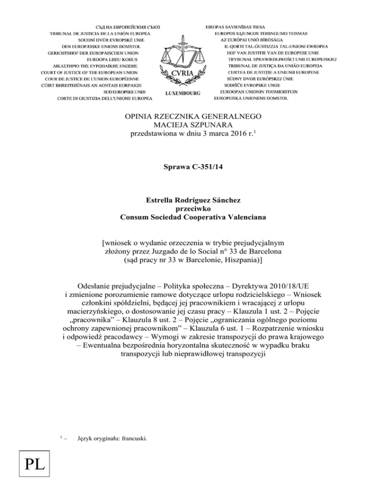 OPINIA RZECZNIKA GENERALNEGO MACIEJA SZPUNARA przedstawiona w dniu 3 marca 2016 r.1 Sprawa C-351/14 Estrella Rodríguez Sánchez przeciwko Consum Sociedad Cooperativa Valenciana [wniosek o wydanie orzeczenia w trybie prejudycjalnym złożony przez Juzgado de lo Social n° 33 de Barcelona (sąd pracy nr 33 w Barcelonie, Hiszpania)] Odesłanie prejudycjalne – Polityka społeczna – Dyrektywa 2010/18/UE i zmienione porozumienie ramowe dotyczące urlopu rodzicielskiego – Wniosek członkini spółdzielni, będącej jej pracownikiem i wracającej z urlopu macierzyńskiego, o dostosowanie jej czasu pracy – Klauzula 1 ust. 2 – Pojęcie „pracownika” – Klauzula 8 ust. 2 – Pojęcie „ograniczania ogólnego poziomu ochrony zapewnionej pracownikom” – Klauzula 6 ust. 1 – Rozpatrzenie wniosku i odpowiedź pracodawcy – Wymogi w zakresie transpozycji do prawa krajowego – Ewentualna bezpośrednia horyzontalna skuteczność w wypadku braku transpozycji lub nieprawidłowej transpozycji 1 PL – Język oryginału: francuski. RODRÍGUEZ SÁNCHEZ I– Wprowadzenie 1. Niniejsze odesłanie prejudycjalne, skierowane do Trybunału przez Juzgado de lo Social n°33 de Barcelona (sąd pracy nr 33 w Barcelonie, Hiszpania), dotyczy wykładni dyrektywy 2010/18/UE2 w sprawie wdrożenia zmienionego porozumienia ramowego dotyczącego urlopu rodzicielskiego (zwanego dalej „zmienionym porozumieniem ramowym”). 2. Postępowanie główne wszczęto w następstwie złożenia wniosku o dostosowanie godzin pracy członka spółdzielni będącego jej pracownikiem. 3. Sąd odsyłający dąży w szczególności do ustalenia, czy stosunek istniejący między członkiem – pracownikiem spółdzielni a tą spółdzielnią stanowi umowę o pracę lub stosunek zatrudnienia w rozumieniu klauzuli 1 ust. 2 zmienionego porozumienia ramowego i, w wypadku odpowiedzi twierdzącej, czy po powrocie z „urlopu macierzyńskiego” członek – pracownik ma prawo skorzystać z przystosowania jego godzin pracy oraz organizacji czasu pracy w rozumieniu klauzuli 6 ust. 1 tego porozumienia ramowego. II – Ramy prawne A– Prawo Unii 4. Artykuł 3 ust. 1 dyrektywy 2010/18 stanowi, że „[w] terminie do dnia 8 marca 2012 r. państwa członkowskie wprowadzają w życie przepisy ustawowe, wykonawcze i administracyjne niezbędne do wykonania niniejszej dyrektywy lub zapewniają wprowadzenie w życie przez partnerów społecznych niezbędnych środków w drodze porozumienia. Państwa członkowskie niezwłocznie informują o nich Komisję”. 5. Preambuła zmienionego porozumienia ramowego zawartego w załączniku do dyrektywy 2010/18 w akapicie pierwszym stanowi, że „[niniejsze] porozumienie ramowe […] zmienia porozumienie ramowe dotyczące urlopu rodzicielskiego zawarte w dniu 14 grudnia 1995 r. [zawarte w załączniku do dyrektywy 96/34/WE3], określając minimalne wymogi dotyczące urlopu rodzicielskiego jako ważnego środka służącego godzeniu obowiązków zawodowych z rodzinnymi oraz wspierającego równe szanse i równe traktowanie kobiet i mężczyzn”. 2 – Dyrektywa Rady z dnia 8 marca 2010 r. w sprawie wdrożenia zmienionego porozumienia ramowego dotyczącego urlopu rodzicielskiego zawartego przez BUSINESSEUROPE, UEAPME, CEEP i ETUC oraz uchylająca dyrektywę 96/34/WE (Dz.U. L 68, s. 13). 3 – Dyrektywa Rady z dnia 3 czerwca 1996 r. w sprawie porozumienia ramowego dotyczącego urlopu rodzicielskiego zawartego przez UNICE, CEEP oraz ETUC (Dz.U. L 145, s. 4). I-1 OPINIA M. SZPUNARA – SPRAWA C-351/14 6. Punkty 3, 15 i 21 przesłanek ogólnych zmienionego porozumienia ramowego mają następujące brzmienie: „3. uwzględniając Kartę praw podstawowych Unii Europejskiej z dnia 7 grudnia 2000 r., w szczególności jej art. 23 i 33 dotyczące równości kobiet i mężczyzn oraz godzenia życia zawodowego, prywatnego i rodzinnego; […] 15. mając na uwadze, że niniejsze porozumienie jest porozumieniem ramowym, określającym minimalne wymogi i przepisy dotyczące urlopu rodzicielskiego – różniącego się od urlopu macierzyńskiego – oraz czasu wolnego od pracy z powodu działania siły wyższej, i odwołuje się do państw członkowskich i partnerów społecznych, aby stworzyli odpowiednie warunki dostępu i ustalili szczegółowe zasady stosowania, uwzględniając sytuację w poszczególnych państwach członkowskich; […] 21. mając na uwadze, że możliwość korzystania z elastycznej organizacji czasu pracy ułatwia rodzicom łączenie pracy i obowiązków rodzicielskich oraz ułatwia reintegrację zawodową, zwłaszcza po powrocie z urlopu rodzicielskiego; […]”. 7. Klauzula 1 zmienionego porozumienia ramowego, zatytułowana „Cel i zakres”, w ust. 2 stanowi, że „[niniejsze] porozumienie ma zastosowanie do wszystkich pracowników – kobiet i mężczyzn – związanych umową o pracę lub pozostających w innym stosunku zatrudnienia określonym przez prawo, układy zbiorowe lub praktykę obowiązujące w każdym państwie członkowskim”. 8. Klauzula 2 ust. 1 zmienionego porozumienia ramowego stanowi, że „[niniejsze] porozumienie przyznaje pracownikom – mężczyznom i kobietom – indywidualne prawo do urlopu rodzicielskiego z powodu narodzin dziecka lub przysposobienia dziecka, aby umożliwić im opiekę nad tym dzieckiem do czasu osiągnięcia przez nie pewnego wieku – wynoszącego maksymalnie osiem lat – który zostanie określony przez państwa członkowskie lub partnerów społecznych”. 9. Klauzula 3 ust. 1 zmienionego porozumienia ramowego stanowi: „Warunki korzystania z urlopu rodzicielskiego i szczegółowe zasady występowania o udzielenie tego urlopu są określone przez przepisy prawa lub układy zbiorowe w państwach członkowskich, z zastrzeżeniem przestrzegania I-2 RODRÍGUEZ SÁNCHEZ minimalnych wymogów określonych w niniejszym porozumieniu. Państwa członkowskie lub partnerzy społeczni mogą w szczególności: a) zadecydować, czy urlop rodzicielski j