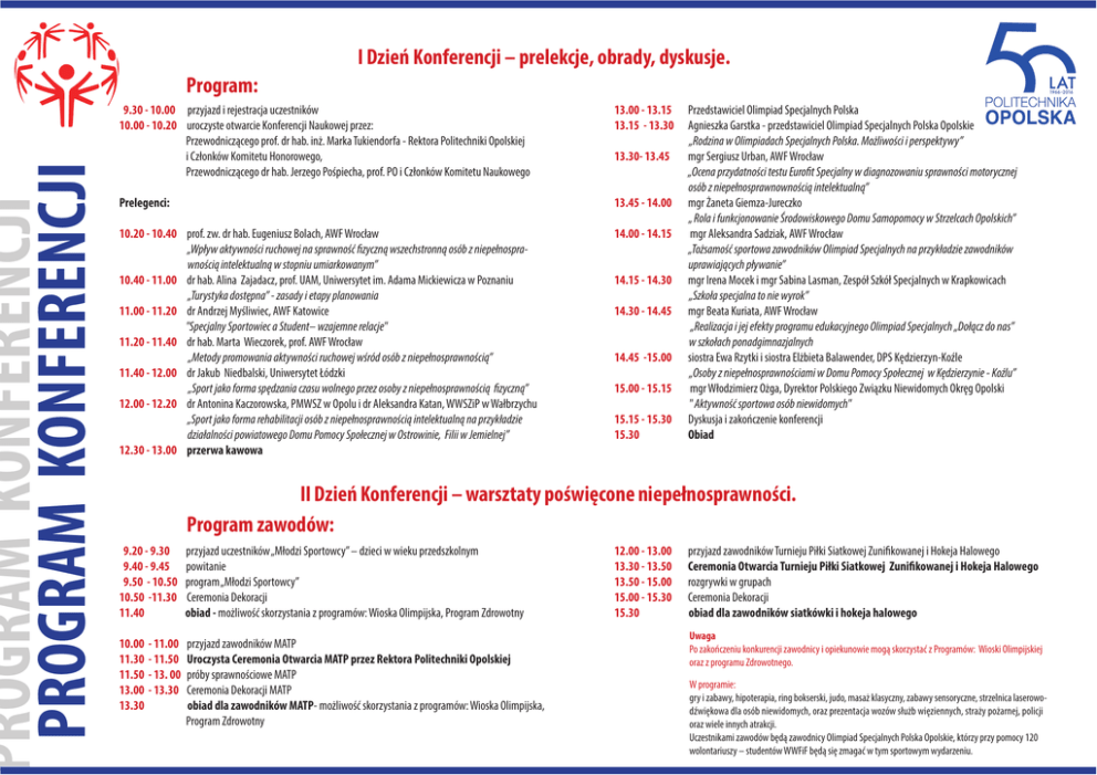 PROGRAM KONFERENCJI PROGRAM KONFERENCJI I Dzień Konferencji – prelekcje, obrady, dyskusje. Program: 9.30 - 10.00 przyjazd i rejestracja uczestników 10.00 - 10.20 uroczyste otwarcie Konferencji Naukowej przez: Przewodniczącego prof. dr hab. inż. Marka Tukiendorfa - Rektora Politechniki Opolskiej i Członków Komitetu Honorowego, Przewodniczącego dr hab. Jerzego Pośpiecha, prof. PO i Członków Komitetu Naukowego 13.00 - 13.15 13.15 - 13.30 Prelegenci: 13.45 - 14.00 10.20 - 10.40 prof. zw. dr hab. Eugeniusz Bolach, AWF Wrocław „Wpływ aktywności ruchowej na sprawność fizyczną wszechstronną osób z niepełnosprawnością intelektualną w stopniu umiarkowanym” 10.40 - 11.00 dr hab. Alina Zajadacz, prof. UAM, Uniwersytet im. Adama Mickiewicza w Poznaniu „Turystyka dostępna” - zasady i etapy planowania 11.00 - 11.20 dr Andrzej Myśliwiec, AWF Katowice "Specjalny Sportowiec a Student– wzajemne relacje" 11.20 - 11.40 dr hab. Marta Wieczorek, prof. AWF Wrocław „Metody promowania aktywności ruchowej wśród osób z niepełnosprawnością” 11.40 - 12.00 dr Jakub Niedbalski, Uniwersytet Łódzki „Sport jako forma spędzania czasu wolnego przez osoby z niepełnosprawnością fizyczną” 12.00 - 12.20 dr Antonina Kaczorowska, PMWSZ w Opolu i dr Aleksandra Katan, WWSZiP w Wałbrzychu „Sport jako forma rehabilitacji osób z niepełnosprawnością intelektualną na przykładzie działalności powiatowego Domu Pomocy Społecznej w Ostrowinie, Filii w Jemielnej” 12.30 - 13.00 przerwa kawowa 14.00 - 14.15 13.30- 13.45 14.15 - 14.30 14.30 - 14.45 14.45 -15.00 15.00 - 15.15 15.15 - 15.30 15.30 Przedstawiciel Olimpiad Specjalnych Polska Agnieszka Garstka - przedstawiciel Olimpiad Specjalnych Polska Opolskie „Rodzina w Olimpiadach Specjalnych Polska. Możliwości i perspektywy” mgr Sergiusz Urban, AWF Wrocław „Ocena przydatności testu Eurofit Specjalny w diagnozowaniu sprawności motorycznej osób z niepełnosprawnownością intelektualną” mgr Żaneta Giemza-Jureczko „ Rola i funkcjonowanie Środowiskowego Domu Samopomocy w Strzelcach Opolskich” mgr Aleksandra Sadziak, AWF Wrocław „Tożsamość sportowa zawodników Olimpiad Specjalnych na przykładzie zawodników uprawiających pływanie” mgr Irena Mocek i mgr Sabina Lasman, Zespół Szkół Specjalnych w Krapkowicach „Szkoła specjalna to nie wyrok” mgr Beata Kuriata, AWF Wrocław „Realizacja i jej efekty programu edukacyjnego Olimpiad Specjalnych „Dołącz do nas” w szkołach ponadgimnazjalnych siostra Ewa Rzytki i siostra Elżbieta Balawender, DPS Kędzierzyn-Koźle „Osoby z niepełnosprawnościami w Domu Pomocy Społecznej w Kędzierzynie - Koźlu” mgr Włodzimierz Ożga, Dyrektor Polskiego Związku Niewidomych Okręg Opolski " Aktywność sportowa osób niewidomych" Dyskusja i zakończenie konferencji Obiad II Dzień Konferencji – warsztaty poświęcone niepełnosprawności. Program zawodów: 9.20 - 9.30 9.40 - 9.45 9.50 - 10.50 10.50 -11.30 11.40 przyjazd uczestników „Młodzi Sportowcy” – dzieci w wieku przedszkolnym powitanie program „Młodzi Sportowcy” Ceremonia Dekoracji obiad - możliwość skorzystania z programów: Wioska Olimpijska, Program Zdrowotny 10.00 11.30 11.50 13.00 13.30 przyjazd zawodników MATP Uroczysta Ceremonia Otwarcia MATP przez Rektora Politechniki Opolskiej próby sprawnościowe MATP Ceremonia Dekoracji MATP obiad dla zawodników MATP- możliwość skorzystania z programów: Wioska Olimpijska, Program Zdrowotny - 11.00 - 11.50 - 13. 00 - 13.30 12.00 - 13.00 13.30 - 13.50 13.50 - 15.00 15.00 - 15.30 15.30 przyjazd zawodników Turnieju Piłki Siatkowej Zunifikowanej i Hokeja Halowego Ceremonia Otwarcia Turnieju Piłki Siatkowej Zunifikowanej i Hokeja Halowego rozgrywki w grupach Ceremonia Dekoracji obiad dla zawodników siatkówki i hokeja halowego Uwaga Po zakończeniu konkurencji zawodnicy i opiekunowie mogą skorzystać z Programów: Wioski Olimpijskiej oraz z programu Zdrowotnego. W programie: gry i zabawy, hipoterapia, ring bokserski, judo, masaż klasyczny, zabawy sensoryczne, strzelnica laserowodźwiękowa dla osób niewidomych, oraz prezentacja wozów służb więziennych, straży pożarnej, policji oraz wiele innych atrakcji. Uczestnikami zawodów będą zawodnicy Olimpiad Specjalnych Polska Opolskie, którzy przy pomocy 120 wolontariuszy – studentów WWFiF będą się zmagać w tym sportowym wydarzeniu.
