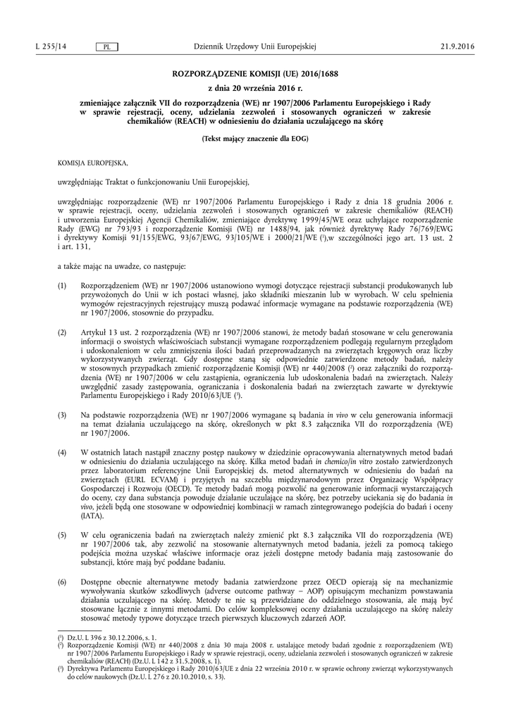 L 255/14 Dziennik Urzędowy Unii Europejskiej PL 21.9.2016 ROZPORZĄDZENIE KOMISJI (UE) 2016/1688 z dnia 20 września 2016 r. zmieniające załącznik VII do rozporządzenia (WE) nr 1907/2006 Parlamentu Europejskiego i Rady w sprawie rejestracji, oceny, udzielania zezwoleń i stosowanych ograniczeń w zakresie chemikaliów (REACH) w odniesieniu do działania uczulającego na skórę (Tekst mający znaczenie dla EOG) KOMISJA EUROPEJSKA, uwzględniając Traktat o funkcjonowaniu Unii Europejskiej, uwzględniając rozporządzenie (WE) nr 1907/2006 Parlamentu Europejskiego i Rady z dnia 18 grudnia 2006 r. w sprawie rejestracji, oceny, udzielania zezwoleń i stosowanych ograniczeń w zakresie chemikaliów (REACH) i utworzenia Europejskiej Agencji Chemikaliów, zmieniające dyrektywę 1999/45/WE oraz uchylające rozporządzenie Rady (EWG) nr 793/93 i rozporządzenie Komisji (WE) nr 1488/94, jak również dyrektywę Rady 76/769/EWG i dyrektywy Komisji 91/155/EWG, 93/67/EWG, 93/105/WE i 2000/21/WE (1),w szczególności jego art. 13 ust. 2 i art. 131, a także mając na uwadze, co następuje: (1) Rozporządzeniem (WE) nr 1907/2006 ustanowiono wymogi dotyczące rejestracji substancji produkowanych lub przywożonych do Unii w ich postaci własnej, jako składniki mieszanin lub w wyrobach. W celu spełnienia wymogów rejestracyjnych rejestrujący muszą podawać informacje wymagane na podstawie rozporządzenia (WE) nr 1907/2006, stosownie do przypadku. (2) Artykuł 13 ust. 2 rozporządzenia (WE) nr 1907/2006 stanowi, że metody badań stosowane w celu generowania informacji o swoistych właściwościach substancji wymagane rozporządzeniem podlegają regularnym przeglądom i udoskonaleniom w celu zmniejszenia ilości badań przeprowadzanych na zwierzętach kręgowych oraz liczby wykorzystywanych zwierząt. Gdy dostępne staną się odpowiednie zatwierdzone metody badań, należy w stosownych przypadkach zmienić rozporządzenie Komisji (WE) nr 440/2008 (2) oraz załączniki do rozporzą dzenia (WE) nr 1907/2006 w celu zastąpienia, ograniczenia lub udoskonalenia badań na zwierzętach. Należy uwzględnić zasady zastępowania, ograniczania i doskonalenia badań na zwierzętach zawarte w dyrektywie Parlamentu Europejskiego i Rady 2010/63/UE (3). (3) Na podstawie rozporządzenia (WE) nr 1907/2006 wymagane są badania in vivo w celu generowania informacji na temat działania uczulającego na skórę, określonych w pkt 8.3 załącznika VII do rozporządzenia (WE) nr 1907/2006. (4) W ostatnich latach nastąpił znaczny postęp naukowy w dziedzinie opracowywania alternatywnych metod badań w odniesieniu do działania uczulającego na skórę. Kilka metod badań in chemico/in vitro zostało zatwierdzonych przez laboratorium referencyjne Unii Europejskiej ds. metod alternatywnych w odniesieniu do badań na zwierzętach (EURL ECVAM) i przyjętych na szczeblu międzynarodowym przez Organizację Współpracy Gospodarczej i Rozwoju (OECD). Te metody badań mogą pozwolić na generowanie informacji wystarczających do oceny, czy dana substancja powoduje działanie uczulające na skórę, bez potrzeby uciekania się do badania in vivo, jeżeli będą one stosowane w odpowiedniej kombinacji w ramach zintegrowanego podejścia do badań i oceny (IATA). (5) W celu ograniczenia badań na zwierzętach należy zmienić pkt 8.3 załącznika VII do rozporządzenia (WE) nr 1907/2006 tak, aby zezwolić na stosowanie alternatywnych metod badania, jeżeli za pomocą takiego podejścia można uzyskać właściwe informacje oraz jeżeli dostępne metody badania mają zastosowanie do substancji, które mają być poddane badaniu. (6) Dostępne obecnie alternatywne metody badania zatwierdzone przez OECD opierają się na mechanizmie wywoływania skutków szkodliwych (adverse outcome pathway – AOP) opisującym mechanizm powstawania działania uczulającego na skórę. Metody te nie są przewidziane do oddzielnego stosowania, ale mają być stosowane łącznie z innymi metodami. Do celów kompleksowej oceny działania uczulającego na skórę należy stosować metody typowe dotyczące trzech pierwszych kluczowych zdarzeń AOP. (1) Dz.U. L 396 z 30.12.2006, s. 1. (2) Rozporządzenie Komisji (WE) nr 440/2008 z dnia 30 maja 2008 r. ustalające metody badań zgodnie z rozporządzeniem (WE) nr 1907/2006 Parlamentu Europejskiego i Rady w sprawie rejestracji, oceny, udzielania zezwoleń i stosowanych ograniczeń w zakresie chemikaliów (REACH) (Dz.U. L 142 z 31.5.2008, s. 1). (3) Dyrektywa Parlamentu Europejskiego i Rady 2010/63/UE z dnia 22 września 2010 r. w sprawie ochrony zwierząt wykorzystywanych do celów naukowych (Dz.U. L 276 z 20.10.2010, s. 33). 21.9.2016 PL Dziennik Urzędowy Unii Europejskiej L 255/15 (7) Jednak w pewnych warunkach możliwe jest uzyskanie wystarczających informacji bez bezpośredniego badania wszystkich trzech zdarzeń za pomocą odrębnych metod badania. Należy zatem pozostawić rejestrującym możliwość naukowego uzasadnienia pominięcia badań dotyczących niektórych kluczowych zdarzeń. (8) Metoda badań wskazana jako metoda pierwszego wyboru dla badań in vivo, czyli test lokalnych węzłów limfatycznych (LLNA), dostarcza informacji na temat siły możliwego działania uczulającego na skórę danej substancji. Identyfikacja substancji silnie działających uczulająco na skórę jest istotna, do celów właściwej klasyfikacji i oceny ryzyka takich substancji. Należy zatem doprecyzować, że wymóg, aby informacja pozwalała ocenić, czy dana substancja powinna być uznana za substancję silnie działającą uczulająco na skórę, ma zastosowanie do wszystkich danych, niezależnie od tego, czy wygenerowano je dzięki metodom in vivo czy in vitro. (9) Jednak aby uniknąć badania na zwierzętach i powtarzania badań już przeprowadzonych, należy uznać istniejące badania in vivo działania uczulającego na skórę przeprowadzone zgodnie z ważnymi wskazówkami OECD dotyczącymi badań lub p
