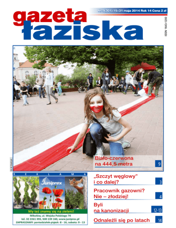 Fot. M. Strzelczyk Nr 9(301) 15–31 maja 2014 Rok 14 Cena 2 zł R E K L A M A Biało-czerwona na 444,5 metra 9 „Szczyt węglowy” i co dalej? 3 Pracownik gazowni? Nie – złodziej! 4 Byli na kanonizacji Odnaleźli się po latach 12-13 14 gazeta łaziska INFORMATOR NUMERY ALARMOWE Państwowa Straż Pożarna (998) 326 23 10 Ochotnicza Straż Pożarna Ł. Górne 224 21 20 Ochotnicza Straż Pożarna Ł. Średnie 224 21 22 Ochotnicza Straż Pożarna Ł. Dolne 224 21 21 Policja (997) 226 85 10 Straż Miejska (986) 224 44 71 POGOTOWIA Ratunkowe (999) 226 21 00 226 26 65 Centrum Medyczne 325 76 00 Gazowe (992) 227 31 24 Energetyczne (991) 303 21 55 Ciepłownicze 226 21 36 Wodno-kanalizacyjne 224 18 37 224 14 52 PGKiM 224 10 88 224 15 50 Punkt konsultacyjny Gminnej Komisji Rozwiązywani Problemów Alkoholowych 224 23 90 PRZYCHODNIE Proelmed (ul. Wyzwolenia 30) 324 31 23 Przychodnia (ul. Staszica 4a) 737 02 30 Przychodnia (ul. Chopina 17) 736 76 70 736 76 55 APTEKI „Arnika”, os. Centrum 7 224 38 39 „Novum”, ul. Dworcowa 10 224 10 18 „Moja Apteka”, ul. Staszica 2/2 736 80 90 „Dbam o Zdrowie”, ul. Wiejska 1 322 70 95 „Dbam o Zdrowie”, ul. Chopina 17 736 76 37 INNE Urząd Miasta 324 80 00 Starostwo Powiatowe 324 81 00 MDK Ł. Górne 224 10 33 MDK Ł. Średnie 224 48 18 MDK Ł. Dolne 322 94 46 PiMBP (biblioteka) 224 14 12 Parafia Ł. Górne 224 10 13 Parafia Ł. Średnie 224 10 03 Parafia Ł. Dolne 224 18 42 MOSiR 221 11 38 Ośrodek Rekreacyjno–Sportowy „Żabka” 322 93 82 Środowiskowy Dom 737 00 46 Samopomocy 698 639 036 OPS 326 23 40 326 23 42 Szkoły Szkoła Podstawowa nr 1 224 10 44 Szkoła Podstawowa nr 5 224 12 07 Szkoła Podstawowa nr 6 224 32 46 Gimnazjum nr 1 224 10 66 Gimnazjum nr 3 737 01 17 Zespół Szkół im. Piastów Śląskich 224 10 12 Zespół Szkół Energetycznych i Usługowych 224 24 15 2 15 -31 maja 2014 informator MDK zaprasza... …28 maja o godz. 18.00 na koncert z okazji Dnia Matki, podczas którego wystąpi Dziecięcy Zespół Artystyczny „Radość” oraz Lala Supryn. Wstęp wolny! …1 czerwca od godz. 11.00 na Dzień Dziecka. Wszystkie dzieci zapraszamy na taras przed MDK, gdzie będą ustawione „dmuchańce” – zjeżdżalnia, plac zabaw i suchy basen z piłeczkami, z których będzie można nieodpłatnie korzystać do godz. 17.00. O dobrą zabawę od 12.00 do 15.00 zadbają również łaziscy harcerze, którzy przygotują na ten dzień szereg zabaw dla najmłodszych. W przypadku niepogody korzystanie z „dmuchańców” zostanie przeniesione na inny termin, a harcerze zaproszą dzieci do sali widowiskowej MDK. …3 czerwca o godz. 10.00 na finał konkursu wiedzy dla gimnazjalistów z terenu całego powiatu mikołowskiego „Wiem Wszystko”. …5 czerwca o godz. 12.00 na wernisaż wystawy konkursu „Ze Sztuką na Ty”, podczas którego będzie można zobaczyć prace inspirowane twórczością wielkich mistrzów. W trakcie wernisażu zostaną wręczone nagrody zwycięzcom konkursu. …8 czerwca na I Śląski Fajer. Impreza odbędzie się w amfiteatrze miejskim. Szczegóły wkrótce . Zapraszamy na wyjazd Są jeszcze wolne miejsca na wyjazd do Arboretum w Wojsławicach. Te przepiękne ogrody będzie można zwiedzić z przewodnikiem w sobotę – 31 maja. Wyjazd o godz. 7.00 z zatoczki przed Miejskim Domem Kultury. W drodze powrotnej zaplanowana jest jeszcze wizyta w Nysie. Koszt wyjazdu – 60 zł. Zapisy i wpłaty są przyjmowane w sekretariacie MDK. Ilość miejsc ograniczona! Arboretum w Wojsławicach od 1988 roku stanowi filię Ogrodu Botanicznego Uniwersytetu Wrocławskiego. Znane jest z bogatego zbioru różaneczników i azalii, liliowców, bukszpanów, a także drzew oraz krzewów. Kolekcja obejmuje 4650 gatunków i odmian bylin. Znajdujące się tam kolekcje różaneczników, liliowców oraz bukszpanów zostały uznane przez Polskie Towarzystwo Ogrodów Botanicznych za Kolekcje Narodowe. III Bieg dla Jasia Już po raz trzeci będziemy mieli okazję wziąć udział w akcji charytatywnej na rzecz Jasia Szopy. „Bieg dla Jasia” odbędzie się 1 czerwca, tradycyjnie na terenach rekreacyjnych za „Żabką” – zbiórka i zapisy w okolicy wejścia na basen już od godz. 9.00. Start o godz. 10.15 – tradycyjnie uczestnicy pobiegną, pójdą, pojadą rowerem, na rolkach czy hulajnodze ścieżkami do pomnika i z powrotem. Każdy uczestnik otrzyma koszulkę – biegacze mają zagwarantowaną wodę mineralną i grochówkę. Dla dzieci przewidziane są słodki poczęstunek i inne atrakcje związane z przypadającym w tym czasie Dniem Dziecka. Po zakończeniu biegu losowane będą nagrody. Podobnie jak rok temu największą atrakcją będzie 3-dniowy pobyt w hotelu „Alpin” w Szczyrku. Całkowity dochód z imprezy przeznaczony będzie na dalszą rehabilitacje i zakup nowej protezy dla Jasia Szopy. mred. z życia miasta gazeta łaziska „Szczyt węglowy” i co dalej? N Fot. M. Strzelczyk a razie są tylko rozmowy. Po tygodniowym postoju – od 28 kwietnia do 5 maja – ogłoszonym w 9 kopalniach Kompanii Węglowej, na Śląsk przyjechał premier Donald Tusk. Podczas tzw. szczytu węglowego, 6 maja, w którym poza stroną rządową, wzięli udział przedstawiciele spółek węglowych i central związkowych, uzgodniono powołanie do życia trzech zespołów roboczych. Jeden ma zająć się opracowaniem rządowej strategii dla górnictwa, drugi – rozwiązaniami łagodzącymi skutki wdrażania unijnego pakietu klimatycznego, a trzeci – problemami, z którymi teraz boryka się sektor węglowy. Premier mówił o konieczności ochrony i promocji polskiego węgla jako kluczowego paliwa dla bezpieczeństwa energetycznego kraju. W czwartek, 8 maja, Najwyższa Izba Kontroli rozpoczęła kontrolę sektora górniczego. Jak zaznacza Krzysztof Kwiatkowski, prezes NIK-u, kontrola ma m.in. dać odpowiedź na pytanie, dlaczego eksploatacja podobnych złóż węgla w Czechach może być opłacalna, a w Polsce wymaga ciągłej troski i wsparci