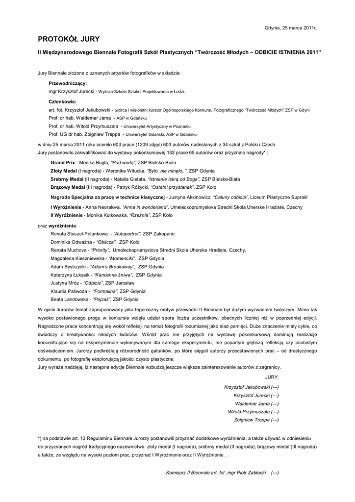 Gdynia, 25 marca 2011r. PROTOKÓŁ JURY II Międzynarodowego Biennale Fotografii Szkół Plastycznych “Twórczość Młodych – ODBICIE ISTNIENIA 2011” Jury Biennale złożone z uznanych artystów fotografików w składzie: Przewodniczący: mgr Krzysztof Jurecki - Wyższa Szkoła Sztuki i Projektowania w Łodzi. Członkowie: art. fot. Krzysztof Jakubowski - twórca i wieloletni kurator Ogólnopolskiego Konkursu Fotograficznego “Twórczość Młodych” ZSP w Gdyni Prof. dr hab. Waldemar Jama - ASP w Gdańsku Prof. dr hab. Witold Przymuszała - Uniwersytet Artystyczny w Poznaniu Prof. UG dr hab. Zbigniew Treppa - Uniwersytet Gdański, ASP w Gdańsku w dniu 25 marca 2011 roku oceniło 603 prace (1209 zdjęć) 603 autorów nadesłanych z 34 szkół z Polski i Czech. Jury postanowiło zakwalifikować do wystawy pokonkursowej 132 prace 65 autorów oraz przyznało nagrody* : Grand Prix - Monika Bugla, “Pod wodą”, ZSP Bielsko-Biała Złoty Medal (I nagroda) - Weronika Witucka, “Było, nie minęło..”, ZSP Gdynia Srebrny Medal (II nagroda) - Natalia Gielata, “Istnienie iskrą od Boga”, ZSP Bielsko-Biała Brązowy Medal (III nagroda) - Patryk Różycki, “Ostatni przystanek”, ZSP Koło Nagroda Specjalna za pracę w technice klasycznej - Justyna Aksinowicz, “Całuny odbicia”, Liceum Plastyczne Supraśl I Wyróżnienie - Anna Neoralova, “Anna in wonderland”, Umeleckoprumyslova Stredni Skola Uherske Hradiste, Czechy II Wyróżnienie - Monika Kutkowska, “Rzeźnia”, ZSP Koło oraz wyróżnienia: Renata Staszel-Polankowa - “Autoportret”, ZSP Zakopane Dominika Odważna - “Oblicza”, ZSP Koło Renata Muchova - “Priority”, Umeleckoprumyslova Stredni Skola Uherske Hradiste, Czechy, Magdalena Kieszniewska - “Momenciki”, ZSP Gdynia Adam Bystrzycki - “Adam’s Breakaway”, ZSP Gdynia Katarzyna Łukasik - “Kamienne żniwa”, ZSP Gdynia Justyna Mróz - “Odbicie”, ZSP Jarosław Klaudia Paliwoda - “Formalina”, ZSP Gdynia Beata Landowska - “Pejzaż”, ZSP Gdynia W opinii Jurorów temat zaproponowany jako tegoroczny motyw przewodni II Biennale był dużym wyzwaniem twórczym. Mimo tak wysoko postawionego progu w konkursie wzięła udział spora liczba uczestników, obecnych liczniej niż w poprzedniej edycji. Nagrodzone prace koncentrują się wokół refleksji na temat fotografii rozumianej jako ślad pamięci. Duże znaczenie miały cykle, co świadczy o kreatywności młodych twórców. Wśród prac nie przyjętych na wystawę pokonkursową dominują realizacje koncentrujące się na eksperymencie wykonywanym dla samego eksperymentu, nie popartym głębszą refleksją czy osobistym doświadczeniem. Jurorzy podkreślają różnorodność gatunków, po które sięgali autorzy przedstawionych prac – od drastycznego dokumentu, po fotografię eksplorującą jakości czysto plastyczne. Jury wyraża nadzieję, iż następne edycje Biennale wzbudzą jeszcze większe zainteresowanie autorów z zagranicy. JURY: Krzysztof Jakubowski (---) Krzysztof Jurecki (---) Waldemar Jama (---) Witold Przymuszała (---) Zbigniew Treppa (---) *) na podstawie art. 13 Regulaminu Biennale Jurorzy postanowili przyznać dodatkowe wyróżnienia, a także używać w odniesieniu do przyznanych nagród tradycyjnego nazewnictwa: złoty medal (I nagroda), srebrny medal (II nagroda), brązowy medal (III nagroda) a także, ze względu na wysoki poziom prac, przyznać I Wyróżnienie oraz II Wyróżnienie . Komisarz II Biennale art. fot .mgr Piotr Zabłocki (---)