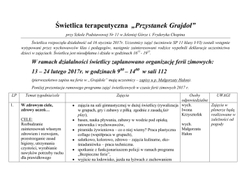 Świetlica terapeutyczna „Przystanek Grajdoł” przy Szkole Podstawowej Nr 11 w Jeleniej Górze i. Fryderyka Chopina Świetlica rozpoczęła działalność od 16 stycznia 2017r. Uczestnicy zajęć (uczniowie SP 11 klasy I-VI) zostali wstępnie wytypowani przez wychowawców klas i pedagogów, następnie zainteresowani rodzice wypełnili deklaracje uczestnictwa dzieci w zajęciach. Świetlica jest nieodpłatna i działa w godzinach 1615 - 1915. W ramach działalności świetlicy zaplanowano organizację ferii zimowych: 13 – 24 lutego 2017r. w godzinach 900 – 1400 w sali 112 (pierwszeństwo zapisu na ferie w „Grajdole” mają uczestnicy – zapisy u p. Małgorzaty Hałon). Poniżej prezentacja ramowego programu zajęć świetlicowych w czasie ferii zimowych 2017 r. LP 1. Temat tygodnia/cele W zdrowym ciele, zdrowy uczeń… CELE: Rozbudzanie zainteresowań własnym zdrowiem i rozwojem, przestrzeganie zasad higieny, utrzymania czystości, wyrabianie nawyków potrzeby ruchu dla prawidłowego Zajęcia Osoby UWAGI odpowiedzialne Zajęcia w zajęcia na sali gimnastycznej w dużej świetlicy (rywalizacja wych. Iwona plenerze będą w grupach, gry i zabawy z piłką zgodnie z zasadą fair Krzysztofek realizowane w play), zależności od basen, nauka pływania, zabawy w wodzie pod opieką wych. pogody ratownika i wychowawców, piramida żywieniowa – co o niej wiemy? Praca plastyczna Małgorzata Hałon collage (współpraca w grupach), sałatkowo, kolorowo, zdrowo – zajęcia kulinarne, ekośniadaniówka – praca techniczna. spotkanie z funkcjonariuszem policji w ramach programu „Bezpieczne ferie”, wyjście na lodowisko, jazda na łyżwach z zachowaniem 2. rozwoju i funkcjonowania organizmu, ruch – alternatywą dla komputera. Cudze chwalicie? … swoje poznajcie! CELE: Poznanie najbliższego środowiska i specyfiki regionu, rozwijanie wartości rodzinnych związanych z wartościami kulturowymi wspólnoty lokalnej, propozycja innej aktywności, poznawanie dorobku innych ludzi, utożsamianie się z własnym narodem i jego tradycją. zasad bezpiecznej zabawy. zabawy na śniegu, budowanie rzeźb, jazda na ślizgaczach, wyjście na Górę Szybowcową, zimowy pejzaż (praca plastyczna), wyjście do kina „Helios” na bajkę dla dzieci. wyjazd do Bukowca, spacer po okolicach pałacu w Bukowcu, poznanie historii i ciekawostek przyrodniczych związanych z tym miejscem. Wycieczka zakończona degustacją herbaty w kawiarence pałacowej, wycieczka do Muzeum Miniatur w Kowarach, spacer z przewodnikiem, poznawanie legend i klechd związanych z naszym regionem, stworzenie wymyślonej postaci ducha gór (collage), wyjazd do „Pijalni Czekolady” w Mysłakowicach, kulinarna prezentacja i degustacja czekolady, zaproszenie na lunch, wyjście do kina „Lot”, zabawa na zakończenie ferii, nauka tańca hip-hop przez koleżankę ze szkoły. wych. Małgorzata Hałon wych. Anna Bogucka Zajęcia w plenerze będą realizowane w zależności od pogody