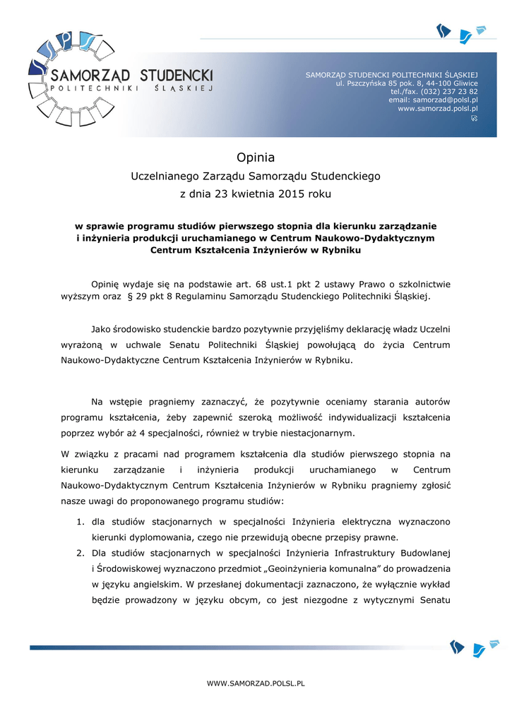 SAMORZĄD STUDENCKI POLITECHNIKI ŚLĄSKIEJ ul. Pszczyńska 85 pok. 8, 44-100 Gliwice tel./fax. (032) 237 23 82 email: [email protected] www.samorzad.polsl.pl Opinia Uczelnianego Zarządu Samorządu Studenckiego z dnia 23 kwietnia 2015 roku w sprawie programu studiów pierwszego stopnia dla kierunku zarządzanie i inżynieria produkcji uruchamianego w Centrum Naukowo-Dydaktycznym Centrum Kształcenia Inżynierów w Rybniku Opinię wydaje się na podstawie art. 68 ust.1 pkt 2 ustawy Prawo o szkolnictwie wyższym oraz § 29 pkt 8 Regulaminu Samorządu Studenckiego Politechniki Śląskiej. Jako środowisko studenckie bardzo pozytywnie przyjęliśmy deklarację władz Uczelni wyrażoną w uchwale Senatu Politechniki Śląskiej powołującą do życia Centrum Naukowo-Dydaktyczne Centrum Kształcenia Inżynierów w Rybniku. Na wstępie pragniemy zaznaczyć, że pozytywnie oceniamy starania autorów programu kształcenia, żeby zapewnić szeroką możliwość indywidualizacji kształcenia poprzez wybór aż 4 specjalności, również w trybie niestacjonarnym. W związku z pracami nad programem kształcenia dla studiów pierwszego stopnia na kierunku zarządzanie i inżynieria produkcji uruchamianego w Centrum Naukowo-Dydaktycznym Centrum Kształcenia Inżynierów w Rybniku pragniemy zgłosić nasze uwagi do proponowanego programu studiów: 1. dla studiów stacjonarnych w specjalności Inżynieria elektryczna wyznaczono kierunki dyplomowania, czego nie przewidują obecne przepisy prawne. 2. Dla studiów stacjonarnych w specjalności Inżynieria Infrastruktury Budowlanej i Środowiskowej wyznaczono przedmiot „Geoinżynieria komunalna” do prowadzenia w języku angielskim. W przesłanej dokumentacji zaznaczono, że wyłącznie wykład będzie prowadzony w języku obcym, co jest niezgodne z wytycznymi Senatu WWW.SAMORZAD.POLSL.PL (wszystkie rodzaje zajęć wchodzące w skład przedmiotu powinny być prowadzone w języku obcym. 3. Wątpliwości członków UZSS-u budzi wyznaczony do prowadzenia w języku angielskim przedmiot „Elektrotechnika”, który dla specjalności Inżynieria telekomunikacji został wyznaczony na 3 semestrze. Rodzi to uzasadnione obawy, że studenci nie będą posiadali wystarczających umiejętności językowych do opanowania materiału realizowanego w ramach przedmiotu, który dla danej specjalności wydaje się być krytyczny, co znajduje również swoje odzwierciedlenie w przydzielonych 5 punktach ECTS. 4. Brak dla studiów niestacjonarnych zajęć z Wychowania Fizycznego, co jest niezgodne z wytycznymi Senatu. 5. Zauważamy bardzo duży problem w różnicach pomiędzy trybem stacjonarnym i niestacjonarnym. Oba tryby studiów powinny prowadzić do osiągnięcia tych samych efektów kształcenia. Już na etapie przedstawionego podsumowania programu można zauważyć krytyczne rozbieżności w rozkładzie punktów ECTS. Dla trybu niestacjonarnego są to następujące różnice: brak zajęć z Wychowania Fizycznego, większa o 1 liczba punktów ECTS dla zajęć z obszarów nauk humanistycznych i społecznych, znacząco mniejsza liczba punktów ECTS przyporządkowana praktyce studenckiej (ograniczenie z 30 punktów na studiach stacjonarnych do 14 punktów). Różnice są również widoczne w realizacji poszczególnych specjalności. Dla specjalności Inżynieria elektryczna studia w trybie niestacjonarnym przewiduje przedmioty wybieralne, czego nie przewiduje tryb stacjonarny. Ponadto przedmioty o tej samej nazwie mają przyporządkowaną różną liczbę punktów ECTS. Dla specjalności Inżynieria Infrastruktury Budowlanej i Środowiskowej planowany jest przedmiot „Konstrukcje budowlane i inżynierskie”. Według autorów programu osiągnięcie zakładanych efektów kształcenia będzie wymagało pracy studenta przeliczonej na 16 punktów ECTS (12+4), a dla studiów niestacjonarnych na 24 punkty ECTS (15+9). Kolejną różnicą jest brak w ramach przedmiotu kluczowych zajęć praktycznych. Jaskrawym przykładem jest przedmiot Elektrotechnika (prowadzony w języku angielskim na specjalności Inżynieria telekomunikacji), gdzie w trybie 2 WWW.SAMORZAD.POLSL.PL stacjonarnym wymiar godzin kształtuje się: W: 15 Ćw: 30 Lab: 15 ECTS: 5, zaś w trybie niestacjonarnym: W: 30 ECTS:5. Wszystkie opisane uchybienia doprowadziły do sytuacji, gdy na studiach w trybie niestacjonarnym studenci realizują więcej zajęć wymagających bezpośredniego udziału nauczycieli akademickich (226 punktów ECTS w stosunku do 210 punktów na studiach stacjonarnych). 6. Wnosimy również zastrzeżenie do naszym zdaniem dużej liczby przedmiotów (szczególnie na specjalności Inżynieria Infrastruktury Budowlanej i Środowiskowej) o liczbie ECTS ponad 6 punktów – niezaliczenie takiego przedmiotu będzie skutkowało brakiem możliwości warunkowego zaliczenia semestru w przypadku niezaliczenia jednego przedmiotu. Jednocześnie sytuacja taka nie ma miejsca na innych specjalnościach. Zalecamy ujednolicenie zasad budowania programu studiów dla wszystkich specjalności. 7. Brak w dokumentacji informacji o potencjalnych partnerach z otoczenia społeczno-gospodarczego, które są niezwykle istotne w przypadku studiów o profilu praktycznym. 8. Brak również informacji o osobach prowadzących zajęcia warsztatowe, które posiadają doświadczenie zawodowe zdobyte poza uczelnią. Biorąc pod uwagę powyższe Uczelniany Zarząd Samorządu Studenckiego wydaje negatywną opinię wobec przedstawionego do zaopiniowania programu studiów. Przedstawiony program posiada wiele niezgodności z przepisami uczelnianymi, a rozbieżności pomiędzy trybami studiów są w naszej opinii zbyt duże i nie gwarantują uzyskania tych samych kompetencji. Piotr Wodok Przewodniczący Samorządu Studenckiego Politechniki Śląskiej 3 WWW.SAMORZAD.POLSL.PL