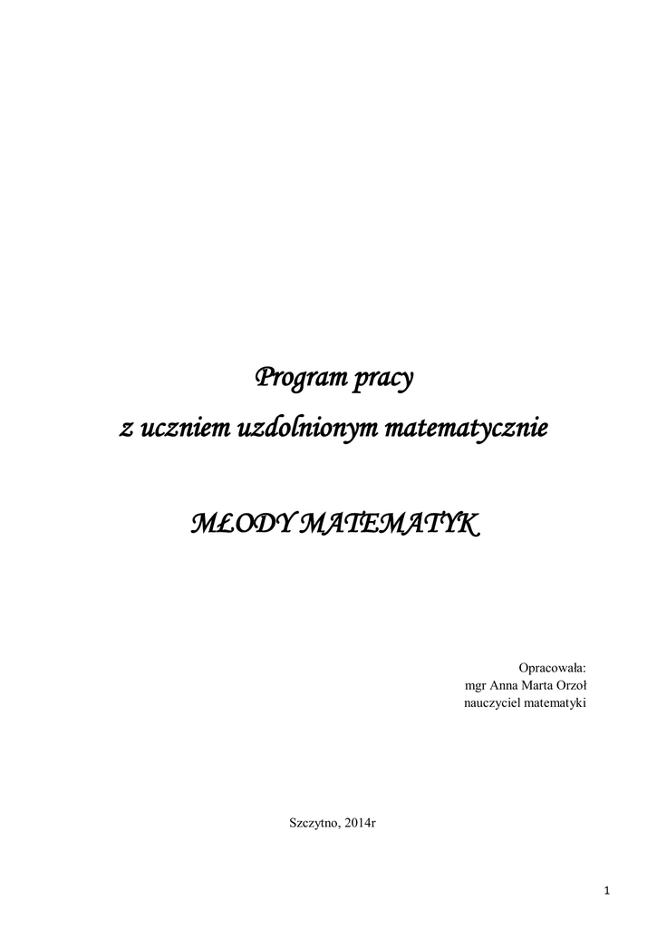 Program pracy z uczniem uzdolnionym matematycznie MŁODY MATEMATYK Opracowała: mgr Anna Marta Orzoł nauczyciel matematyki Szczytno, 2014r 1 WSTĘP Uczestnicząc w różnorodnych zajęciach uczeń powinien mieć możliwość rozwijania swoich zdolności i zainteresowań. W praktyce jednak często skupiamy się na uczniach mających trudności w nauce a mniej uwagi poświęcamy uczniom uzdolnionym. Właśnie w trosce o nich opracowałam ten program. Uczenie się matematyki kształtuje umysł, wdraża do logicznego myślenia, tworzy umiejętność zwięzłego formułowania i wdrażania myśli, przyzwyczaja do stosowania racjonalnych metod organizacji pracy własnej i sprawnego działania. Ponadto wyrabia wartościowe cechy charakteru, takie jak: inicjatywa, samodzielność, krytycyzm, systematyczność i dokładność w pracy, wytrwałość w pokonywaniu trudności wyłaniających się podczas dążenia do zamierzonego celu. Z tych powodów kształcenie matematyczne jest tak ważnym składnikiem kształcenia ogólnego. Zrozumienie wielu zagadnień współczesnej nauki i praktyki wymaga więc dobrej znajomości matematyki. Ale owa dobra znajomość matematyki to nie tylko pamiętanie przeróżnych pojęć i twierdzeń, ale umiejętność znalezienia odpowiedniego modelu matematycznego oraz umiejętność dostrzegania tych problemów w życiu codziennym, nauce i technice. Powinniśmy zatem nauczać matematyki w sposób żywy, a więc tak, aby uczniowie mogli dostrzegać problemy, które na drodze matematycznego zrozumienia można rozwiązać. Stąd narodził się pomysł napisania programu „Młody Matematyk”. CHARAKTERYSTYKA PROGRAMU Program przeznaczony jest do realizacji w klasach IV-VI Szkoły Podstawowej nr 3 w Szczytnie. Będzie realizowany na zajęciach lekcyjnych oraz pozalekcyjnych (kółka matematycznego lub zajęć indywidualnych) wśród uczniów chcących poszerzyć swoją wiedzę z tego przedmiotu. CELE PROGRAMU Cel ogólny Umożliwianie uczniom zdolnym rozwoju twórczego myślenia, poszerzania ich zainteresowań, pomoc w osiąganiu sukcesów. Cele szczegółowe:            popularyzowanie matematyki wśród uczniów, rozwijanie zainteresowań matematycznych, pogłębianie wiedzy z tej dziedziny, kształcenie umiejętności logicznego myślenia, analizowania i wnioskowania, kształcenie umiejętności rozwiązywanie problemów matematycznych w sposób twórczy, kształtowanie wyobraźni przestrzennej, kształtowanie umiejętności pracy z tekstem matematycznym, zachęcanie uczniów do podejmowania samodzielnej pracy nad rozwiązywaniem zadań, kształtowanie umiejętności prezentacji przed grupą rówieśniczą kształcenie umiejętności prowadzenia dyskusji – obrony własnych argumentów, kształcenie umiejętności wykorzystania komputera do nauki matematyki, pobudzanie optymizmu i motywacji do kolejnych działań, szukanie radości w pracy i nauce. 2 FORMY PRACY  lekcje matematyki W pracy z uczniem uzdolnionym matematycznie musimy stosować różne formy. Przede wszystkim należy spożytkować te możliwości, jakie stwarza lekcja. Poprzez pracę w zespołach, grupach można zespolić zdolności, zainteresowania już wzbudzone i pasję poznawczą najlepszych uczniów w klasie z rytmem życia całego zespołu klasowego. Powinni oni pracować razem, mając świadomość, że są potrzebni słabszym kolegom, nie tylko wtedy, gdy pozwalają im odpisywać zadanie domowe, ale przede wszystkim wtedy, gdy wspólnym wysiłkiem organizują pracę w zespole, gdy ich wiedza i zapał służą innym. Właściwie zorganizowana praca na lekcji z uczniami zdolnymi, to z jednej strony prawidłowy rozwój ich talentu, z drugiej zaś umiejętność spożytkowania ich zdolności dla dobra klasy, dla lepszego opanowania materiału przez uczniów słabszych. Na lekcjach matematyki będą realizowane następujące formy pracy:  włączanie ucznia zdolnego do pracy w grupie uczniowskiej,  dodatkowe zadanie dla ucznia uzdolnionego (do rozwiązania w domu lub w czasie lekcji),  organizowanie wszelkiego rodzaju konkursów w rozwiązywaniu zadań trudniejszych,  zwiększone wymagania co do ścisłości i precyzji odpowiedzi i wypowiedzi ucznia.  korygowanie błędów kolegów – szukanie błędów w rozumowaniu,  stworzenie uczniom najzdolniejszym okazji do swobodnego wyboru zadań, wyszukanych samodzielnie, niekoniecznie związanych z bieżącym tematem  koło matematyczne Duże możliwości rozwoju zainteresowań i zdolności uczniów stwarza koło matematyczne. Powinno ono skupić uczniów wykazujących uzdolnienia i zainteresowania matematyką. Praca koła musi odznaczać się swoistymi właściwościami. Nie może to być przede wszystkim przedłużanie tradycyjnej w swoich metodach i formach lekcji szkolnej. Potrzebna tu jest duża swoboda, samodzielność, klimat poszukiwań, dyskretna inspiracja i kierowanie przez nauczyciela rozwojem ucznia, jego zdolnościami i zainteresowaniami, czuwanie nad właściwym i pełnym rozumieniem problemu. Na zajęciach koła matematycznego będą realizowane następujące formy pracy:  rozwiązywanie zadań nietypowych i nieelementarnych, ale tak dobranych, aby można je było rozwiązać w oparciu o wiadomości ze szkoły podstawowej  wykonywanie pomocy dydaktycznych – własnoręcznie i przy wykorzystaniu komputera  przygotowanie przez uczniów prezentacji matematycznych zawierających rozszerzony materiał programowy  współtworzenie strony internetowej www.matani.pl zawierającej ciekawostki matematyczne, informacje o wybitnych matematykach, zadania konkursowe, informacje matematyczne poza programowe.  przygotowanie do konkursów i olimpiad matematycznych poprzez poznawanie nowego, nie objętego programem materiału.  Indywidualne konsultacje i rozmowy ucznia z nauczycielem. Indywidualne konsultacje będą dostosowane do aktualnych potrzeb ucznia zdolnego, w szczególności przed konkursami matematycznymi. Pomogą w lepszym wzajemnym poznaniu się 