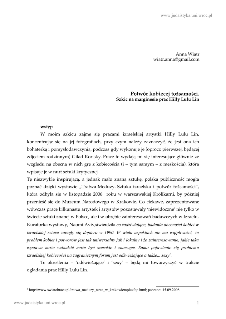 www.judaistyka.uni.wroc.pl Anna Wiatr [email protected] Potwór kobiecej tożsamości. Szkic na marginesie prac Hilly Lulu Lin wstęp W moim szkicu zajmę się pracami izraelskiej artystki Hilly Lulu Lin, koncentrując się na jej fotografiach, przy czym należy zaznaczyć, że jest ona ich bohaterką i pomysłodawczynią, podczas gdy wykonuje je (oprócz pierwszej, będącej zdjęciem rodzinnym) Gilad Korisky. Prace te wydają mi się interesujące głównie ze względu na obecną w nich grę z kobiecością (i – tym samym – z męskością), która wpisuje je w nurt sztuki krytycznej. Tę niezwykle inspirującą, a jednak mało znaną sztukę, polska publiczność mogła poznać dzięki wystawie „Tratwa Meduzy. Sztuka izraelska i potwór tożsamości”, która odbyła się w listopadzie 2006 roku w warszawskiej Królikarni, by później przenieść się do Muzeum Narodowego w Krakowie. Co ciekawe, zaprezentowane wówczas prace kilkunastu artystek i artystów pozostawały ‘niewidoczne’ nie tylko w świecie sztuki znanej w Polsce, ale i w obrębie zainteresowań badawczych w Izraelu. Kuratorka wystawy, Naomi Aviv,stwierdziła co zadziwiające, badania obecności kobiet w izraelskiej sztuce zaczęły się dopiero w 1990. W wielu aspektach nie ma wątpliwości, że problem kobiet i potworów jest tak uniwersalny jak i lokalny i że zainteresowanie, jakie taka wystawa może wzbudzić może być szerokie i znaczące. Samo pojawienie się problemu izraelskiej kobiecości na zagranicznym forum jest odświeżające a także... sexy1. Te określenia – ‘odświeżające’ i ‘sexy’ – będą mi towarzyszyć w trakcie oglądania prac Hilly Lulu Lin. 1 http://www.swiatobrazu.pl/tratwa_meduzy_teraz_w_krakowiempluzfqe.html; pobrano: 15.09.2008 www.judaistyka.uni.wroc.pl 1 www.judaistyka.uni.wroc.pl zazwyczaj dziewczynki są radosne i uśmiechnięte Sztuka krytyczna i refleksja naukowa przenikają się nawzajem, opowiadając o płci/rodzaju2 w kategoriach ich iluzyjności i procesualności. Bycie kobietą, bycie mężczyzną ujmowane jest na gruncie artystycznym i naukowym jako społeczna gra; kulturowa maskarada; u-ja-rzmienie podmiotu. (Codzienne odczucia tzw. zwykłych ludzi są przy tym, w odniesieniu do męskości i kobiecości, osadzone w obrębie przeciwstawnej siatki znaczeń – sfery związane z gender traktowane są jako oczywiste i naturalne). Od takiej naturalności i oczywistości wydaje się też wychodzić Hilla Lulu Lin, gdy jako jedną z fotografii prezentuje „Hillę” (1968), czyli swoje zdjęcie z dzieciństwa – uśmiechniętą, szczerbatą dziewczynkę z długim końskim ogonem z tyły głowy jako znakiem ‘zwyczajnej dziewczynkowatości’. To pierwsze zdjęcie jest zastanawiające z wielu względów; po pierwsze: ‘odstaje’ od innych; po drugie: jest ambiwalentne: dziewczynka (autorka?) jest szczęśliwa i radosna, co kłóci się ze schematem ‘przymusowej socjalizacji’, tego bolesnego uczenia się kobiecości; po trzecie: pojawia się pytanie, po co podważać oczywistość zdjęcia pierwszego, używając do tego zdjęć pozostałych? 3o lat później W 1998 roku powstał cykl „I Lie +” – jedną z tworzących go prac jest fotografia kobiety w białej kominiarce, której twarz, czy raczej to, co zostało z niej ‘do zobaczenia’ to wpółotwarte, krwistoczerwone usta. Przemiana dokonała się – bohaterka została sprowadzona do obiektu seksualnego, a jej twarz – ten cieleśnie najbardziej znaczący element tożsamości – stała się prawie niewidoczna. Ten czas zawieszenia, tożsamościowy niebyt, sprowadzenie bycia osobą do jednej erotycznie nacechowanej części prowadzi do rodzajowej metamorfozy. (Można się zresztą zastanawiać nad tym, ‘kto’ odkrywa/zakrywa kobiece ciała, i czy czasem nie istnieje też taka możliwość, że to zakrywanie/odkrywanie przynależy nie tylko do sfery restrykcyjnej kultury, ale i autonomicznych decyzji kobiety). Kolejne zdjęcia, „Mole” (2004-2005) są bowiem gestem odkrycia. Tyle że nie wiemy, kim jest bohater/bohaterka fotografii. Rodzajowa tożsamość upłynnia się i rozmazuje – wystarczą krótkie włosy i aseksualna (?) koszulka, żeby dokonanie rozróżnienia ‘kobieta-mężczyzna’ stało się trudnie i zastanawiające. Sytuację Wprowadzam tu klasyczne już rozróżnienie na płeć biologiczną (ang. ‘sex’) i płeć społeczno-kulturową czy też rodzaj (ang ‘gender’), choć zdaję sobie sprawę, że w kontekście najnowszych teorii z zakresu gender studies, głównie w ujęciu Judith Butler, opozycja ta staje się coraz trudniejsza do utrzymania. 2 www.judaistyka.uni.wroc.pl 2 www.judaistyka.uni.wroc.pl niedopowiedzenia podkreślają zamknięte oczy - może chodzi zatem o stan snu jako metaforę bycia ‘pomiędzy’. Następne zdjęcie z tego cyklu przedstawia mężczyznę, podobnie śpiącego, ani męskiego (?), ani kobiecego (?). Starość i młodość, męskość i kobiecość przechodzą w siebie, są raczej pewnym continuum niż opozycyjnie ukonstytuowanymi pojęciami – stanami. W tym momencie kreacja artystyczna precyzyjnie przylega do teorii queer i jej dekonstrukcyjnych zabiegów. Judith Butler stwierdza, że płeć kulturowa stanowi (...) konstrukcję, która nieustannie skrywa swoją genezę; cicha zmowa, by odgrywać, produkować i chronić odrębne i spolaryzowane płcie kulturowe jako kulturowe fikcje, pozostaje w ukryciu dzięki wiarygodności tych konstrukcji – i dzięki karom wymierzanym każdemu, kto nie zgadza się im wierzyć. Konstrukcja wymusza naszą wiarę w jej konieczność i naturalność. Historyczne możliwości urzeczywistniane w różnych stylach cielesności to nic innego niż te wspierane groźbą kary kulturowe fikcje, na przemian wcielane i odrzucane pod przymusem3 ‘Wystawienie na pokaz’ podstaw tej gry, zazwyczaj niewidocznych, uzmysławia ich iluzoryczność i arbitralność. Stary mężczyzna, młoda kobieta stają się 