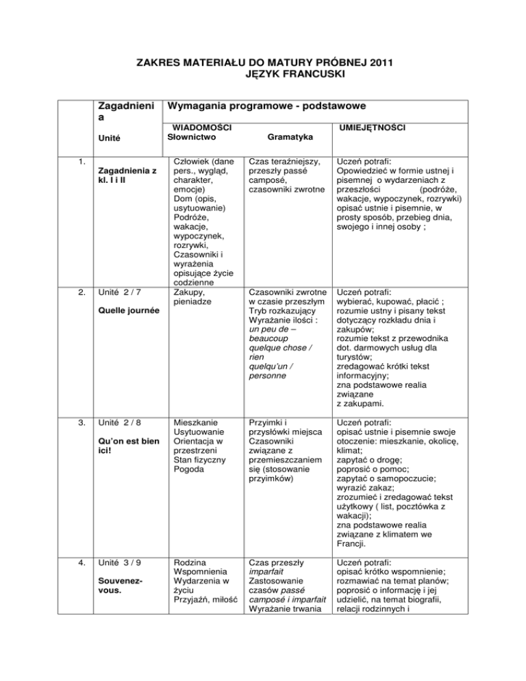ZAKRES MATERIAŁU DO MATURY PRÓBNEJ 2011 JĘZYK FRANCUSKI Zagadnieni a Unité 1. 2. Zagadnienia z kl. I i II Unité 2 / 7 Quelle journée 3. Unité 2 / 8 Qu’on est bien ici! 4. Unité 3 / 9 Souvenezvous. Wymagania programowe - podstawowe WIADOMOŚCI Słownictwo Gramatyka UMIEJĘTNOŚCI Człowiek (dane pers., wygląd, charakter, emocje) Dom (opis, usytuowanie) Podróże, wakacje, wypoczynek, rozrywki, Czasowniki i wyrażenia opisujące życie codzienne Zakupy, pieniadze Czas teraźniejszy, przeszły passé camposé, czasowniki zwrotne Uczeń potrafi: Opowiedzieć w formie ustnej i pisemnej o wydarzeniach z przeszłości (podróże, wakacje, wypoczynek, rozrywki) opisać ustnie i pisemnie, w prosty sposób, przebieg dnia, swojego i innej osoby ; Czasowniki zwrotne w czasie przeszłym Tryb rozkazujący Wyrażanie ilości : un peu de – beaucoup quelque chose / rien quelqu’un / personne Uczeń potrafi: wybierać, kupować, płacić ; rozumie ustny i pisany tekst dotyczący rozkładu dnia i zakupów; rozumie tekst z przewodnika dot. darmowych usług dla turystów; zredagować krótki tekst informacyjny; zna podstawowe realia związane z zakupami. Mieszkanie Usytuowanie Orientacja w przestrzeni Stan fizyczny Pogoda Przyimki i przysłówki miejsca Czasowniki związane z przemieszczaniem się (stosowanie przyimków) Uczeń potrafi: opisać ustnie i pisemnie swoje otoczenie: mieszkanie, okolicę, klimat; zapytać o drogę; poprosić o pomoc; zapytać o samopoczucie; wyrazić zakaz; zrozumieć i zredagować tekst użytkowy ( list, pocztówka z wakacji); zna podstawowe realia związane z klimatem we Francji. Rodzina Wspomnienia Wydarzenia w życiu Przyjaźń, miłość Czas przeszły imparfait Zastosowanie czasów passé camposé i imparfait Wyrażanie trwania Uczeń potrafi: opisać krótko wspomnienie; rozmawiać na temat planów; poprosić o informację i jej udzielić, na temat biografii, relacji rodzinnych i Spójniki alors, donc, mais 5. Unité 3 / 10 przyjacielskich; sporządzić krótką biografię; przedstawić swoją rodzinę; rozumie tekst z tygodnika, np. krótki opis filmu; potrafi zredagować komentarz do zdjęcia. Uczeń potrafi: rozmawiać o środkach komunikacji; nawiązać kontakt; zaprezentować się; wyrazić opinię na temat prawdziwości; domagać się swoich praw; rozumie i potrafi zredagować krótka wiadomośc z życzeniami, podziękowaniami, przeprosinami, etc. Zna francuskie zasady savoirvivre. Środki komunikacji : poczta, telefon, Internet Zaimki osobowe dopełnienia bliższego i dalszego. Wyrażanie częstotliwości i powtarzalności. 6 Unité 3 / 11 . Un bon conseil! Zdrowie i choroba Nazwy części ciała Rozmowa telefoniczna Czasy passé récent, présent progressif,futur proche Mowa zależna Uczeń potrafi: Przedstawić w formie ustnej i pisemnej osobisty problem, np. dot. zdrowia Dawać rady Prowadzić rozmowę telefoniczną Umówić się na spotkanie Rozumie tekst opisujący problemy. 7 Unité 3 / 12 . Parlez-moi de vous. Wygląd, charakter Ubrania kolory Miejsce przymiotnika Zdanie względne z „qui” C’est/il est Tryb rozkazujący czasownika z zaimkiem Słowotwórstwo Uczeń potrafi: Opisać ustnie i pisemnie upodobania, zajęcia, osobowość Umówić się na spotkanie Wytłumaczyć coś i poprosić o wytłumaczenie Rozumie tekst opisujący zachowania, zainteresowania. 8 Unité 4 / 13 . Vivement demain Szkoła, wykształcenie Zmiany Czas przyszły Porównywanie cech i ilości 9 Unité 2/A2 . Tu as du boulot Praca, firma Zakupy odzieży Wyrażanie opini List Zaimki „en” i „y” Conditionel présent Zdania warunkowe Uczeń potrafi: Wypowiadać się na temat: przyszłości, swoich planów, szkolnictwa we Francji i w Polsce Wyrażać zaniepokojenie i zapewnienie Przedstawić propozycję Zredagować CV wyrazić w krótkiej formie pisemnej opinię dot. edukacji Rozumie tekst dot. edukacji Uczeń potrafi: Wypowiadać się na temat pracy i firmy, wyrazić opinię, wybrać i kupić ubranie On s’appelle? motywacyjny 1 Unité 3/A2 0 . Qu’en pensezvous? Administracja, polityka, oskarżenie i obrona, zakaz i pozwolenie Subjonctif,formy i stosowanie, Ilosci Zredagować prosty list formalny Rozumie tekst dot. pracy Uczeń potrafi: Przedstawić problem, wypowiedzieć się za lub przeciw Wyrazić zakaz lub pozwolenie Rozumie tekst dot polityki Zna realia dot. podziału adm. Francji.