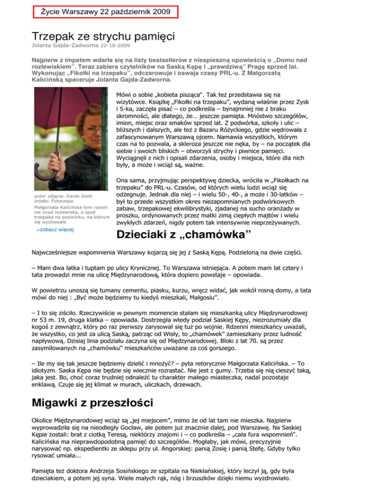 Życie Warszawy 22 październik 2009 Page 1 of 3 DRUKUJ Trzepak ze strychu pamięci Jolanta Gajda-Zadworna 22-10-2009, ostatnia aktualizacja 22-10-2009 20:47 Najpierw z impetem wdarła się na listy bestsellerów z niespieszną opowieścią o „Domu nad rozlewiskiem”. Teraz zabiera czytelników na Saską Kępę i „prawdziwą” Pragę sprzed lat. Wykonując „Fikołki na trzepaku”, odczarowuje i oswaja czasy PRL-u. Z Małgorzatą Kalicińską spaceruje Jolanta Gajda-Zadworna. Mówi o sobie „kobieta pisząca“. Tak teŜ przedstawia się na wizytówce. KsiąŜkę „Fikołki na trzepaku”, wydaną właśnie przez Zysk i S-ka, zaczęła pisać – co podkreśla – bynajmniej nie z braku skromności, ale dlatego, Ŝe… jeszcze pamięta. Mnóstwo szczegółów, imion, miejsc oraz smaków sprzed lat. Z podwórka, szkoły i ulic – bliŜszych i dalszych, ale teŜ z Bazaru RóŜyckiego, gdzie wędrowała z zafascynowanym Warszawą ojcem. Namawia wszystkich, którym czas na to pozwala, a skleroza jeszcze nie nęka, by – na początek dla siebie i swoich bliskich – otworzyli strychy i piwnice pamięci. Wyciągnęli z nich i opisali zdarzenia, osoby i miejsca, które dla nich były, a moŜe i wciąŜ są, waŜne. autor zdjęcia: Darek Golik źródło: Fotorzepa Małgorzata Kalicińska tym razem nie znad rozlewiska, a spod trzepaka na podwórku, na którym się wychowała +zobacz więcej Ona sama, przyjmując perspektywę dziecka, wróciła w „Fikołkach na trzepaku” do PRL-u. Czasów, od których wielu ludzi wciąŜ się odŜegnuje. Jednak dla niej – i wielu 50-, 40-, a moŜe i 30-latków – był to przede wszystkim okres niezapomnianych podwórkowych zabaw, trzepakowej ekwilibrystyki, zjadanej na sucho oranŜady w proszku, ordynowanych przez matki zimą ciepłych majtów i wielu zwykłych zdarzeń, nigdy potem tak intensywnie nieprzeŜywanych. Dzieciaki z „chamówka” Najwcześniejsze wspomnienia Warszawy kojarzą się jej z Saską Kępą. Podzieloną na dwie części. – Mam dwa latka i tuptam po ulicy Krynicznej. To Warszawa istniejąca. A potem mam lat cztery i tata prowadzi mnie na ulicę Międzynarodową, która dopiero powstaje – opowiada. W powietrzu unoszą się tumany cementu, piasku, kurzu, wręcz widać, jak wokół rosną domy, a tata mówi do niej : „Być moŜe będziemy tu kiedyś mieszkali, Małgosiu”. – I to się ziściło. Rzeczywiście w pewnym momencie stałam się mieszkanką ulicy Międzynarodowej nr 53 m. 19, druga klatka – opowiada. Dostrzegła wtedy podział Saskiej Kępy, niezrozumiały dla kogoś z zewnątrz, który po raz pierwszy zarysował się tuŜ po wojnie. Rdzenni mieszkańcy uwaŜali, Ŝe wszystko, co jest za ulicą Saską, patrząc od Wisły, to „chamówek” zamieszkany przez ludność napływową. Dzisiaj linia podziału zaczyna się od Międzynarodowej. Bloki z lat 70. są przez zasymilowanych na „chamówku“ mieszkańców uwaŜane za coś gorszego. – Ile my się tak jeszcze będziemy dzielić i mnoŜyć? – pyta retorycznie Małgorzata Kalicińska. – To idiotyzm. Saska Kępa nie będzie się wiecznie rozrastać. Nie jest z gumy. Trzeba się nią cieszyć taką, jaka jest. Bo, choć coraz trudniej odnaleźć tu charakter małego miasteczka, nadal pozostaje enklawą. Czuje się jej klimat w murach, uliczkach, drzewach. Migawki z przeszłości Okolice Międzynarodowej wciąŜ są „jej miejscem”, mimo Ŝe od lat tam nie mieszka. Najpierw wyprowadziła się na nieodległy Gocław, ale potem juŜ znacznie dalej, pod Warszawę. Na Saskiej Kępie zostali: brat z ciotką Teresą, niektórzy znajomi i – co podkreśla – „cała fura wspomnień“. Kalicińska ma nieprawdopodobną pamięć do szczegółów. Mogłaby, jak mówi, precyzyjnie narysować np. ekspedientki ze sklepu przy ul. Angorskiej: panią Zosię i panią Stefę. Gdyby tylko rysować umiała... Pamięta teŜ doktora Andrzeja Sosińskiego ze szpitala na Niekłańskiej, który leczył ją, gdy była dzieciakiem, a potem jej syna. Wiele małych rąk, nóg i brzuszków dzięki niemu wyzdrowiało. http://www.zyciewarszawy.pl/artykul/413191.html?print=tak 2009-10-23 Page 2 of 3 – Był postacią niezwykłą, czarowną, ale teŜ niekonwencjonalną. I chyba dlatego zbyt szybko wykreśloną z pamięci personelu. Tak strasznie się cieszę się, Ŝe nadal będzie. W mojej ksiąŜce – uśmiecha się autorka. Ślizgawka i Indianie Nieprawdopodobnie waŜnym miejscem rozwoju fizycznego, emocjonalnego i duchowego Małgorzaty Kalicińskiej był park Paderewskiego. Jej ojciec tak o nim mówił, chociaŜ równie słuszna i popularna była nazwa park Skaryszewski. Tej uŜywano bliŜej Pragi. Mieszkańcom Saskiej Kępy zielony teren kojarzył się przede wszystkim z popiersiem znakomitego pianisty, kompozytora i polityka międzywojennej Polski, które nadal tu stoi. Jako córka ojca, który Warszawy wciąŜ był ciekaw, pani Małgorzata nie poprzestaje jednak na przytoczeniu zwyczajowych nazw. Przypomina, Ŝe gwarowo określany jako Skaryszak dopiero w okresie międzywojennym dostał imię Ignacego J. Paderewskiego. Po wojnie znów przemianowany na park Skaryszewski, w 1980 roku powrócił do przedwojennej nazwy. – Do parku Paderewskiego chodziło się na ślizgawkę. Rokrocznie wylewaną tam, gdzie dziś jest klub tenisowy. Z megafonów płynęły przeboje Beatlesów, Skaldów, Czerwonych Gitar. Poza tym poznawało się róŜnych fajnych chłopaków. Zakochiwało się w nich, a potem odkochiwało. Czasami jeździło za rękę, co było niezwykle wprost romantyczne – komentuje z szelmowskim błyskiem w oku. W lecie chodziło się tam na rower i bawiło z chłopakami w Indian. Zaciekle obleganym i bronionym domem szeryfa była… mała stojąca kapliczka. Jednak najwaŜniejsze pozostawało podwórko przy ul. Międzynarodowej 53 – z trzema trzepakami, mnóstwem koleŜanek i kolegów, których – poczynając od pierwszej, a kończąc na czwartej klatce schodowej