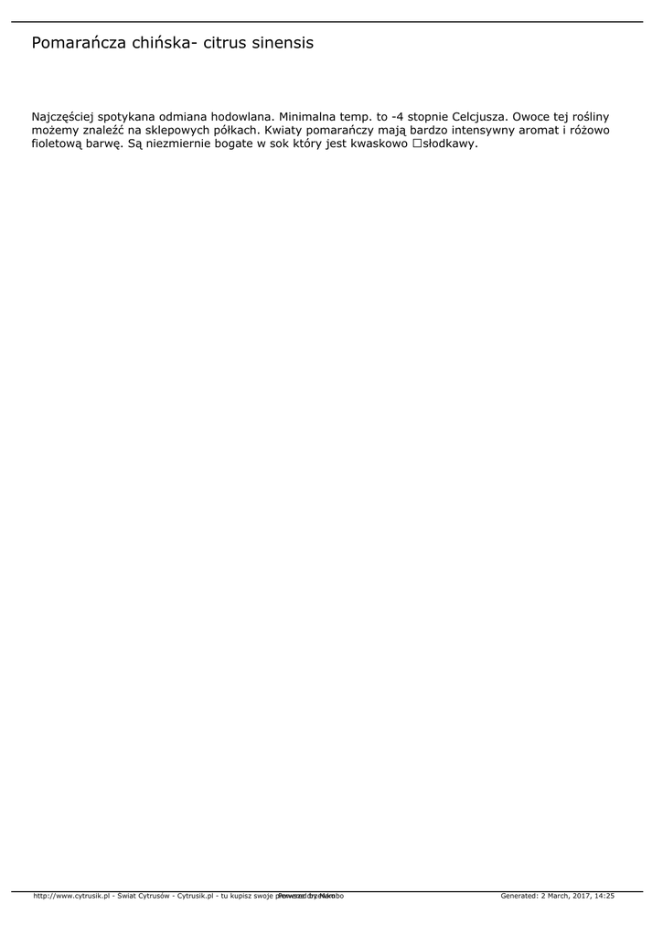Pomarańcza chińska- citrus sinensis Najczęściej spotykana odmiana hodowlana. Minimalna temp. to -4 stopnie Celcjusza. Owoce tej rośliny możemy znaleźć na sklepowych półkach. Kwiaty pomarańczy mają bardzo intensywny aromat i różowo fioletową barwę. Są niezmiernie bogate w sok który jest kwaskowo słodkawy. http://www.cytrusik.pl - Świat Cytrusów - Cytrusik.pl - tu kupisz swoje pierwsze Powered drzewko by Mambo Generated: 2 March, 2017, 14:25