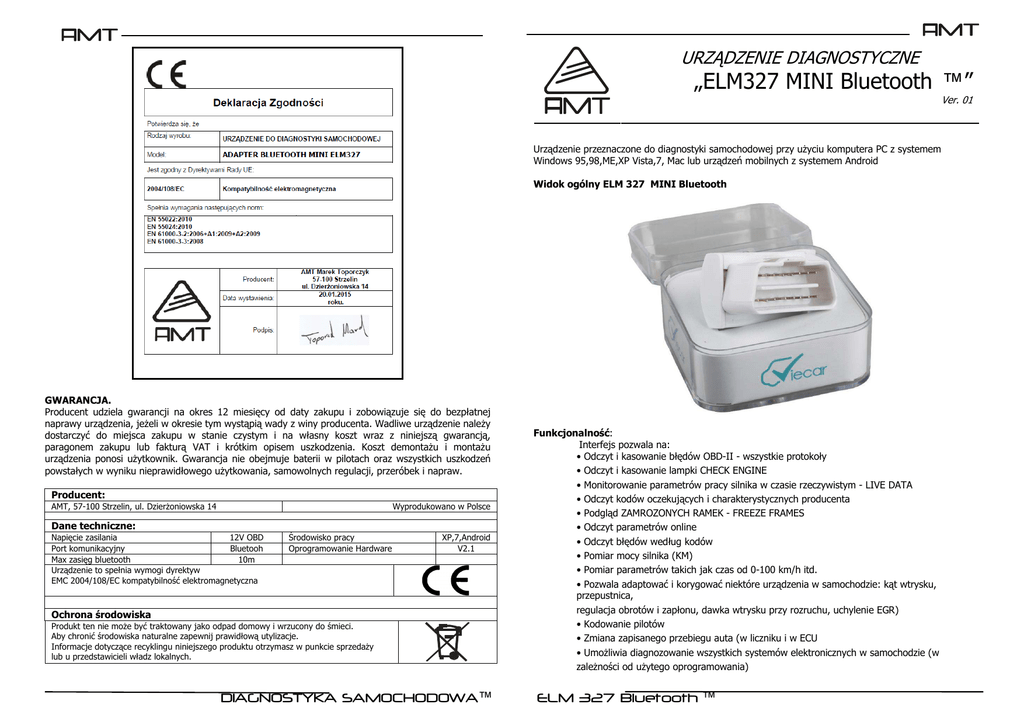 - URZĄDZENIE DIAGNOSTYCZNE „ELM327 MINI Bluetooth ™” Ver. 01 Urządzenie przeznaczone do diagnostyki samochodowej przy uŜyciu komputera PC z systemem Windows 95,98,ME,XP Vista,7, Mac lub urządzeń mobilnych z systemem Android Widok ogólny ELM 327 MINI Bluetooth GWARANCJA. Producent udziela gwarancji na okres 12 miesięcy od daty zakupu i zobowiązuje się do bezpłatnej naprawy urządzenia, jeŜeli w okresie tym wystąpią wady z winy producenta. Wadliwe urządzenie naleŜy dostarczyć do miejsca zakupu w stanie czystym i na własny koszt wraz z niniejszą gwarancją, paragonem zakupu lub fakturą VAT i krótkim opisem uszkodzenia. Koszt demontaŜu i montaŜu urządzenia ponosi uŜytkownik. Gwarancja nie obejmuje baterii w pilotach oraz wszystkich uszkodzeń powstałych w wyniku nieprawidłowego uŜytkowania, samowolnych regulacji, przeróbek i napraw. Producent: AMT, 57-100 Strzelin, ul. DzierŜoniowska 14 Wyprodukowano w Polsce Dane techniczne: Napięcie zasilania 12V OBD Port komunikacyjny Bluetooh Max zasięg bluetooth 10m Urządzenie to spełnia wymogi dyrektyw EMC 2004/108/EC kompatybilność elektromagnetyczna Środowisko pracy Oprogramowanie Hardware XP,7,Android V2.1 Ochrona środowiska Produkt ten nie moŜe być traktowany jako odpad domowy i wrzucony do śmieci. Aby chronić środowiska naturalne zapewnij prawidłową utylizacje. Informacje dotyczące recyklingu niniejszego produktu otrzymasz w punkcie sprzedaŜy lub u przedstawicieli władz lokalnych. DIAGNOSTYKA SAMOCHODOWA™ Funkcjonalność: Interfejs pozwala na: • Odczyt i kasowanie błędów OBD-II - wszystkie protokoły • Odczyt i kasowanie lampki CHECK ENGINE • Monitorowanie parametrów pracy silnika w czasie rzeczywistym - LIVE DATA • Odczyt kodów oczekujących i charakterystycznych producenta • Podgląd ZAMROZONYCH RAMEK - FREEZE FRAMES • Odczyt parametrów online • Odczyt błędów według kodów • Pomiar mocy silnika (KM) • Pomiar parametrów takich jak czas od 0-100 km/h itd. • Pozwala adaptować i korygować niektóre urządzenia w samochodzie: kąt wtrysku, przepustnica, regulacja obrotów i zapłonu, dawka wtrysku przy rozruchu, uchylenie EGR) • Kodowanie pilotów • Zmiana zapisanego przebiegu auta (w liczniku i w ECU • UmoŜliwia diagnozowanie wszystkich systemów elektronicznych w samochodzie (w zaleŜności od uŜytego oprogramowania) ELM 327 Bluetooth ™ Oprogramowanie, które współpracuje z ELM 327 Bluetooth: • Scantool.net • Polski Vag 4.9 • Engine Check • GM Mode 22 Scan Tool by Terry • OBD Gauge for PalmOS and Pocket PC by Dana Peters • OBD Logger by Jonathan Senkerik • OBD-II ScanMaster • obd2crazy.com • OBD2 Scantool by Ivan Andrzejewski • OBDII for ELM322 by David Huffman • pyOBD by Donour Sizemore • RDDTC by Pete Calinski • Real Scan by Brent Harris • ScanTest for Pocket PC by Ivan Ganev • wOBD by WDT • easy OBD • DigiMoto • PCMSCAN (umoŜliwia m.in. pomiar mocy i czasow) • i wieloma innymi darmowymi i płatnymi programami równieŜ w wersji PL Obsługiwane protokoły • J1850 PWM (41.6 kbaud) • J1850 VPW (10.4 kbaud) • ISO 9141-2 (5 baud init, 10.4 kbaud) • ISO KWP (5 baud init, 10.4 kbaud) • ISO KWP (fast init, 10.4 kbaud) • ISO CAN (11 bit ID, 500 kbaud) • ISO CAN (29 bit ID, 500 kbaud) • ISO CAN (11 bit ID, 250 kbaud) • ISO CAN (29 bit ID, 250 kbaud) Podłączenie i obsługa Korzystanie z interfejsu diagnostycznego jest niezwykle proste. Urządzenie z jednej strony podłączamy do złącza diagnostycznego w samochodzie. W komputerze wyposaŜonym w technologie bluetooth wyszukujemy urządzenie pamiętając o tym Ŝe musi on się znajdować w niewielkiej odległości. Po wyszukaniu interfejsu parujemy je z naszym komputerem za pomocą kod 0000 lub 1234 Do współpracy z komputerem PC niezbędne jest odszukania w menadŜerze urządzeń zainstalowanego portu komunikacyjny bluetooth i ustaleniu parametru portu do komunikacji 9600 bit/sek Dopiero teraz uruchamiamy właściwe oprogramowanie w którym ustawiamy właściwy port komunikacyjny dostosowany do współpracy z interfejsem bluetooth Uwagi instalacyjne • NaleŜy pamiętać aby po zainstalowaniu i skonfigurowaniu interfejsu do komunikacji bluetooth uŜywać tego samego portu juŜ zawsze. Sparowanie inny bluetooth wymusza przeprowadzenie ponownej konfiguracji portu komunikacji bluetooth • Oprogramowanie diagnostyczne wykryje interfejs tylko wtedy gdy zostanie on poprawnie skonfigurowany oraz gdy interfejs będzie wpięty w port diagnostyczny samochodu i kluczyk będzie przekręcony w pozycję ZAPŁON. • Podczas podłączania interfejsu do samochodu i komputera naleŜy zachować następującą kolejność: podłączenie interfejsu do wtyku ODB2 samochodu; uruchomienie komunikacji bluetooth, następnie przekręcenie kluczyka samochodu w pozycję ZAPŁON. Odłączanie interfejsu powinno odbywać się w odwrotnej kolejności co jego podłączenie. • Podczas pracy z interfejsem moŜna usłyszeć charakterystyczne „tykanie”. Jest to normalny objaw poprawnej pracy urządzenia i nie naleŜy się nim przejmować Wymagania sprzętowe PC • Auto zgodne ze specyfikacja OBD2 • Gniazdo OBD2 w samochodzie • Komputer klasy Pentium • Bluetooth w komputerze, laptopie, Pocket-PC (PDA) • Windows CE, 95, 98, Me, 2000, XP, Vista 32/64bit, 7 32/64bit, Mac DIAGNOSTYKA SAMOCHODOWA™ ELM 327 Bluetooth ™