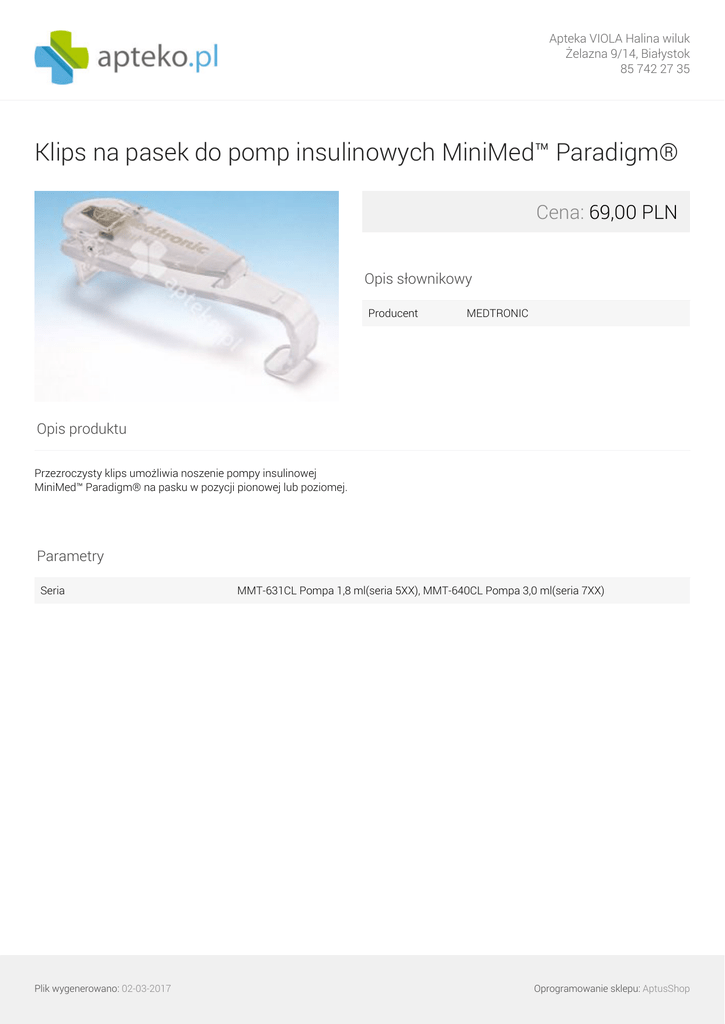 Apteka VIOLA Halina wiluk Żelazna 9/14, Białystok 85 742 27 35 Klips na pasek do pomp insulinowych MiniMed™ Paradigm® Cena: 69,00 PLN Opis słownikowy Producent MEDTRONIC Opis produktu Przezroczysty klips umożliwia noszenie pompy insulinowej MiniMed™ Paradigm® na pasku w pozycji pionowej lub poziomej. Parametry Seria Plik wygenerowano: 02-03-2017 Powered by TCPDF (www.tcpdf.org) MMT-631CL Pompa 1,8 ml(seria 5XX), MMT-640CL Pompa 3,0 ml(seria 7XX) Oprogramowanie sklepu: AptusShop
