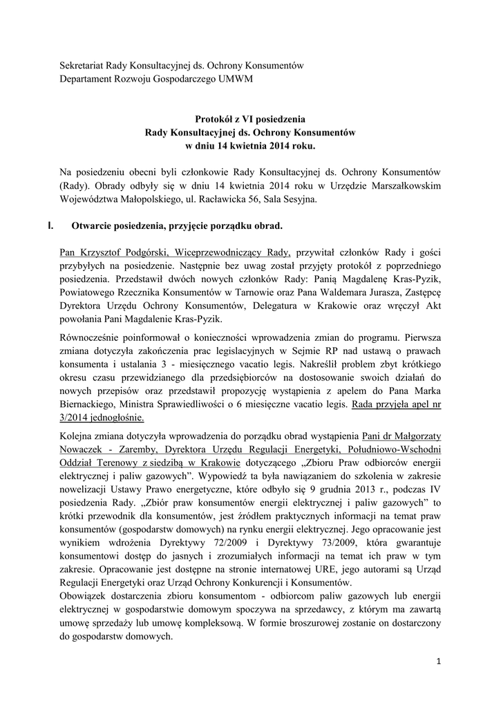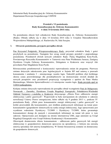 Sekretariat Rady Konsultacyjnej ds. Ochrony Konsumentów Departament Rozwoju Gospodarczego UMWM Protokół z VI posiedzenia Rady Konsultacyjnej ds. Ochrony Konsumentów w dniu 14 kwietnia 2014 roku. Na posiedzeniu obecni byli członkowie Rady Konsultacyjnej ds. Ochrony Konsumentów (Rady). Obrady odbyły się w dniu 14 kwietnia 2014 roku w Urzędzie Marszałkowskim Województwa Małopolskiego, ul. Racławicka 56, Sala Sesyjna. I. Otwarcie posiedzenia, przyjęcie porządku obrad. Pan Krzysztof Podgórski, Wiceprzewodniczący Rady, przywitał członków Rady i gości przybyłych na posiedzenie. Następnie bez uwag został przyjęty protokół z poprzedniego posiedzenia. Przedstawił dwóch nowych członków Rady: Panią Magdalenę Kras-Pyzik, Powiatowego Rzecznika Konsumentów w Tarnowie oraz Pana Waldemara Jurasza, Zastępcę Dyrektora Urzędu Ochrony Konsumentów, Delegatura w Krakowie oraz wręczył Akt powołania Pani Magdalenie Kras-Pyzik. Równocześnie poinformował o konieczności wprowadzenia zmian do programu. Pierwsza zmiana dotyczyła zakończenia prac legislacyjnych w Sejmie RP nad ustawą o prawach konsumenta i ustalania 3 - miesięcznego vacatio legis. Nakreślił problem zbyt krótkiego okresu czasu przewidzianego dla przedsiębiorców na dostosowanie swoich działań do nowych przepisów oraz przedstawił propozycję wystąpienia z apelem do Pana Marka Biernackiego, Ministra Sprawiedliwości o 6 miesięczne vacatio legis. Rada przyjęła apel nr 3/2014 jednogłośnie. Kolejna zmiana dotyczyła wprowadzenia do porządku obrad wystąpienia Pani dr Małgorzaty Nowaczek - Zaremby, Dyrektora Urzędu Regulacji Energetyki, Południowo-Wschodni Oddział Terenowy z siedzibą w Krakowie dotyczącego „Zbioru Praw odbiorców energii elektrycznej i paliw gazowych”. Wypowiedź ta była nawiązaniem do szkolenia w zakresie nowelizacji Ustawy Prawo energetyczne, które odbyło się 9 grudnia 2013 r., podczas IV posiedzenia Rady. „Zbiór praw konsumentów energii elektrycznej i paliw gazowych” to krótki przewodnik dla konsumentów, jest źródłem praktycznych informacji na temat praw konsumentów (gospodarstw domowych) na rynku energii elektrycznej. Jego opracowanie jest wynikiem wdrożenia Dyrektywy 72/2009 i Dyrektywy 73/2009, która gwarantuje konsumentowi dostęp do jasnych i zrozumiałych informacji na temat ich praw w tym zakresie. Opracowanie jest dostępne na stronie internatowej URE, jego autorami są Urząd Regulacji Energetyki oraz Urząd Ochrony Konkurencji i Konsumentów. Obowiązek dostarczenia zbioru konsumentom - odbiorcom paliw gazowych lub energii elektrycznej w gospodarstwie domowym spoczywa na sprzedawcy, z którym ma zawartą umowę sprzedaży lub umowę kompleksową. W formie broszurowej zostanie on dostarczony do gospodarstw domowych. 1 Głównym celem opracowanego dokumentu jest zwiększenie świadomości odbiorców w gospodarstwach domowych dotyczących ich praw – dostęp do informacji oraz edukacja. Ponadto, zachęcenie ich do aktywnego działania na rynku, poszukiwania korzystnych ofert zakupu energii, rozważnych wyborów i podejmowania decyzji wzakresie zmiany sprzedawcy. Dzięki temu zwiększy się presja konsumentów na sprzedawców w celu zapewnienia odpowiednich standardów jakości obsługi, a przez to zwiększy się konkurencja na rynku gospodarstw domowych, II. Działalność i kompetencje Wojewódzkiego Inspektoratu Farmaceutycznego, w tym płaszczyzny współpracy z powiatowymi rzecznikami konsumentów. Pan Józef Łoś, Małopolski Wojewódzki Inspektor Farmaceutyczny, pokrótce przedstawił podstawy prawne działania Inspektoratu w Krakowie. Inspektorat obejmuje zakresem swojego działania teren województwa małopolskiego. W strukturze są dwie Delegatury Inspektoratu, Delegatura w Nowym Sączu obejmująca obszary powiatów gorlickiego, limanowskiego, nowosądeckiego oraz Nowy Sącz - miasto na prawach powiatu (email: [email protected]) oraz Delegatura w Tarnowie: obszary powiatów brzeskiego, bocheńskiego, dąbrowskiego, tarnowskiego oraz Tarnowa miasta na prawach powiatu (email: [email protected] ). Do zadań Inspektoratu należy sprawowanie nadzoru nad jakością i obrotem produktami leczniczymi oraz wyrobami medycznymi w celu zabezpieczenia interesu społecznego w zakresie bezpieczeństwa zdrowia i życia obywateli przy stosowaniu produktów leczniczych i wyrobów medycznych znajdujących się w hurtowniach farmaceutycznych, aptekach, punktach aptecznych i placówkach obrotu pozaaptecznego, na terenie województwa małopolskiego. Pan Józef Łoś poinformował, że MWIF wykonuje w imieniu Wojewody Małopolskiego zadania i kompetencje Państwowej Inspekcji Farmaceutycznej wymienionej w Rozdziale 8 ustawy Prawo Farmaceutyczne (Dz. U. z 2008 r. Nr 45, poz. 271 z późn. zm.). Omówił kwestię zwrotu leku do apteki, który jest możliwy jedynie w przypadku gdy lek będzie błędnie wydany, niezgodnie z receptą lub wykazania wady fabrycznej leku. W pozostałych przypadkach, gdy apteka wyda lek nie ma możliwości zwrotu leku i ponownego wprowadzenia go do obrotu. Następnie przedstawił komórki organizacyjne Wojewódzkiego Inspektoratu Farmaceutycznego w Krakowie oraz decyzje podejmowane przez organy Inspekcji Farmaceutycznej, w zakresie: wstrzymania lub wycofania z obrotu lub stosowania w zakładach opieki zdrowotnej produktów leczniczych w przypadku podejrzenia lub stwierdzenia, że dany produkt lub wyrób nie jest dopuszczony do obrotu w Polsce, wstrzymania lub wycofania z obrotu lub stosowania w zakładach opieki zdrowotnej produktów leczniczych w przypadku podejrzenia lub stwierdzenia, że dany produkt lub wyrób posiada wadę jakościowa, wstrzymania lub wycofania z aptek ogólnodostępnych i hurtowni farmaceutycznych towarów, którymi obrót jest niedozwolony, wstrzymania w obrocie wyrobów medycznych w przypadku podejrzenia, że dany wyrób nie odpowiada ustalonym dla niego wymaganiom jakościowym. MWIF może 2 jedynie wstr