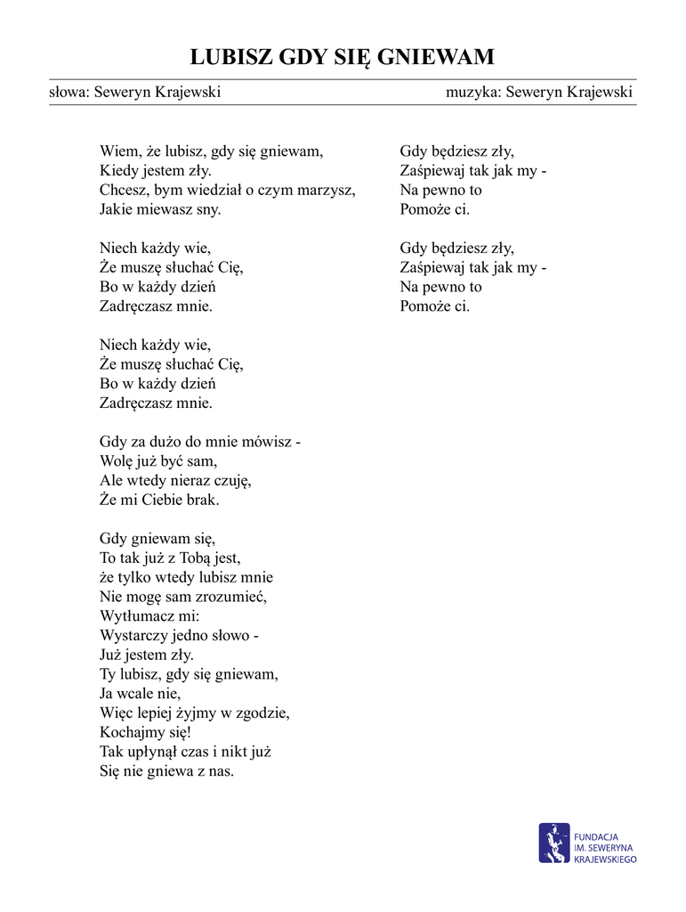 LUBISZ GDY SIĘ GNIEWAM słowa: Seweryn Krajewski muzyka: Seweryn Krajewski Wiem, że lubisz, gdy się gniewam, Kiedy jestem zły. Chcesz, bym wiedział o czym marzysz, Jakie miewasz sny. Gdy będziesz zły, Zaśpiewaj tak jak my Na pewno to Pomoże ci. Niech każdy wie, Że muszę słuchać Cię, Bo w każdy dzień Zadręczasz mnie. Gdy będziesz zły, Zaśpiewaj tak jak my Na pewno to Pomoże ci. Niech każdy wie, Że muszę słuchać Cię, Bo w każdy dzień Zadręczasz mnie. Gdy za dużo do mnie mówisz Wolę już być sam, Ale wtedy nieraz czuję, Że mi Ciebie brak. Gdy gniewam się, To tak już z Tobą jest, że tylko wtedy lubisz mnie Nie mogę sam zrozumieć, Wytłumacz mi: Wystarczy jedno słowo Już jestem zły. Ty lubisz, gdy się gniewam, Ja wcale nie, Więc lepiej żyjmy w zgodzie, Kochajmy się! Tak upłynął czas i nikt już Się nie gniewa z nas.