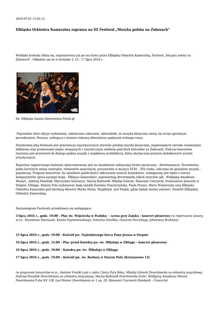 2016-07-01 11:01:12 Elbląska Orkiestra Kameralna zaprasza na III Festiwal „Muzyka polska na Żuławach” Wielkimi krokami zbliża się, organizowany już po raz trzeci przez Elbląską Orkiestrę Kameralną, Festiwal „Muzyka polska na Żuławach”. Odbędzie się on w terminie 3, 15 - 17 lipca 2016 r. fot. Elbląska Gazeta Internetowa Portel.pl Poprzednie dwie edycje wydarzenia, zakończone sukcesem, udowodniły, że muzyka klasyczna cieszy się wciąż ogromnym powodzeniem. Porusza, wzbogaca i stanowi ciekawą alternatywę spędzania wolnego czasu. Niezmienną ideą festiwalu jest prezentacja najciekawszych utworów polskiej muzyki klasycznej, inspirowanych szeroko rozumianym folklorem oraz promowanie miejsc związanych z turystycznym szlakiem gotyckich kościołów na Żuławach. Podczas koncertów tworzona jest przestrzeń do dialogu piękna muzyki z wyjątkową architekturą, która słuchaczom przynosi dodatkowych wrażeń artystycznych. Repertuar tegorocznego festiwalu skoncentrowany jest na niezmiernie wdzięcznej formie muzycznej – divertimenach. Diverimenta, pełne barwnych zmian nastrojów, elementów tanecznych, powszechne w muzyce XVIII – XIX wieku, zaliczano do gatunków muzyki… popularnej. Program koncertów, by umożliwić publiczności odkrywanie nowych kontekstów, wzbogacony jest także o utwory kompozytorów spoza naszego kraju. Elbląscy kameraliści, zaprezentują divertimenta takich mistrzów jak: Wolfgang Amadeusz Mozart, Andrzej Panufnik, Mieczysław Karłowicz, Maciej Radziwiłł, Mikołaj Górecki, Sławomir Czarnecki. Festiwalowe koncerty w Stegnie, Elblągu, Starym Polu wykonywać będą solistki Karolina Nowotczyńska, Paula Preuss, Maria Wiśniewska oraz Elbląska Orkiestra Kameralna pod dyrekcją Maestro Marka Mosia. Wyjątkiem jest Pasłęk, gdzie będzie można usłyszeć Kwartet Elbląskiej Orkiestry Kameralnej. Harmonogram Festiwalu przedstawia się następująco: 3 lipca 2016 r., godz. 19:00 – Plac św. Wojciecha w Pasłęku – scena przy Zamku - koncert plenerowy (w repertuarze utwory m.in.: Stanisława Moniuszki, Karola Szymanowskiego, Antonina Dvořáka, Giacomo Pucciniego, Johannesa Brahmsa) 15 lipca 2016 r., godz. 19:00 - Kościół pw. Najświętszego Serca Pana Jezusa w Stegnie 16 lipca 2016 r., godz. 15:00 – Plac przed Katedrą pw. św. Mikołaja w Elblągu – koncert plenerowy 16 lipca 2016 r., godz. 19:00 – Katedra pw. św. Mikołaja w Elblągu 17 lipca 2016 r., godz. 19:00 – Kościół pw. św. Barbary w Starym Polu (Krzyżanowo 13) (w programie koncertów m.in.: Antonio Vivaldi Lato z cyklu Cztery Pory Roku, Mikołaj Górecki Divertimento na orkiestrę smyczkową, Andrzej Panufnik Divertimento na orkiestrę smyczkową, Maciej Radziwiłł Divertimento D-dur, Wolfgang Amadeusz Mozart Divertimento F-dur KV 138, Leó Weiner Divertimento nr 1 op. 20, Sławomir Czarnecki Hombark – Concerto) Wstęp na wszystkie koncerty jest bezpłatny! Przed każdym z koncertów odbędzie się otwarta próba generalna dla dzieci i młodzieży ze specjalnie przygotowanym repertuarem. fot. Elbląska Gazeta Internetowa Portel.pl Sponsor Strategiczny Mecenas Elbląskiej Orkiestry Kameralnej: Siemens Sp. z o.o. Sponsor Elbląskiej Orkiestry Kameralnej: Grupa Energa Sponsorzy Wspierający: Meble Wójcik, Metal Expert Sp. z o.o. Sp. J, Toyota Knedler Sp. z o.o. Informacje o artykule Autor: Zredagował(a): Data powstania: Michał Jarosz 01.07.2016 11:01 Data ostatniej modyfikacji: Liczba wyświetleń: Wydrukowano z serwisu: Wydrukowano dnia: 326 stegna.pl 2017-03-02 14:22:53