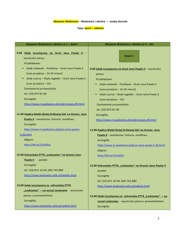 Aktywne Wadowice - Wadowice i okolice – osoby dorosłe Typy: sport – zabawa Aktywne Wadowice i okolice w 1 – dzień Aktywne Wadowice i okolice w 2 – dni 9.00 Szlak turystyczny na Groń Jana Pawła II – Dzień 1 wycieczka piesza Przykładowo: Szlak niebieski - Ponikiew – Groń Jana Pawła II (czas przejścia – 1h 45 minut) Szlak czarny – Rzyki Jagódki – Groń Jana Pawła II (czas przejścia – 1h) Zamówienie przewodnika: tel. (33) 873 81 00 Szczegóły: http://www.it.wadowice.pl/szlaki-piesze,40.html 9.00 Szlak turystyczny na Groń Jana Pawła II – wycieczka piesza Przykładowo: Szlak niebieski - Ponikiew – Groń Jana Pawła II (czas przejścia – 1h 45 minut) Szlak czarny – Rzyki Jagódki – Groń Jana Pawła II (czas przejścia – 1h) Zamówienie przewodnika: tel. (33) 873 81 00 11.00 Kaplica Matki Bożej Królowej Gór na Groniu Jana Pawła II - zwiedzanie, historia, modlitwa. Szczegóły: http://www.it.wadowice.pl/szlaki-piesze,40.html Szczegóły: http://www.it.wadowice.pl/gron-jana-pawlaii,36.html 11.00 Kaplica Matki Bożej Królowej Gór na Groniu Jana Pawła II - zwiedzanie, historia, modlitwa. Zdjęcia: Szczegóły: http://bit.ly/1GoXlGo http://www.it.wadowice.pl/gron-jana-pawla-ii,36.html Zdjęcia: 12.00 Schronisko PTTK „Leskowiec” na Groniu Jana http://bit.ly/1GoXlGo Pawła II - posiłek Szczegóły: 12.00 Schronisko PTTK „Leskowiec” na Groniu Jana Pawła II - tel. (33) 872 16 94; 606 743 880 posiłek http://www.leskowiec.pttk.pl/widoki.html Szczegóły: tel. (33) 872 16 94; 606 743 880 13.00 Szlak turystyczny ze schroniska PTTK http://www.leskowiec.pttk.pl/widoki.html „Leskowiec” – na szczyt Leskowiec - wycieczka piesza z przewodnikiem 13.00 Szlak turystyczny ze schroniska PTTK „Leskowiec” – na Szczegóły: szczyt Leskowiec - wycieczka piesza z przewodnikiem http://www.leskowiec.pttk.pl/widoki.html Szczegóły: 1 http://www.leskowiec.pttk.pl/widoki.html 13.30 Panoramy z Leskowca – czas wolny (1 h 30 13.30 Panoramy z Leskowca – czas wolny (1h 30 minut) minut) Szczegóły: Szczegóły: http://www.leskowiec.pttk.pl/widoki.html http://www.leskowiec.pttk.pl/widoki.html Zdjęcia: Zdjęcia: http://bit.ly/1ef6kPI http://bit.ly/1ef6kPI 15.00 Zejście szlakiem turystycznym 15.00 Zejście szlakiem turystycznym 17.00 Powrót do Wadowic 17.00 Powrót do Wadowice Do wyboru również inne szlaki: w rejonie Leskowca i Gronia Jana Pawła II; Łysej Góry i Ostrego Leskowca i Gronia Jana Pawła II; Łysej Góry i Wierchu; Jaroszowickiej Góry Ostrego Wierchu; Jaroszowickiej Góry Do wyboru również inne szlaki: w rejonie Szczegóły: Szczegóły: http://www.it.wadowice.pl/szlaki-piesze,40.html http://www.it.wadowice.pl/szlakipiesze,40.html NOCLEG Hotele, motele, domy pielgrzyma Kwatery prywatne Agroturystyka Schroniska Noclegi w okolicy Noclegi dla niepełnosprawnych Szczegóły: http://www.it.wadowice.pl/noclegi,1,obj Dzień 2 9.00 Spływ Kajakiem po Skawie Szczegóły: http://kajaki-na-skawie.pl/ 2 15.00 Czas na obiad i spacer po mieście przykładowo do wyboru na: http://www.it.wadowice.pl/restauracje-ijadlodajnie,10,obj 18.00 Powrót do Wadowic Aktywne Wadowice i okolice w 1 – dzień Propozycję tras rowerowych Aktywne Wadowice i okolice w 6 – dni (Beskidzka Droga św. Jakuba Ap.-Camino de Santiago) Dwa etapy Beskidzkiej Drogi św. Jakuba Ap. - Camino de Santiago (II i III) prowadzą przez Wadowice i okolice: I. Trasa północna: Wadowice – Zator 7.00 Szlak rowerowy prowadzący z Wadowic do Zatora - wycieczka rowerowa Szczegóły: Długość: ok. 20 km Szlak rowerowy: niebieski Miejscowości na trasie: Wadowice -> Tomice-> Witanowice -> Woźniki-> Grodzisko-> Trzebieńczyce -> Zator Dzień 1 II. Myślenice- Sułkowice- Lanckorona- Kalwaria ZebrzydowskaWadowice Długość: 50 km Uwagi: trasa rekreacyjna – wzdłuż biegu rzeki Skawy Odcinek ten, najwygodniej można podzielić na 2 fragmenty: Atrakcje na trasie: Wadowice: miejsca związane z postacią Karola 1.Myślenice – Kalwaria Zebrzydowska( nocleg w Kalwarii Zebrzydowskiej) – 27,2 km Wojtyły (papieża Jana Pawła II) m.in. Muzeum Dom Rodzinny Ojca Świętego Jana Pawła II czy Bazylika Ofiarowania NMP. Aby ułatwić zwiedzanie przygotowano Szlak Karola Wojtyły (pieszy – miejski ) wraz z bezpłatną mobilną NOCLEG w Kalwarii Zebrzydowskiej Szczegóły: http://www.it.wadowice.pl/noclegi,1,obj aplikacją na smartphone i tablet. Szczegóły: www.it.wadowice.pl Tomice: Po drodze do Tomic - Cmentarz z I Wojny Światowej; Cmentarz Żydowski z XIX w.; Tomice: kościół pw. św. Joachima i Anny (XX w.); kaplica św. Jakuba (1880 r.), Kapliczka p.w. Dzień 2 3 św. Floriana z 1843 r. ; Galeria sztuki „Bałysówka” w zabytkowym budynku drewnianym z II poł. XIX w.; Stawy Tomice – stawy rybne. 2.Kalwaria Zebrzydowska – Wadowice – 22,8 km Witanowice: miejsca widokowe – z przysiółków Radwany i Wieńce, ze stoków Krzemionki i wzgórza Pagór, a w szczególności z NOCLEG w Wadowicach Witanowickiego Działu rozciągają się Szczegóły: http://www.it.wadowice.pl/noclegi,1,obj imponujące widoki na głęboką dolinę Skawy, Wadowice, Beskid Mały z Leskowcem, wyniosłe szczyty Beskidu Średniego z Babią Górą, a nawet szczyty Tatr. Północny horyzont zamykają wyrównane pagóry jurajskiej Wyżyny Dzień 3 Dzień w Wadowicach Krakowskiej z Garbem Tenczyńskim. Miejsca o wysokich walorach przyrodniczych: dolina Skawy, Wiązowa Górka, drzewa – pomniki przyrody. Woźniki: gotycki kościół pw. Wniebowzięcia NMP (XVI w.); liczne kapliczki XIX – wieczne; Miejsca widokowe - z najwyższego punktu w Woźnikach, Grudek (294 m n.p.m.), rozciąga się 9.00 Muzeum Dom Rodzinny Ojca Świętego Jana Pawła II – zwiedzanie (70min) Rezerwacja: tel. +48 33 823 35 65, 33 823 26 62 www.domjp2.pl daleki, nieomal panoramiczny widok w kierunku południowym od wschodu ku zachodowi: na Pasmo Draboża, Pasmo Mosiórki, rozłożystą Jaroszowicką Górę, 10.20 Czas na papieską k