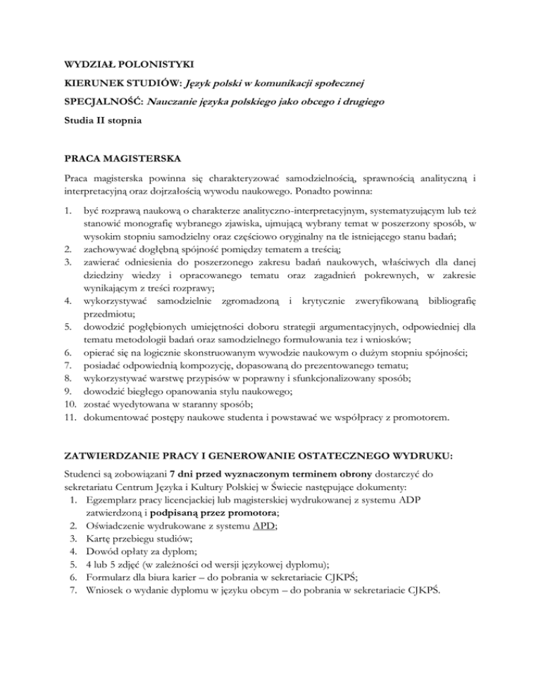 WYDZIAŁ POLONISTYKI KIERUNEK STUDIÓW: Język polski w komunikacji społecznej SPECJALNOŚĆ: Nauczanie języka polskiego jako obcego i drugiego Studia II stopnia PRACA MAGISTERSKA Praca magisterska powinna się charakteryzować samodzielnością, sprawnością analityczną i interpretacyjną oraz dojrzałością wywodu naukowego. Ponadto powinna: 1. być rozprawą naukową o charakterze analityczno-interpretacyjnym, systematyzującym lub też stanowić monografię wybranego zjawiska, ujmującą wybrany temat w poszerzony sposób, w wysokim stopniu samodzielny oraz częściowo oryginalny na tle istniejącego stanu badań; 2. zachowywać dogłębną spójność pomiędzy tematem a treścią; 3. zawierać odniesienia do poszerzonego zakresu badań naukowych, właściwych dla danej dziedziny wiedzy i opracowanego tematu oraz zagadnień pokrewnych, w zakresie wynikającym z treści rozprawy; 4. wykorzystywać samodzielnie zgromadzoną i krytycznie zweryfikowaną bibliografię przedmiotu; 5. dowodzić pogłębionych umiejętności doboru strategii argumentacyjnych, odpowiedniej dla tematu metodologii badań oraz samodzielnego formułowania tez i wniosków; 6. opierać się na logicznie skonstruowanym wywodzie naukowym o dużym stopniu spójności; 7. posiadać odpowiednią kompozycję, dopasowaną do prezentowanego tematu; 8. wykorzystywać warstwę przypisów w poprawny i sfunkcjonalizowany sposób; 9. dowodzić biegłego opanowania stylu naukowego; 10. zostać wyedytowana w staranny sposób; 11. dokumentować postępy naukowe studenta i powstawać we współpracy z promotorem. ZATWIERDZANIE PRACY I GENEROWANIE OSTATECZNEGO WYDRUKU: Studenci są zobowiązani 7 dni przed wyznaczonym terminem obrony dostarczyć do sekretariatu Centrum Języka i Kultury Polskiej w Świecie następujące dokumenty: 1. Egzemplarz pracy licencjackiej lub magisterskiej wydrukowanej z systemu ADP zatwierdzoną i podpisaną przez promotora; 2. Oświadczenie wydrukowane z systemu APD; 3. Kartę przebiegu studiów; 4. Dowód opłaty za dyplom; 5. 4 lub 5 zdjęć (w zależności od wersji językowej dyplomu); 6. Formularz dla biura karier – do pobrania w sekretariacie CJKPŚ; 7. Wniosek o wydanie dyplomu w języku obcym – do pobrania w sekretariacie CJKPŚ. OCENA NA DYPLOMIE Przy obliczaniu średniej na dyplomie ukończenia studiów licencjackich i magisterskich uwzględniane są następujące parametry: 1. Średnia ocena ze studiów (z przedmiotów zaliczonych egzaminem i uwzględnianych w średniej)1. 2. Ocena pracy magisterskiej ustalona przez promotora i recenzenta2. 3. Ocena z egzaminu magisterskiego zdawanego przed komisją składającą się z promotora, recenzenta i przewodniczącego. Uzyskany wynik po zsumowaniu przeliczany jest na ocenę według skali: 4,51 – 5,0 bardzo dobry 4,21 – 4,50 dobry plus 3,71 – 4,20 dobry 3,21 – 3,71 dostateczny plus Do 3,20 dostateczny 1 2 Ocena z punktu 1 dzielona jest przez 2 Oceny z punktu 2 i 3 dzielone są przez 4
