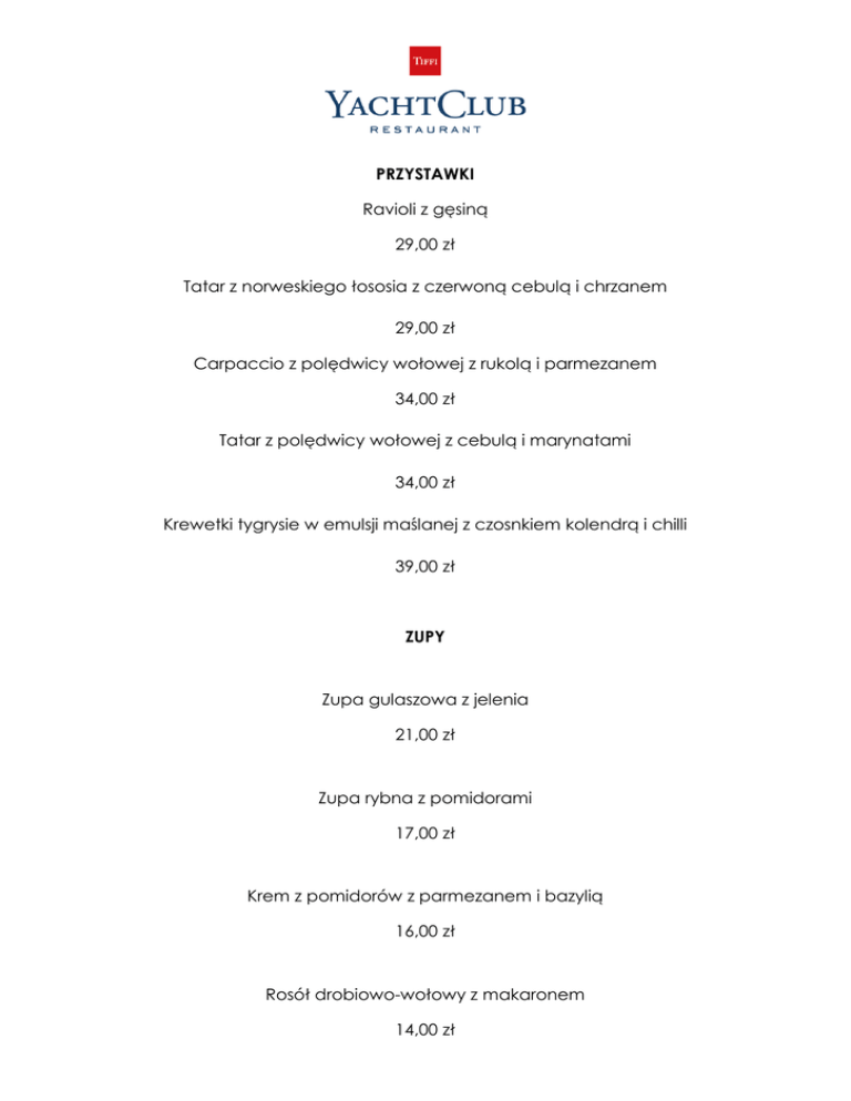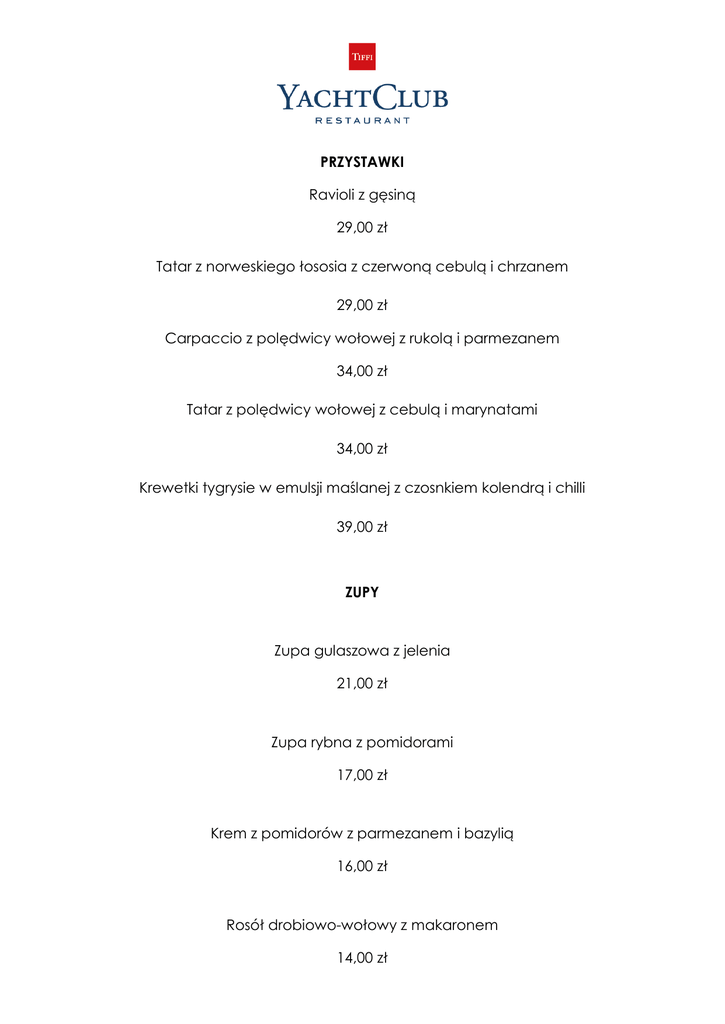 PRZYSTAWKI Ravioli z gęsiną 29,00 zł Tatar z norweskiego łososia z czerwoną cebulą i chrzanem 29,00 zł Carpaccio z polędwicy wołowej z rukolą i parmezanem 34,00 zł Tatar z polędwicy wołowej z cebulą i marynatami 34,00 zł Krewetki tygrysie w emulsji maślanej z czosnkiem kolendrą i chilli 39,00 zł ZUPY Zupa gulaszowa z jelenia 21,00 zł Zupa rybna z pomidorami 17,00 zł Krem z pomidorów z parmezanem i bazylią 16,00 zł Rosół drobiowo-wołowy z makaronem 14,00 zł SAŁATY Carpaccio z buraka z pomarańczą, rukolą, kozim serem, sezamem i dressingiem chałwowym 26,00 zł Sałata z orzechami włoskimi, gruszką, serem gorgonzola i granatem 26,00 zł Sałata Cezar z chrupiącym boczkiem do wyboru z kurczakiem / z krewetkami 24,00 zł / 32,00 zł MAKARONY Penne all’Arrabbiata 27,00 zł Penne z borowikami i szynką parmeńską 29,00 zł Tagliatelle alla Bolognese 30,00 zł DANIA GŁÓWNE Szczupak z puree ziemniaczanym, warzywami sezonowymi i sosem cytrynowym 37,00 zł Filet z sandacza podany z kompozycją warzyw sezonowych i salsą verde 42,00 zł Dorsz na risotto rakowym z salami picante podawany ze szpinakiem 46,00 zł Confitowana gęś podana z sosem tymiankowym na modrej kapuście 42,00 zł Polędwica wieprzowa podana na kalafiorowym puree z pieczonymi ziemniakami, porem i sosem korzennym 36,00 zł Tiffi burger wołowy z frytkami 37,00 zł Sezonowany stek z antrykotu podany z zasmażanymi buraczkami i sosem pieprzowym 45,00 zł Comber jagnięcy z sosem miętowym podany na puree ziemniaczanym aromatyzowanym truflą, z boczniakiem różowym i marynowaną cebulą 59,00 zł Sezonowany stek z polędwicy wołowej podany ze skorzonerą, boczniakiem królewskim i sosem pieprzowym 69,00 zł DODATKI Selekcja sałat z granatem, pomidorem i dressingiem imbirowym 9,00 zł Zielona fasolka 9,00 zł Buraczki zasmażane z jabłkiem 9,00 zł Prażona kasza pęczak z czosnkiem i natką pietruszki 7,00 zł Puree ziemniaczane 9,00 zł Frytki stekowe 9,00 zł Ziemniaki pieczone z rozmarynem i wędzoną papryką 6,00 zł MENU DLA DZIECI Rosół z makaronem 9,00 zł Panierowane kawałki indyka z frytkami i marchewką w miodzie 15,00 zł Tagliatelle z sosem Bolognese 15,00 zł DESERY Selekcja domowych sorbetów 9,00 zł Lody własnego wyrobu z owocami 14,00 zł Kokosowy pudding chia z puree z mango 16,00 zł Beza z musem mascarpone, migdałami i świeżymi owocami 14,00 zł Torcik z musem czekoladowym z chilli 16,00 zł Delikatny sernik z konfiturą malinową i bezikami 16,00 zł Tarta limonkowa 16,00 zł Ciasto dnia 14,00 zł NAPOJE ZIMNE Cisowianka Perlage / Naturalna 300 ml 6,00 zł 700 ml 12,00 zł San Pellegrino / Aqua Panna 250 ml 8,00 zł 750 ml 19,00 zł Coca-Cola, Fanta, Sprite, Tonic 200 ml 7,00 zł Nestea 250 ml 7,00 zł Soki owocowe Cappy 200 ml 7,00 zł Sok ze świeżych pomarańczy / grejpfrutów 16,00 zł NAPOJE GORĄCE Kawa Ristretto 8,00 zł Espresso 8,00 zł Espresso Doppio 9,00 zł Café Crème 9,00 zł Cappuccino 12,00 zł Latte Macchiato 14,00 zł Bezkofeinowa 9,00 zł Herbata “Ronnefeldt” English Breakfast Earl Grey Green Dragon – herbata zielona Morgentau – herbata zielona z mango Cream Orange – rooibos z nutą pomarańczy i wanilii Sweet Berries – herbata owocowa Mint & fresh – herbata miętowa Gorąca Czekolada 12,00 zł 14,00 zł
